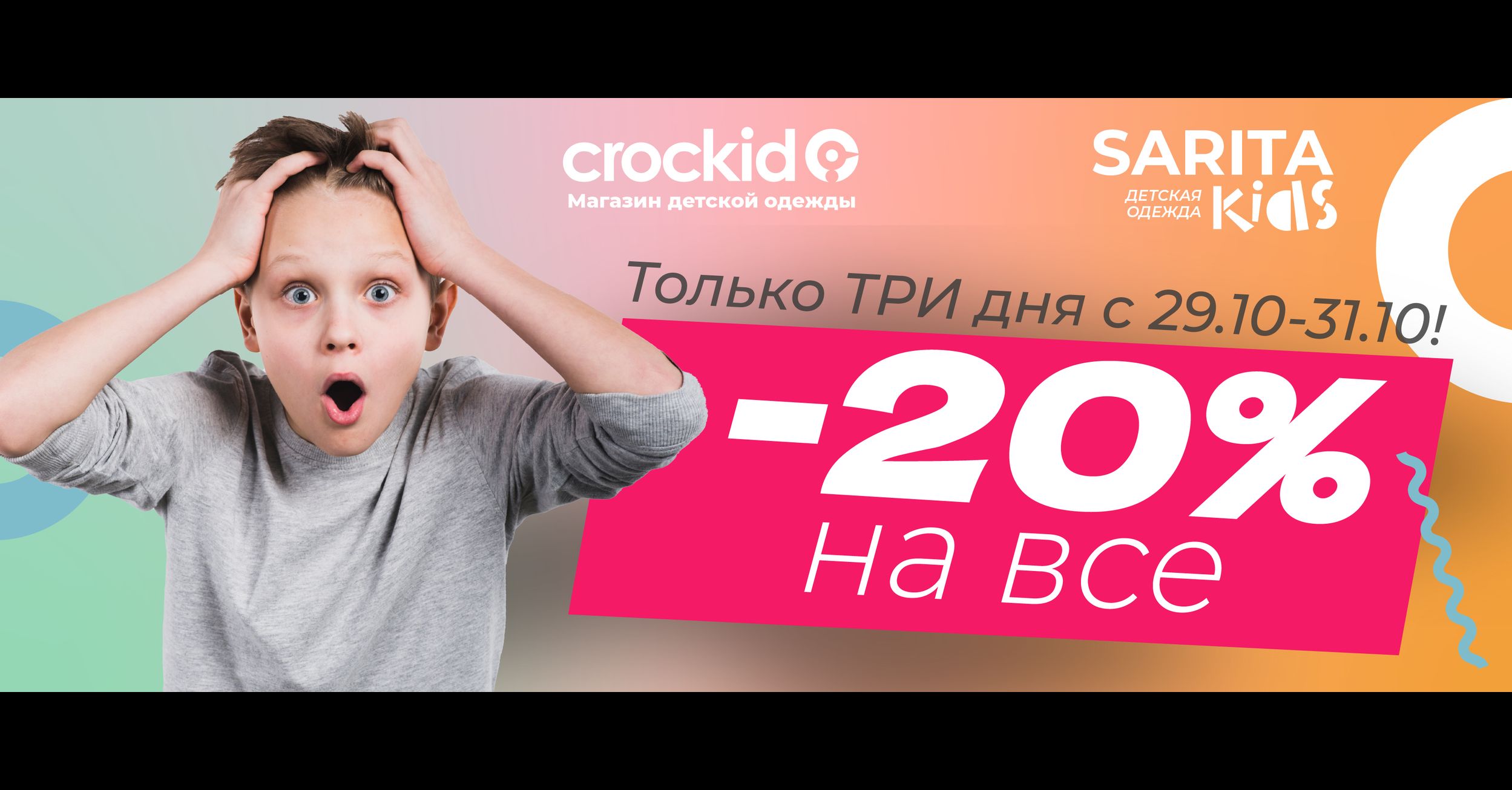 Готовитесь к зиме? У нас отличные новости — только с 29 по 31 октября в магазинах Sarita действует горячая акция «3 дня скидки –20%»! Сейчас самое время заглянуть к нам за уютной одеждой, стильными аксессуарами и свежими коллекциями для всей семьи.