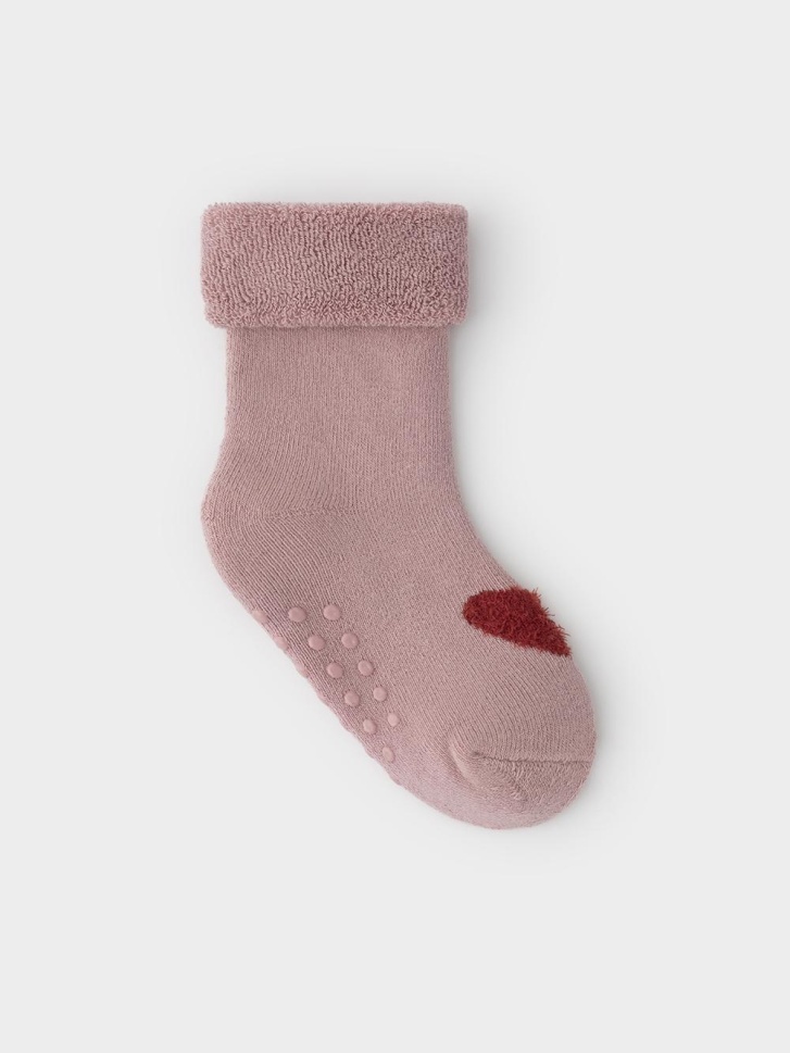 Носки махровые с формованной пяткой и отворотом по краю. На подошве резиновые стопперы. Украшены рисунком. Изделие сохраняет форму и стойкий цвет после многочисленных стирок.