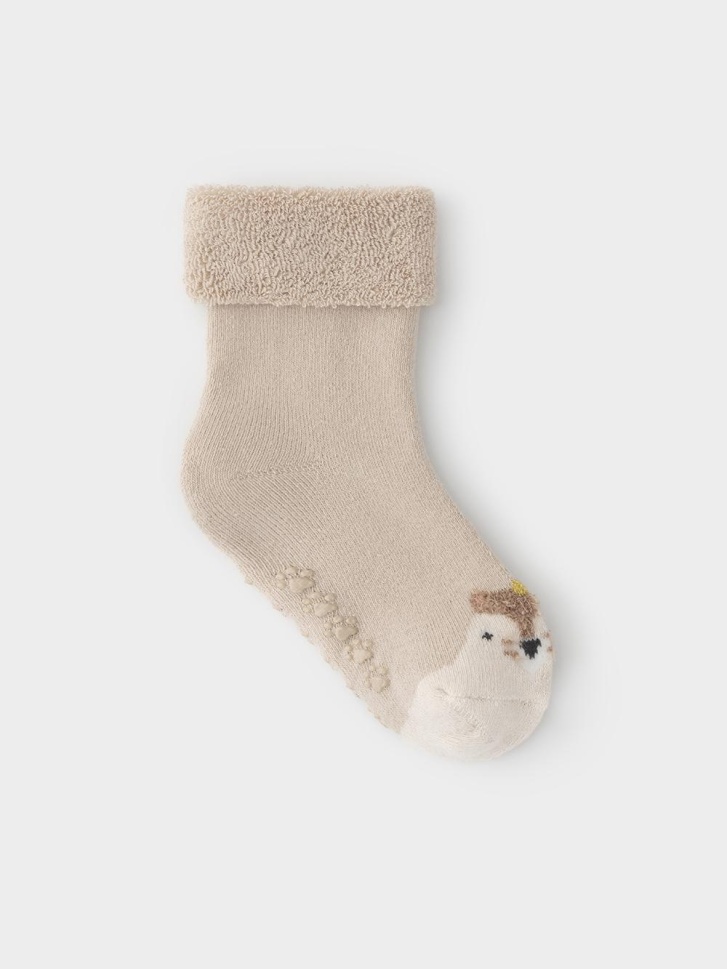 Носки махровые с формованной пяткой и отворотом по краю. На подошве резиновые стопперы. Украшены рисунком. Изделие сохраняет форму и стойкий цвет после многочисленных стирок.