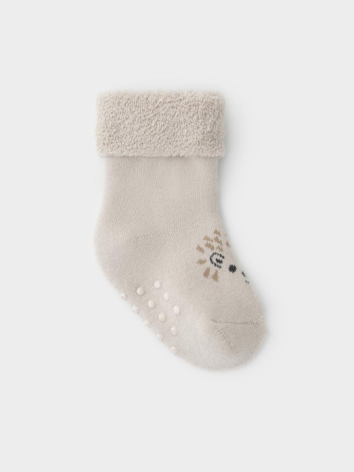 Носки махровые с формованной пяткой и отворотом по краю. На подошве резиновые стопперы. Украшены рисунком. Изделие сохраняет форму и стойкий цвет после многочисленных стирок.