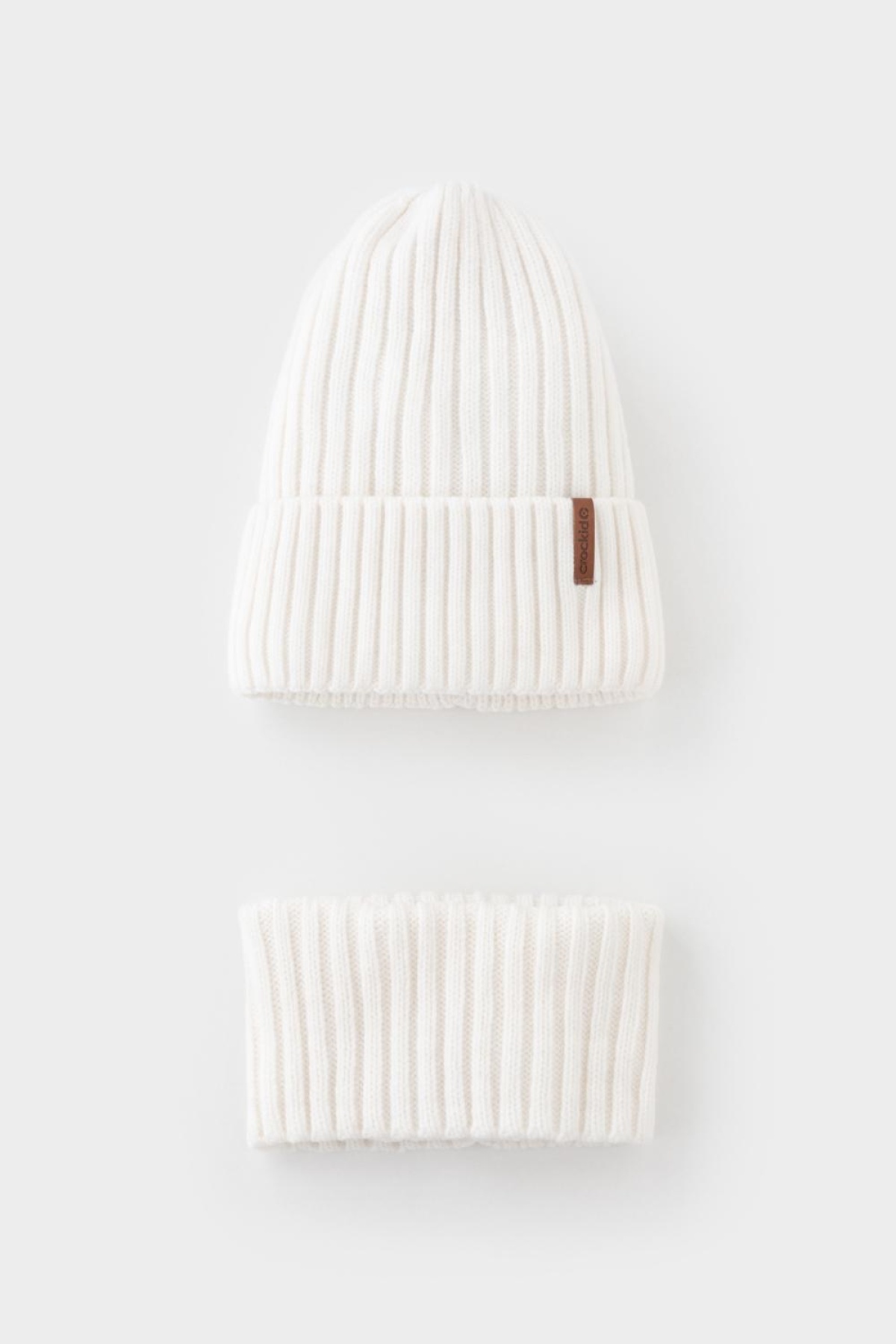 Комплект зимний детский: шапка и снуд из полушерсти. Тёплая вязаная шапка с отворотом на подкладе из флиса. Украшена нашивкой из искусственной кожи. Узкий снуд без оборотов вокруг шеи. Изделие сохраняет форму и стойкий цвет после многочисленных стирок.