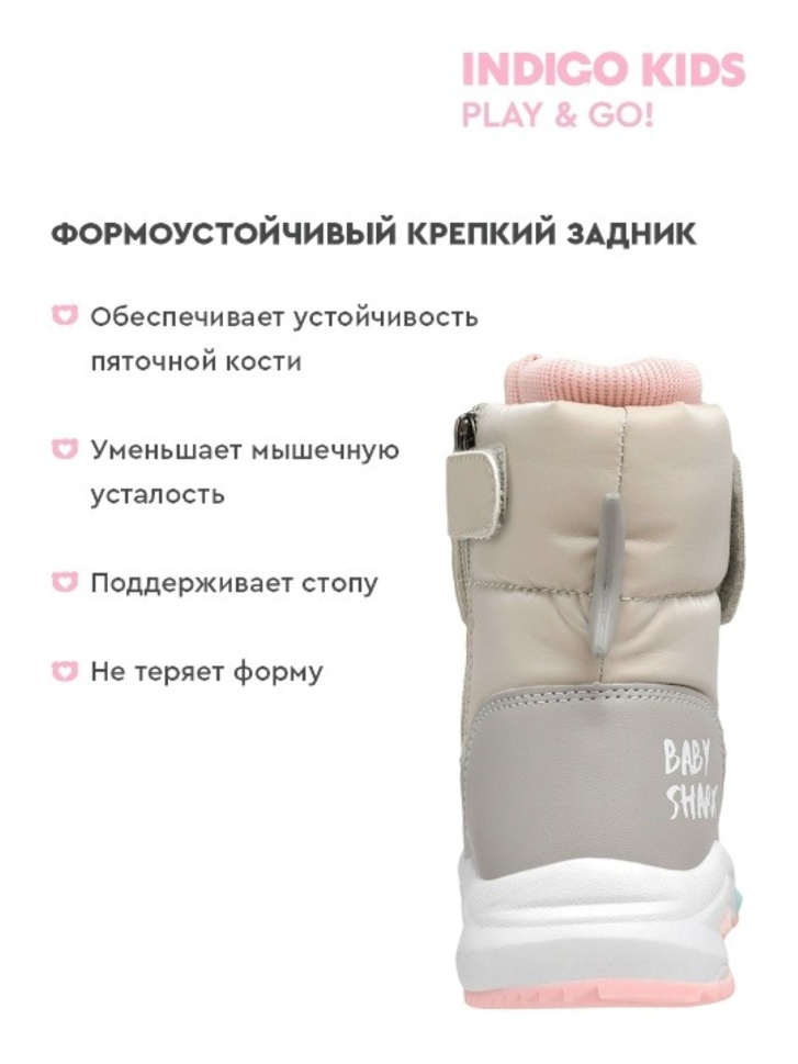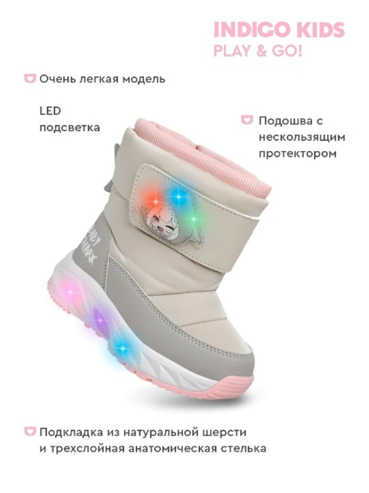 Стильные зимние LED сапоги для девочек от бренда INDIGO KIDS - идеальный вариант для зимы. Уникальные ботинки, которые привлекут внимание юной модницы, мерцающими огнями и милой акулой. Сапоги изготовлены с использованием мембранных материалов, которые не пропускают влагу внутрь обуви, выводит ее наружу и позволяют ногам дышать. ПОД СТЕЛЬКОЙ ШЕРСТЯНОЙ МЕХ - ПОДКЛАД ЦЕЛЬНЫЙ ШЕРСТЯНОЙ ЧУЛОК! Это обеспечивает сохранение тепла в течение длительного времени. Подклад из шерсти и съемная инновационная шерстяная стелька с фольгой создают оптимальный микроклимат внутри. Стелька анатомической формы с подсводником состоит из трех слоев - гигроскопический материал из вспененного материала ЭВА в средней части стельки обеспечивает циркуляцию воздуха, обладает абсорбирующими свойствами и создает отличный амортизационный эффект. Верхний шерстяной слой стельки обладает высокими антибактериальными свойствами, сохраняет ноги ребенка в сухости. Нижний слой стельки из фольги надолго сохраняет тепло. Высокая износостойкая подошва