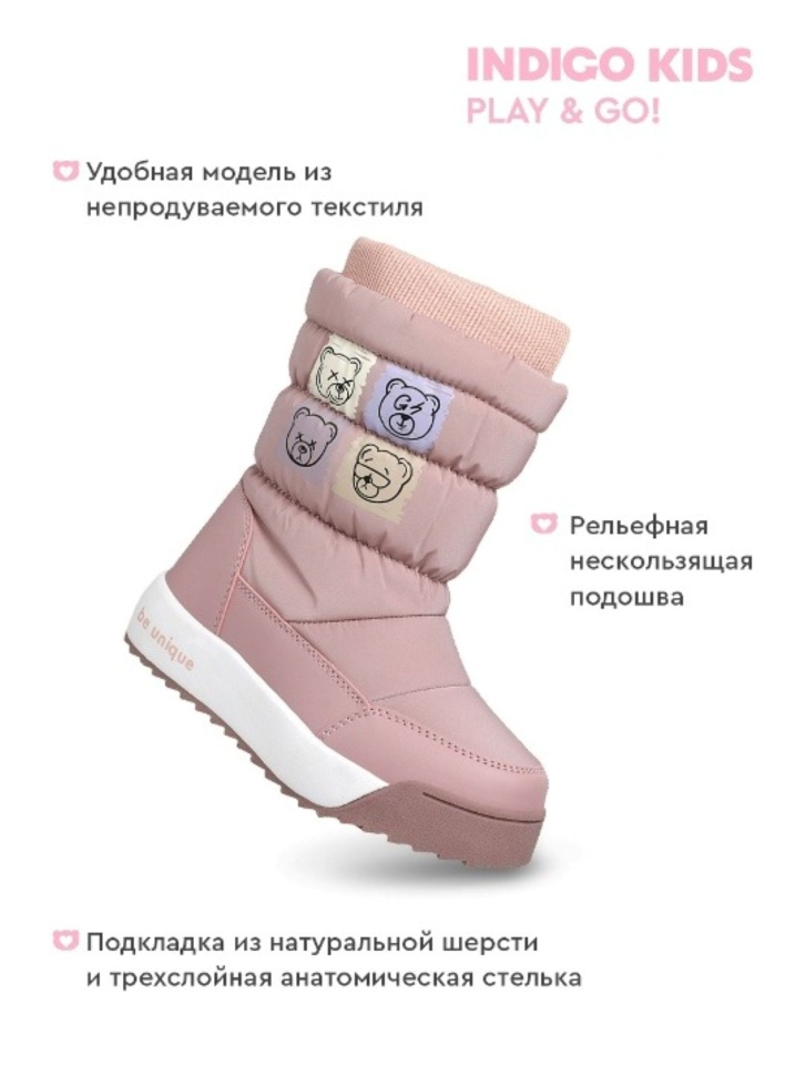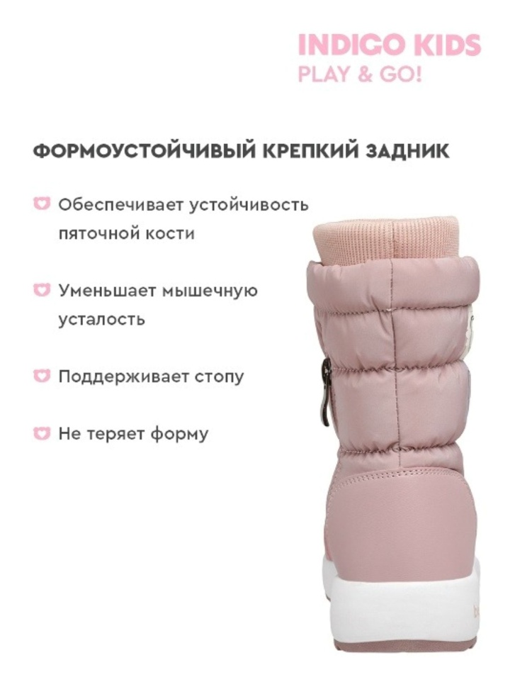 Красивые и стильные зимние сапожки от бренда INDIGO KIDS, которые понравятся современным, юным модницам. Великолепный выбор для холодного времени года. Материал верха "дышащий" текстиль с характеристиками - water resistant (водонепроницаемость) с водоотталкивающей пропиткой, не продувается ветром, обладает высокой влагоустойчивостью со вставками из высококачественной экокожи. Подклад из шерсти и съемная инновационная шерстяная стелька с фольгой создают оптимальный микроклимат внутри. Стелька анатомической формы с подсводником состоит из трех слоев - гигроскопический материал средней части стельки обеспечивает циркуляцию воздуха, обладает абсорбирующими свойствами и создает отличный амортизационный эффект. Верхний шерстяной слой стельки обладает высокими антибактериальными свойствами, сохраняет ноги ребенка в сухости. Нижний слой стельки из фольги надолго сохраняет тепло. Подошва из материала ЭВА - легкая, при этом прочная и износостойкая. Рельефный протектор обеспечивает хорошее сцепление и препятствует сколь