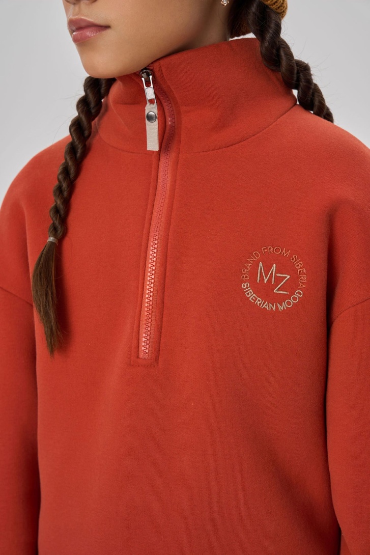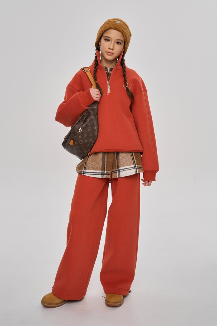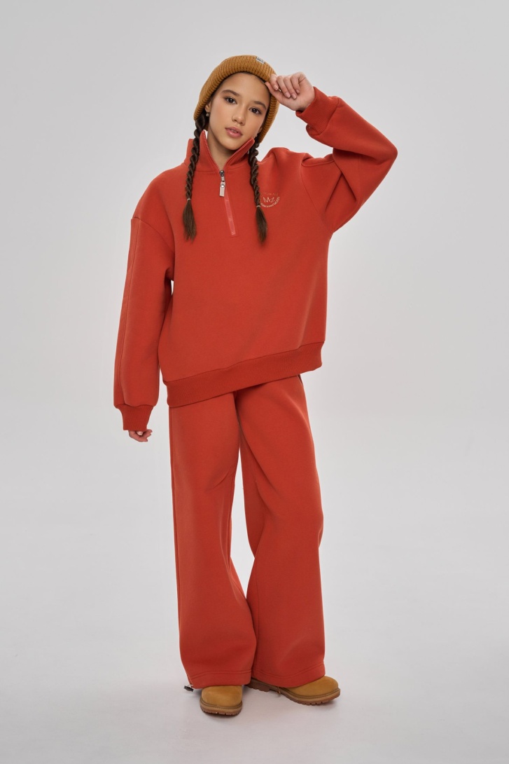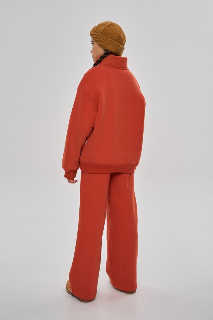 Костюм свободного кроя, выполнен из премиального футера с начесом. Состоит из свитшота с воротником-стойкой на молнии и брюк-палаццо с регулируемой затяжкой по низу. Дополнен брендированной вышивкой.
