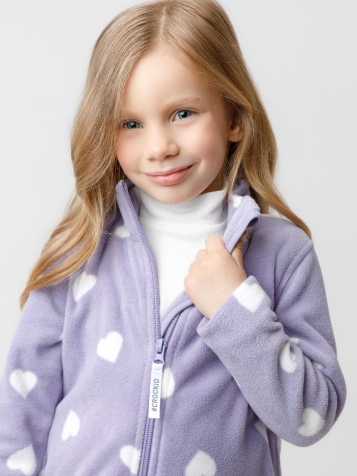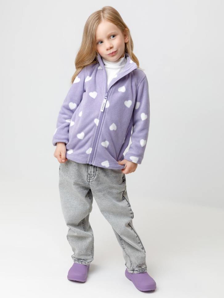 Флисовая куртка для девочки. У изделия высокий воротник и застёжка на молнию с мягкой защитой шеи и подбородка. По бокам два кармана. Оригинальная набивка выполнена из стойких гипоаллергенных текстильных красителей. Куртка сохраняет цвет и форму после многократных стирок.