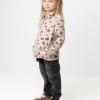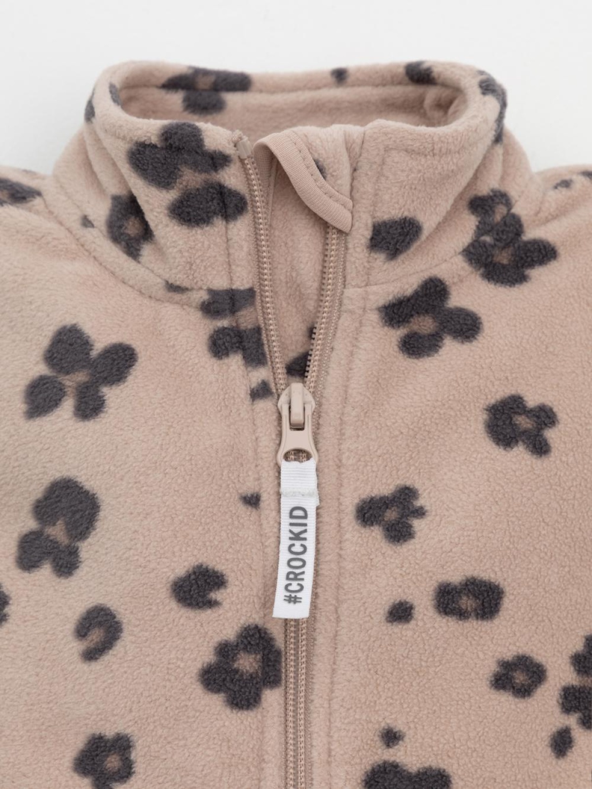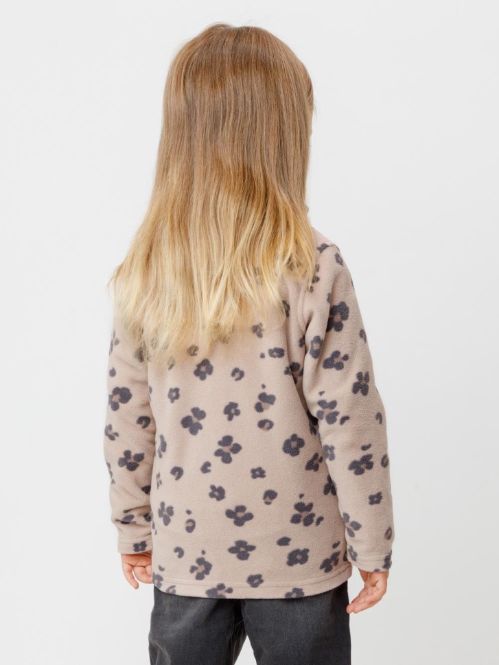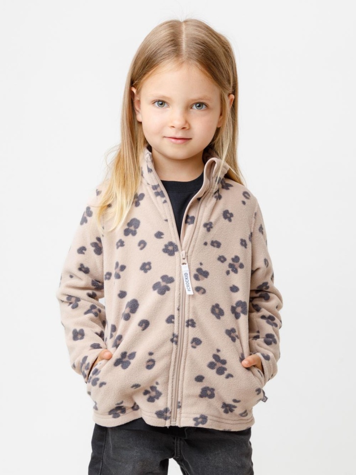 Флисовая куртка для девочки. У изделия высокий воротник и застёжка на молнию с мягкой защитой шеи и подбородка. По бокам два кармана. Оригинальная набивка выполнена из стойких гипоаллергенных текстильных красителей. Куртка сохраняет цвет и форму после многократных стирок.