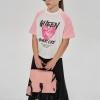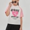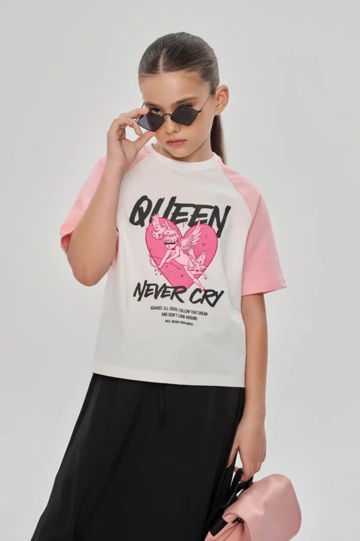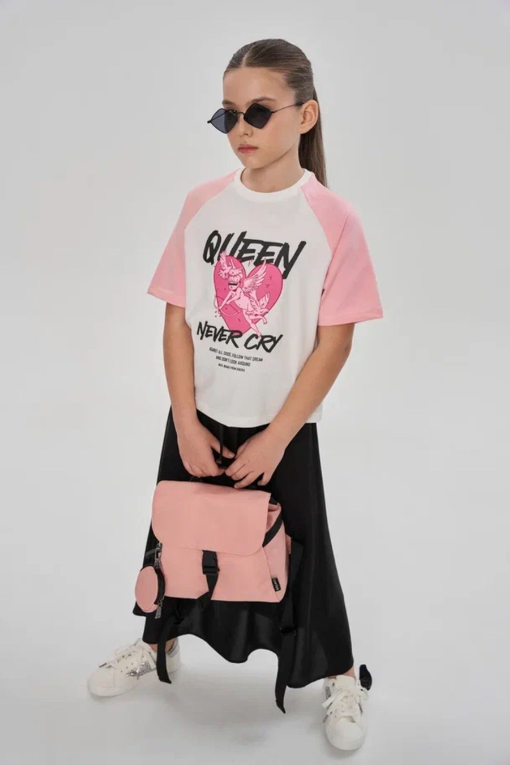 Футболка свободного кроя, чуть укорочена, с рукавом "реглан". Выполнена из эластичного хлопкосодержащего трикотажа (кулирка с лайкрой SilkTouch). На переде оформлена дизайнерскими принтами. Горловина из трикотажа в мелкий рубчик.