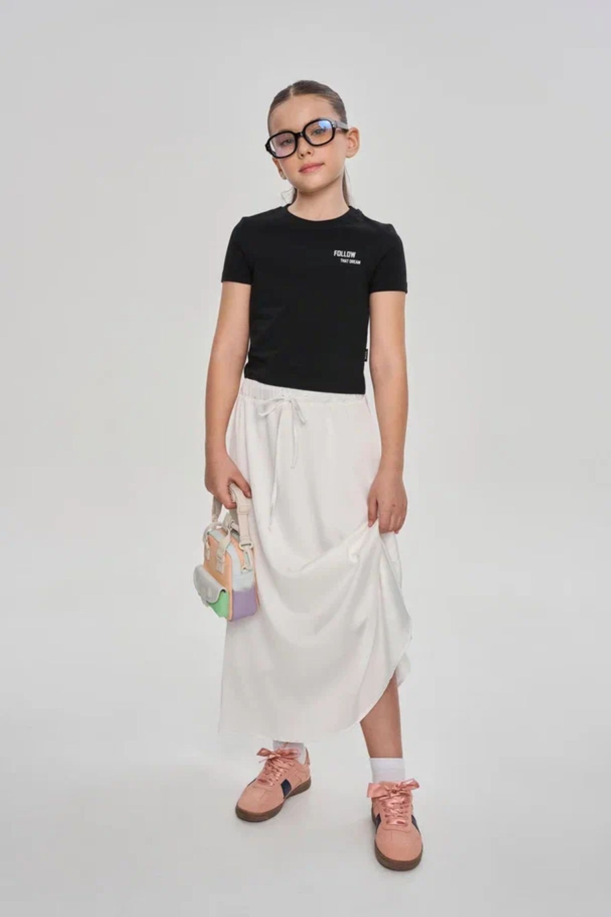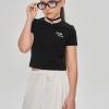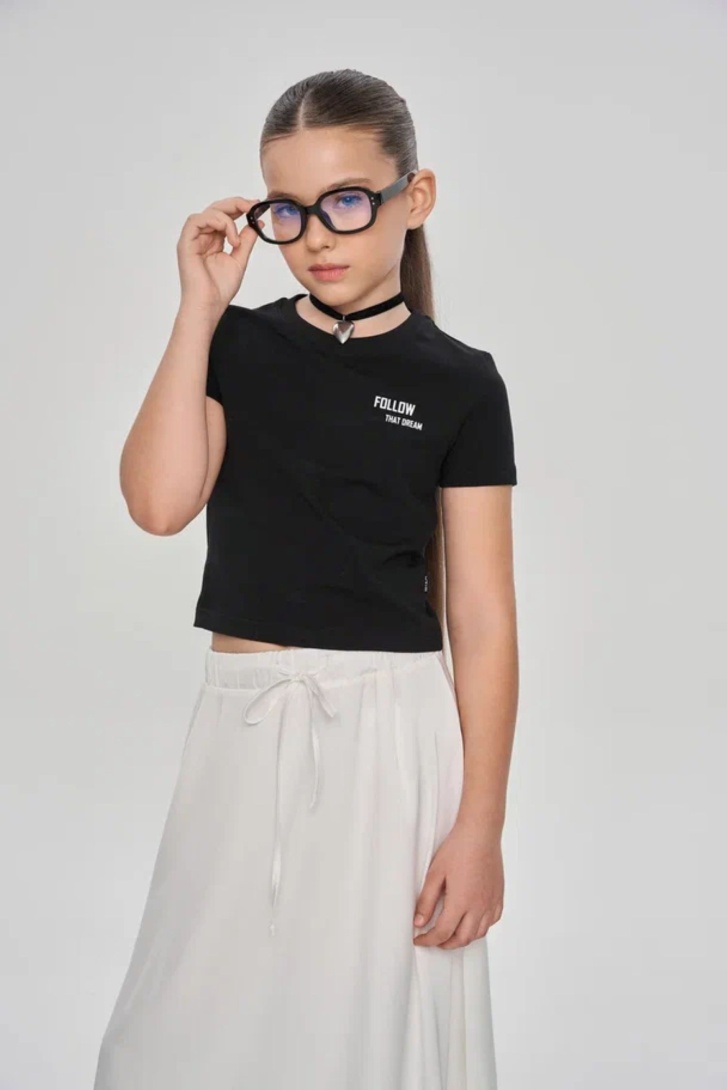 Укороченная футболка прилегающего кроя с небольшим принтом на переде. Выполнена из эластичного хлопкосодержащего трикотажа (кулирка с лайкрой SilkTouch).