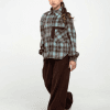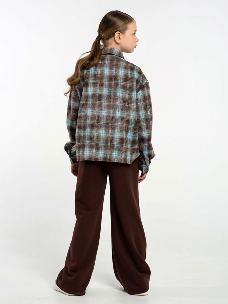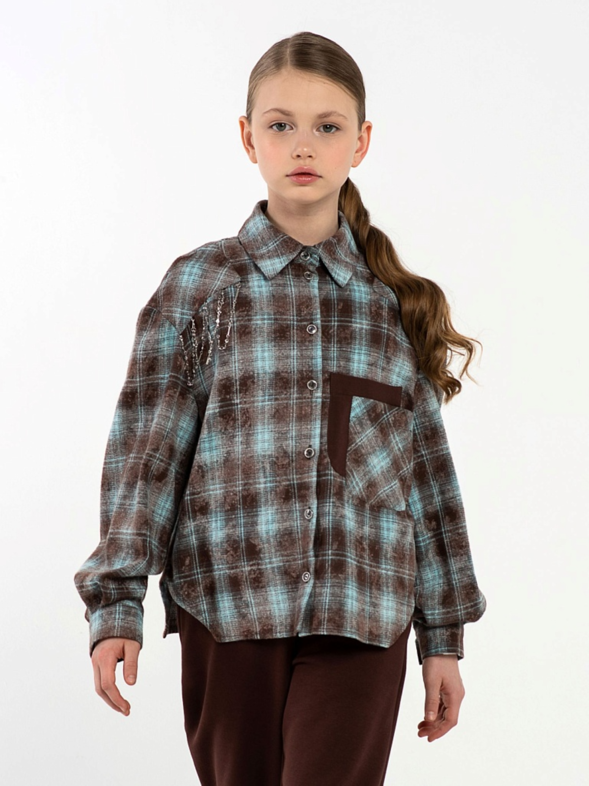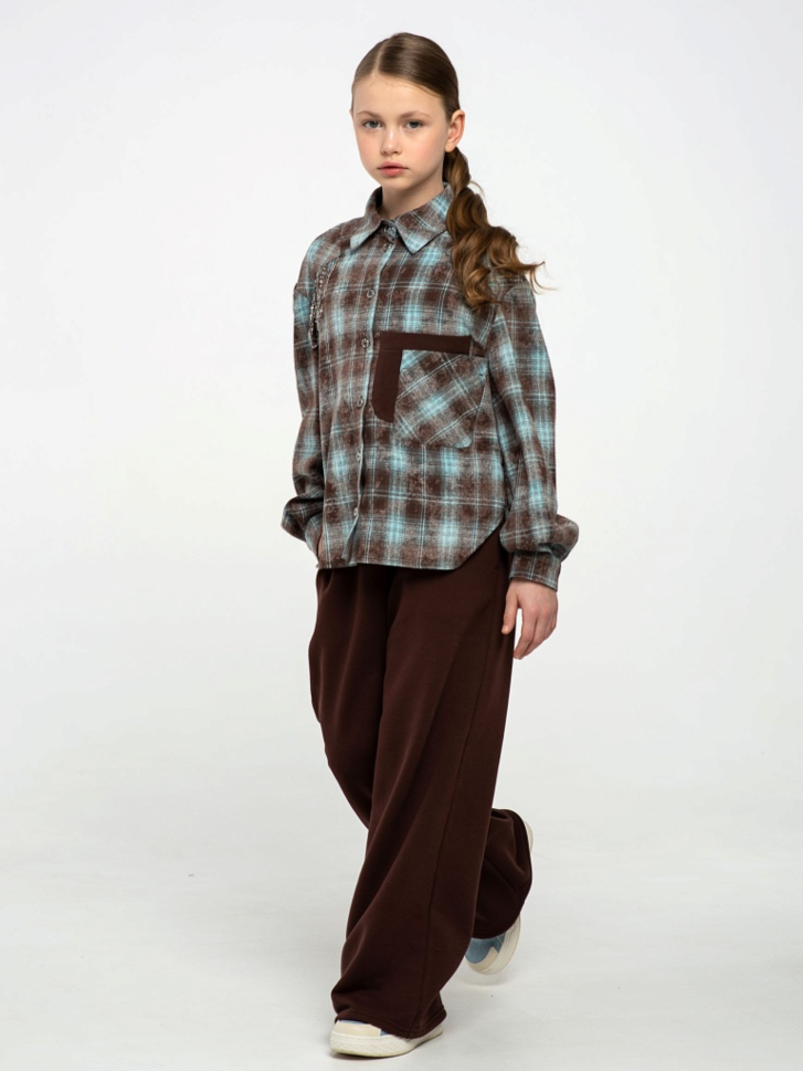 Рубашка в клетку в оттенках глубокого коричневого и холодного голубого — необычно, стильно, с ноткой ретро-футуризма. Идеально сочетается с джинсами, трендовыми широкими штанами и даже юбками. Модель свободного кроя — можно носить расстегнутой поверх футболки или заправлять; длинные рукава с манжетами на пуговицах — можно закатывать, чтобы добавить дерзости.