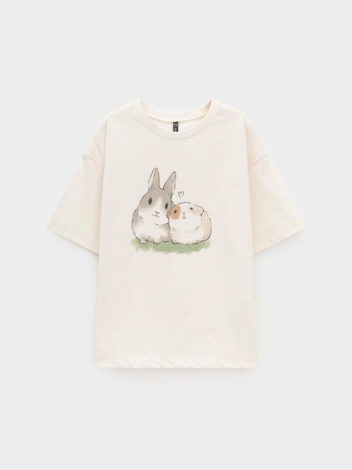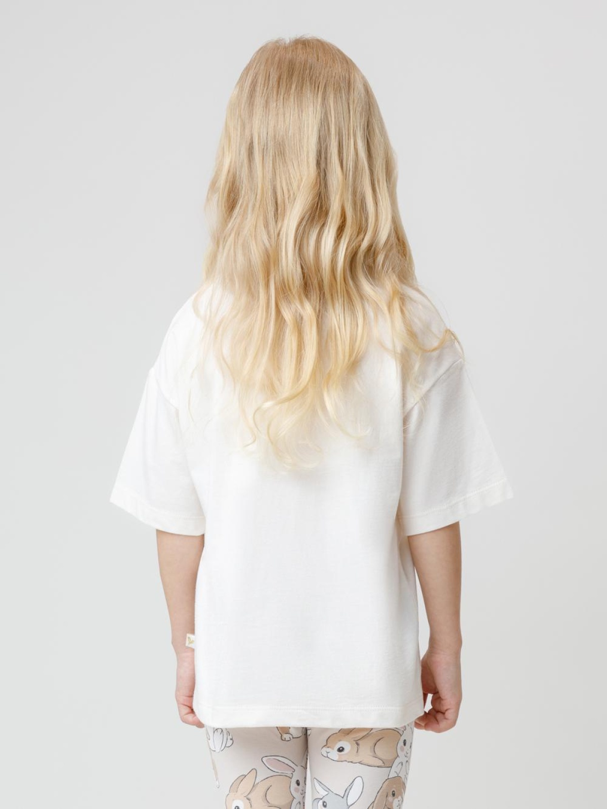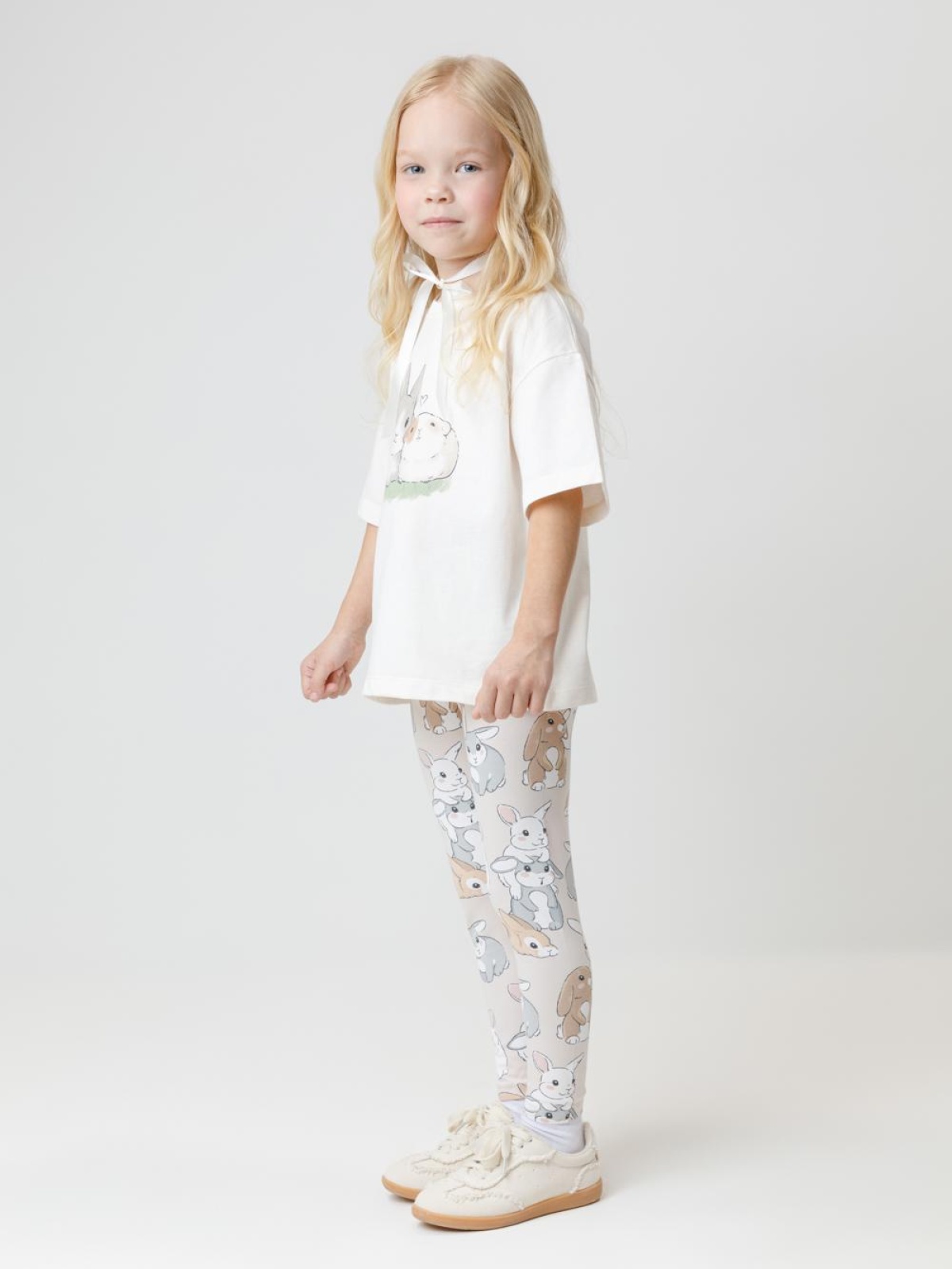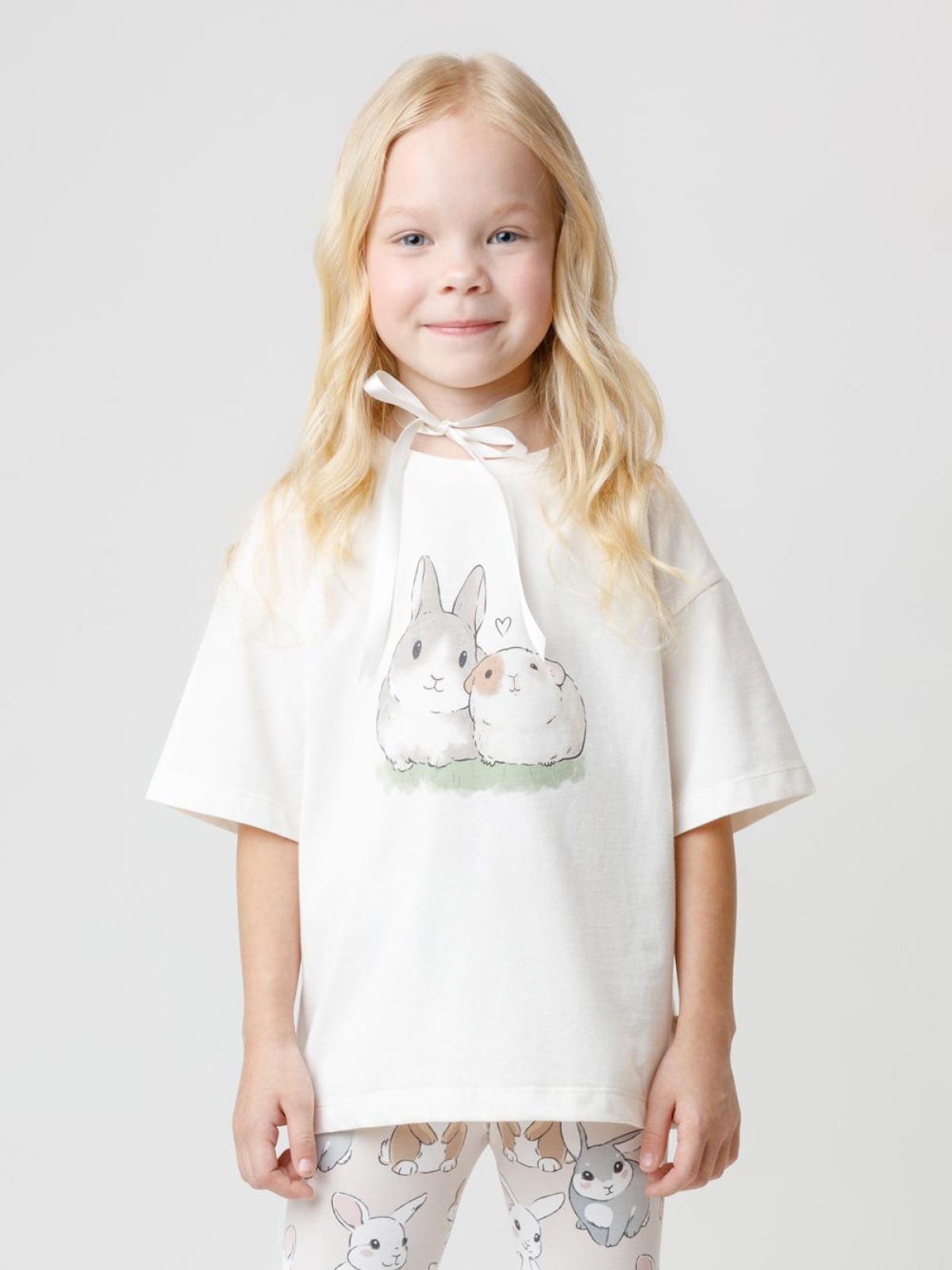 Футболка для девочки из гладкого трикотажа, произведённого из высококачественного натурального хлопка. Застёгивается на спине на кнопки в размерах 92 и 98. Оригинальный принт выполнен из стойких текстильных гипоаллергенных красителей. Изделие сохраняет цвет и форму после многократных стирок. Все трикотажные полотна производятся в соответствии с нормами швейцарского сертификата ЭкоТекс.