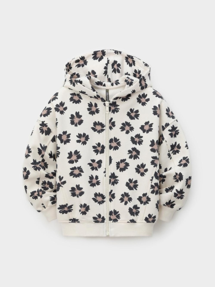 Трикотажная толстовка с капюшоном для девочки. Изготовлена из мягкого футера с оригинальным рисунком. В составе 80% натурального хлопка и 20% полиэстера, при этом полиэстер ввязан внутрь по особой технологии и не соприкасается с кожей. Застёгивается на молнию. Эластичные манжеты и пояс выполнены из полотна в рубчик. Изделие сохраняет цвет и форму после многократных стирок. Все трикотажные полотна производятся в соответствии с нормами швейцарского сертификата ЭкоТекс.