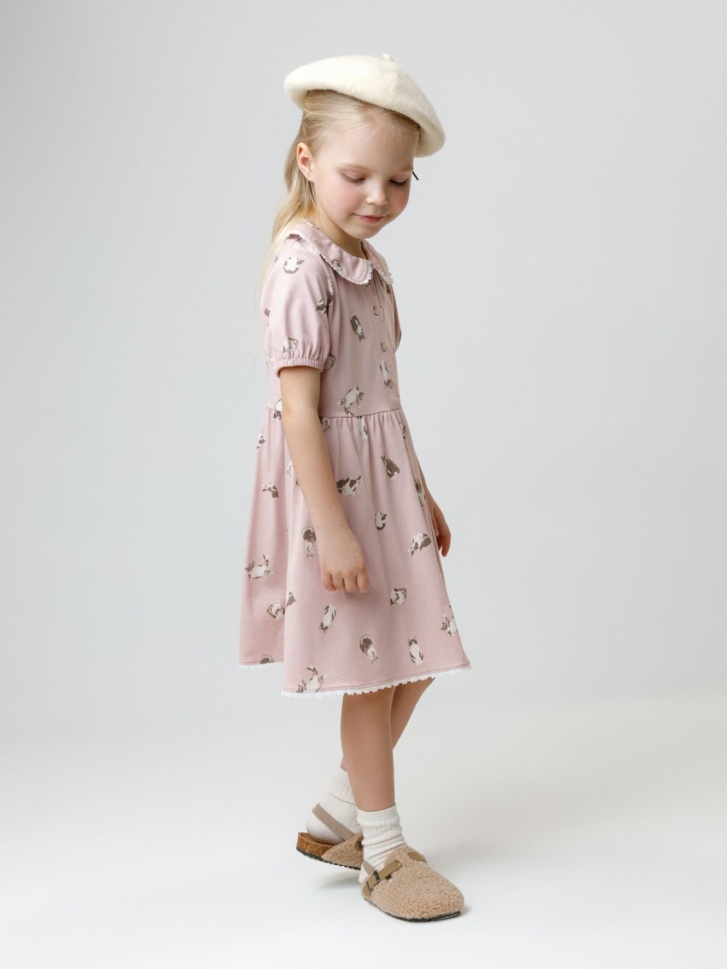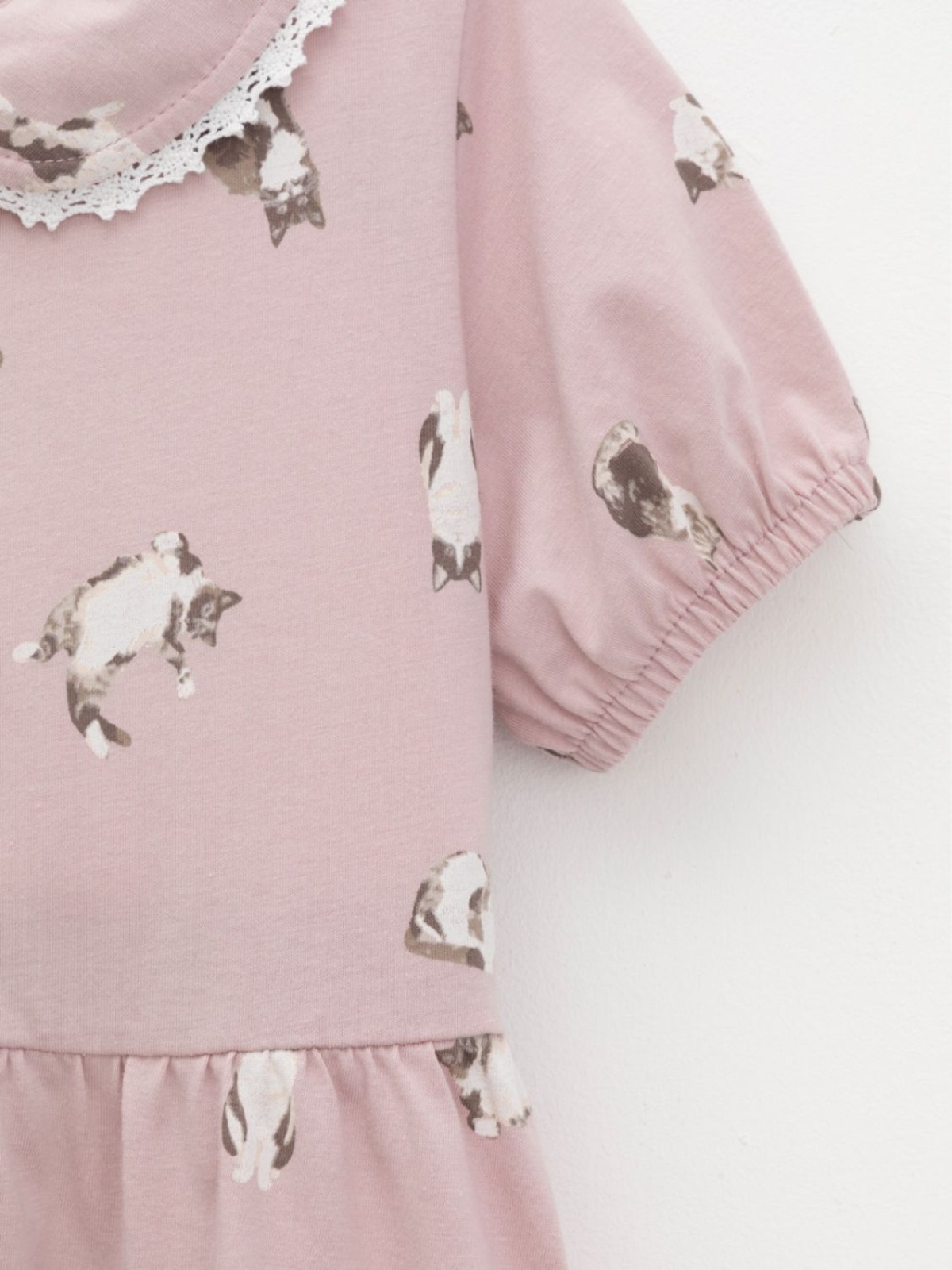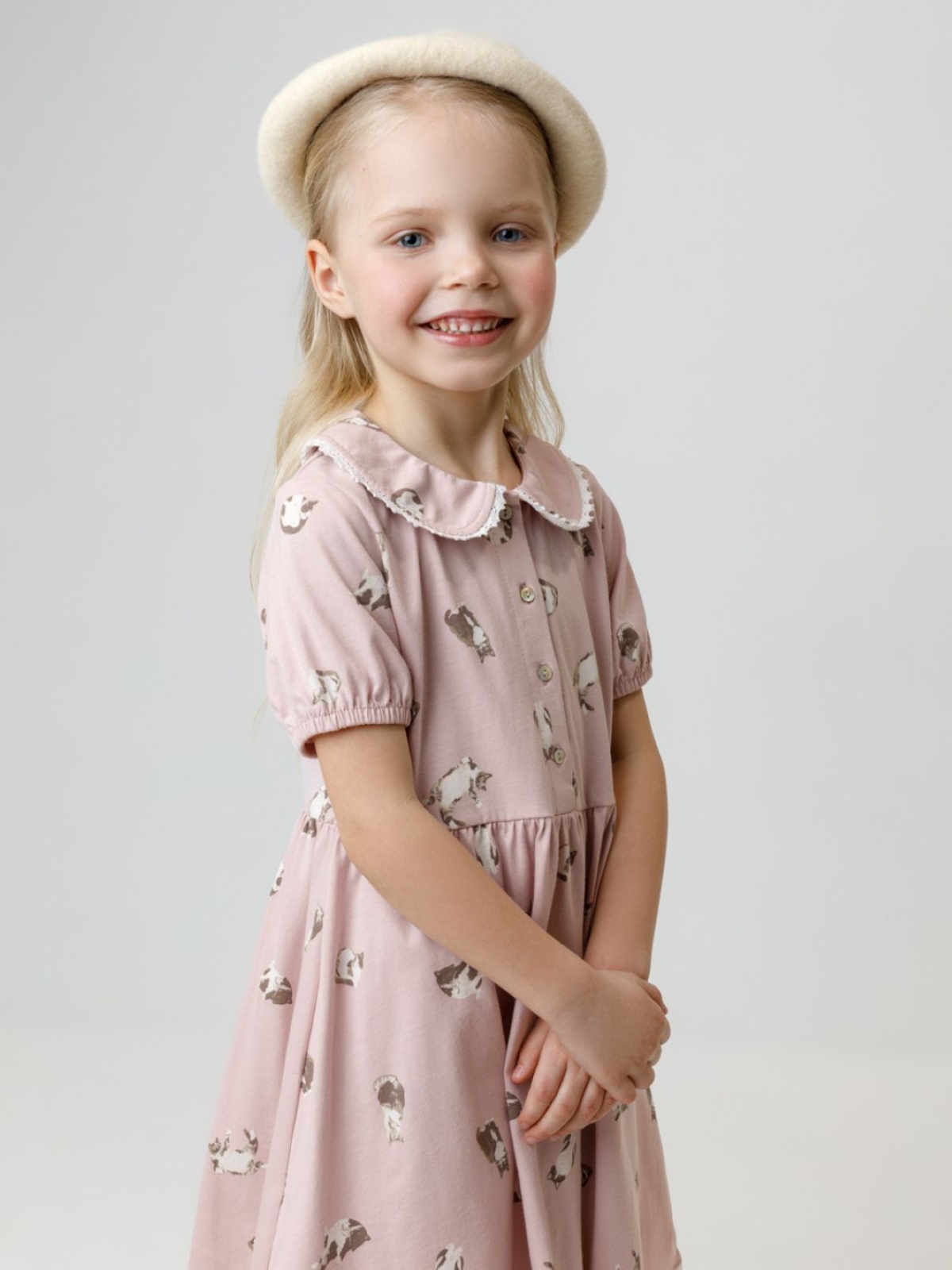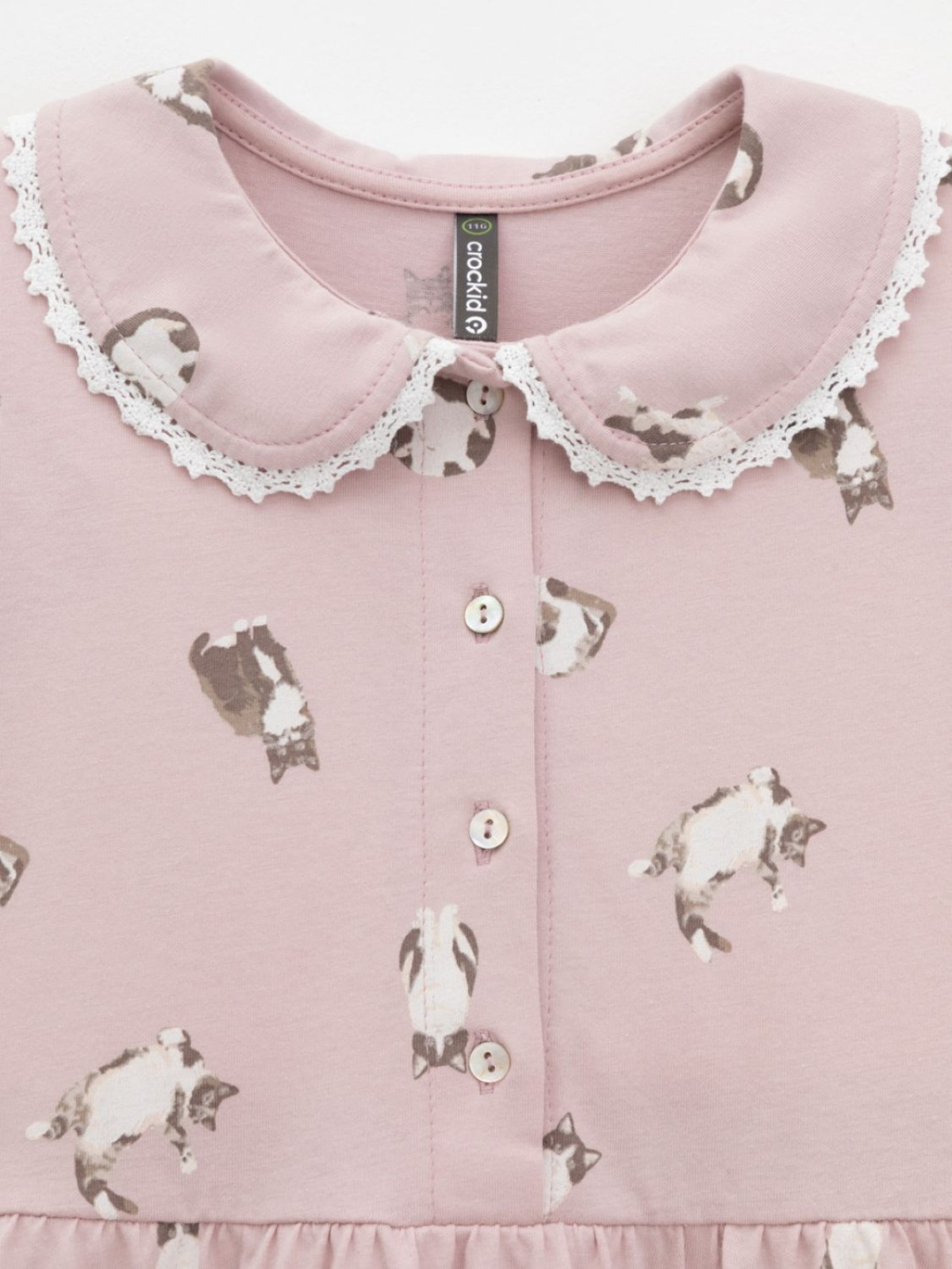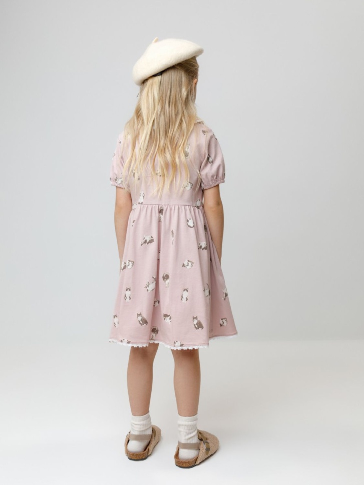 Платье для девочки с короткими рукавами из высококачественного гладкого трикотажа. Для удобства одевания платье застёгивается на пуговицы спереди. Украшено кружевом. Платье сохраняет форму и стойкий цвет после многочисленных стирок и идеально подходит на каждый день. Все трикотажные полотна производятся в соответствии с нормами швейцарского сертификата ЭкоТекс.