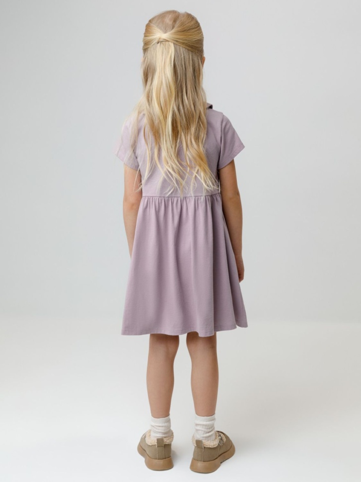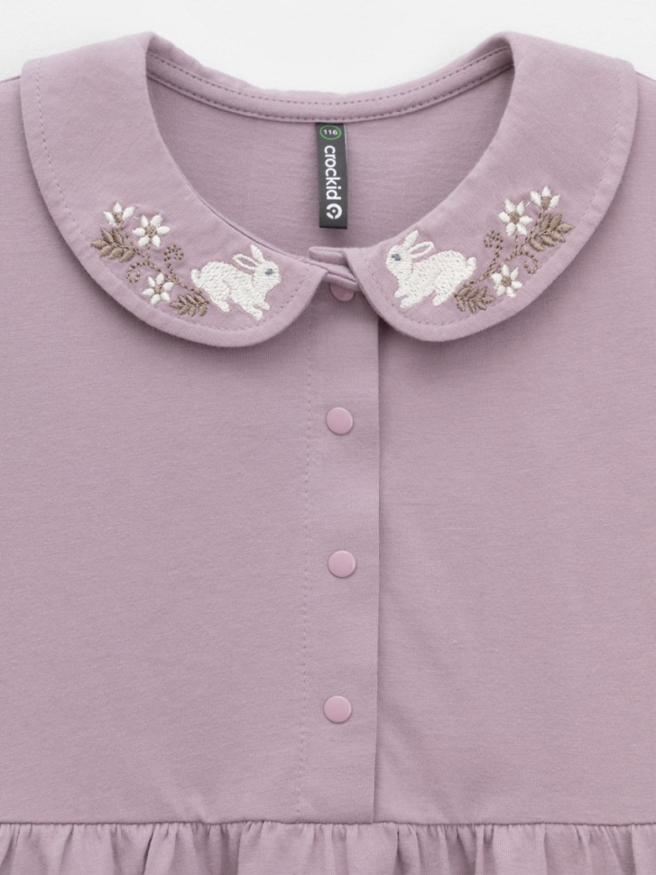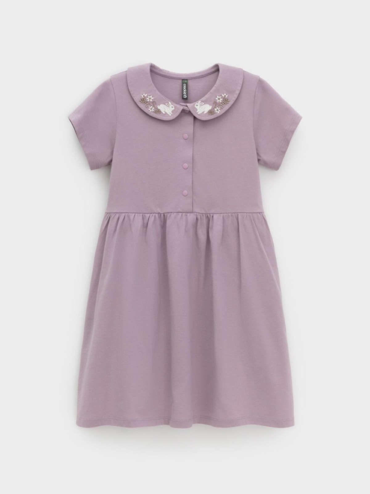 Платье для девочки с короткими рукавами из гладкого хлопкового трикотажа. Украшено вышивкой на воротничке. Для удобства одевания спереди застёгивается на кнопки. Платье сохраняет форму и стойкий цвет после многочисленных стирок и идеально подходит на каждый день. Все трикотажные полотна производятся в соответствии с нормами швейцарского сертификата ЭкоТекс.