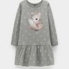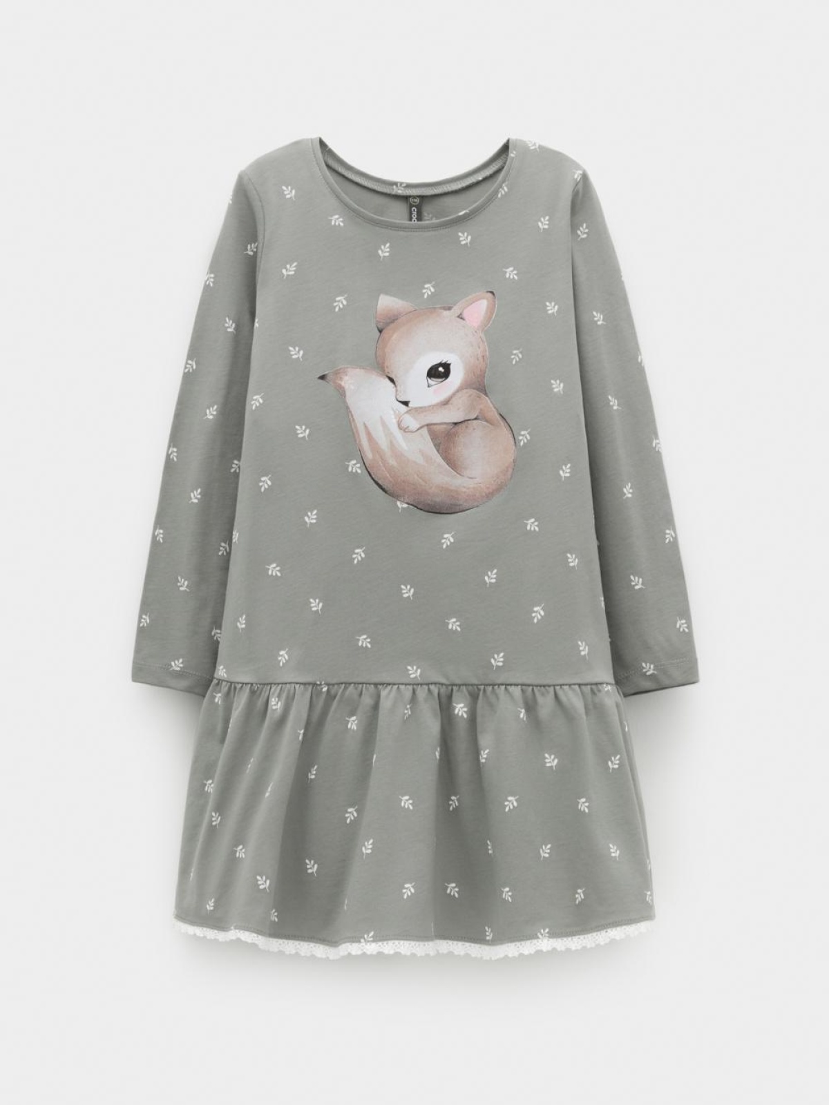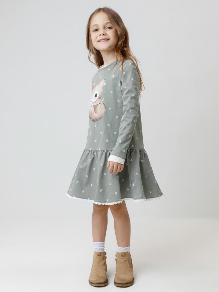 Платье с оборкой для девочки. Изготовлено из высококачественного гладкого трикотажа, произведённого из натурального хлопка. Застёгивается на кнопки в размерах 92 и 98. Оригинальный рисунок выполнен из стойких текстильных гипоаллергенных красителей. Изделие сохраняет цвет и форму после многократных стирок. Все трикотажные полотна производятся в соответствии с нормами швейцарского сертификата ЭкоТекс.