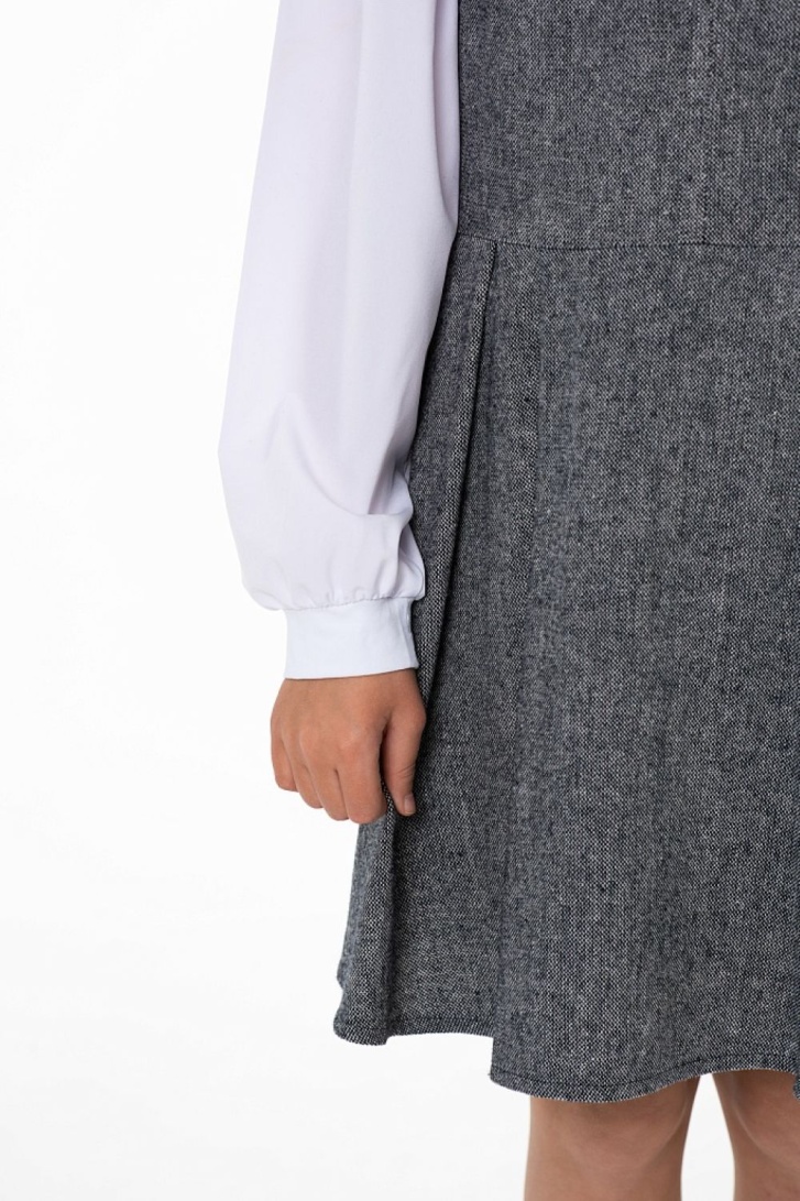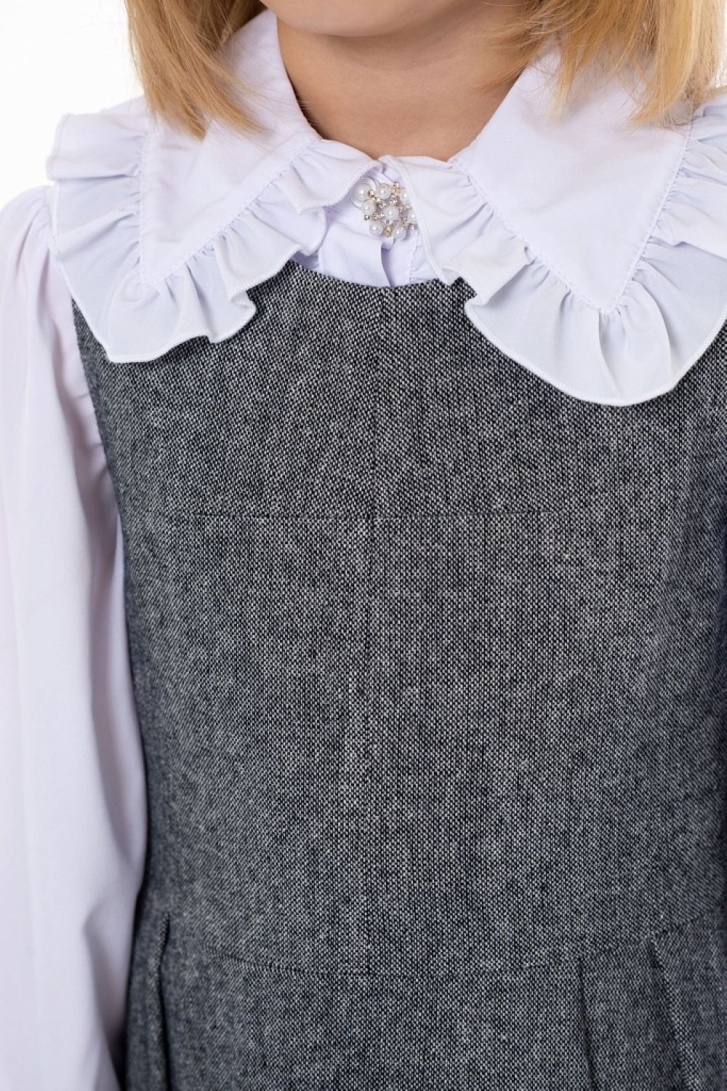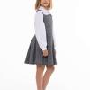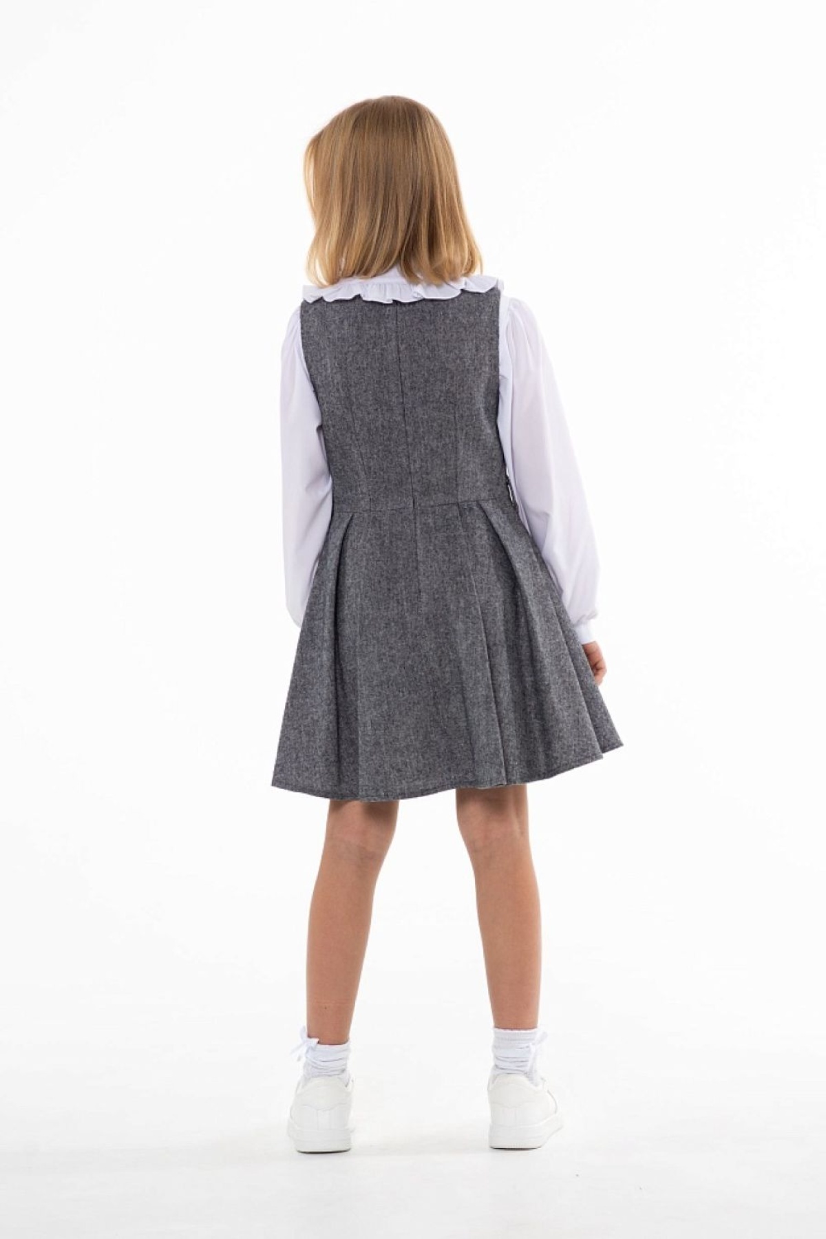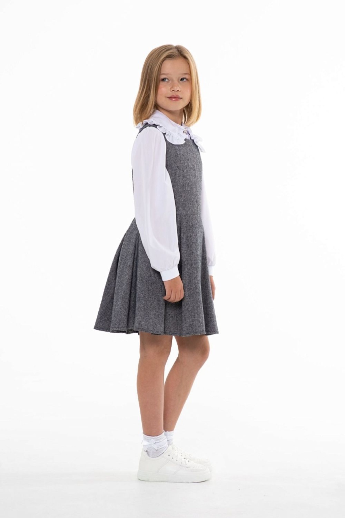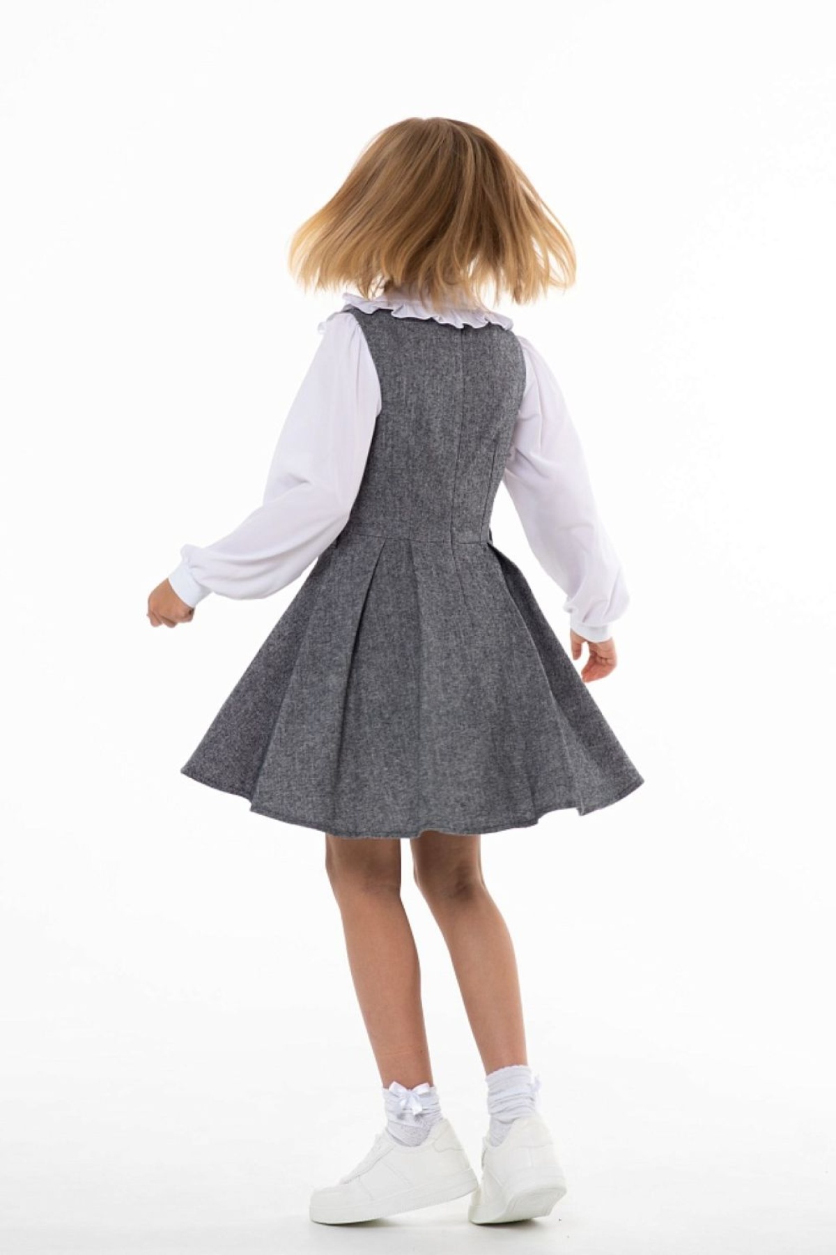 Серый школьный сарафан для девочек выполнен из красивого фактурного полотна серо-серебристого оттенка - современный смесовый твид - плотный, прочный и теплый, состав: 40% акрил, 30% полиэфир, 25% хлопок, 5% шерсть. Гораздо мягче и нежнее к коже, чем его предшественники из 100% шерсти. Не колет и не вызывает аллергии. Ткань легкая, кожа в ней дышит, а изделия не садятся при стирке и не растягиваются. Перед первой ноской рекомендуется прополоскать изделие в кондиционере. Подкладка из вискозы. Лаконичный детский сарафан приталенного силуэта с пышной юбочкой идеально подойдет как для уроков, так и для школьных мероприятий. Благодаря сдержанному дизайну, модель отлично смотрится и с нарядными и с базовыми блузами и водолазками. Интересная стилизация выйдет, если под сарафан надеть классическую рубашку и дополнить образ галстуком: однотонным - чтобы добавить индивидуальности в свои образы; галстук в клетку - чтобы соблюсти школьный клетчатый дресс-код