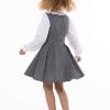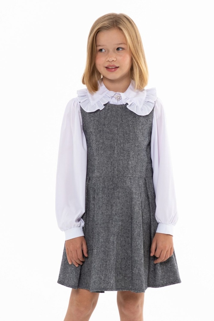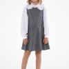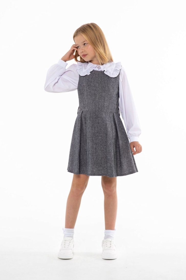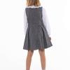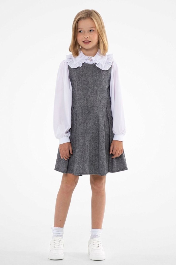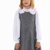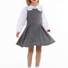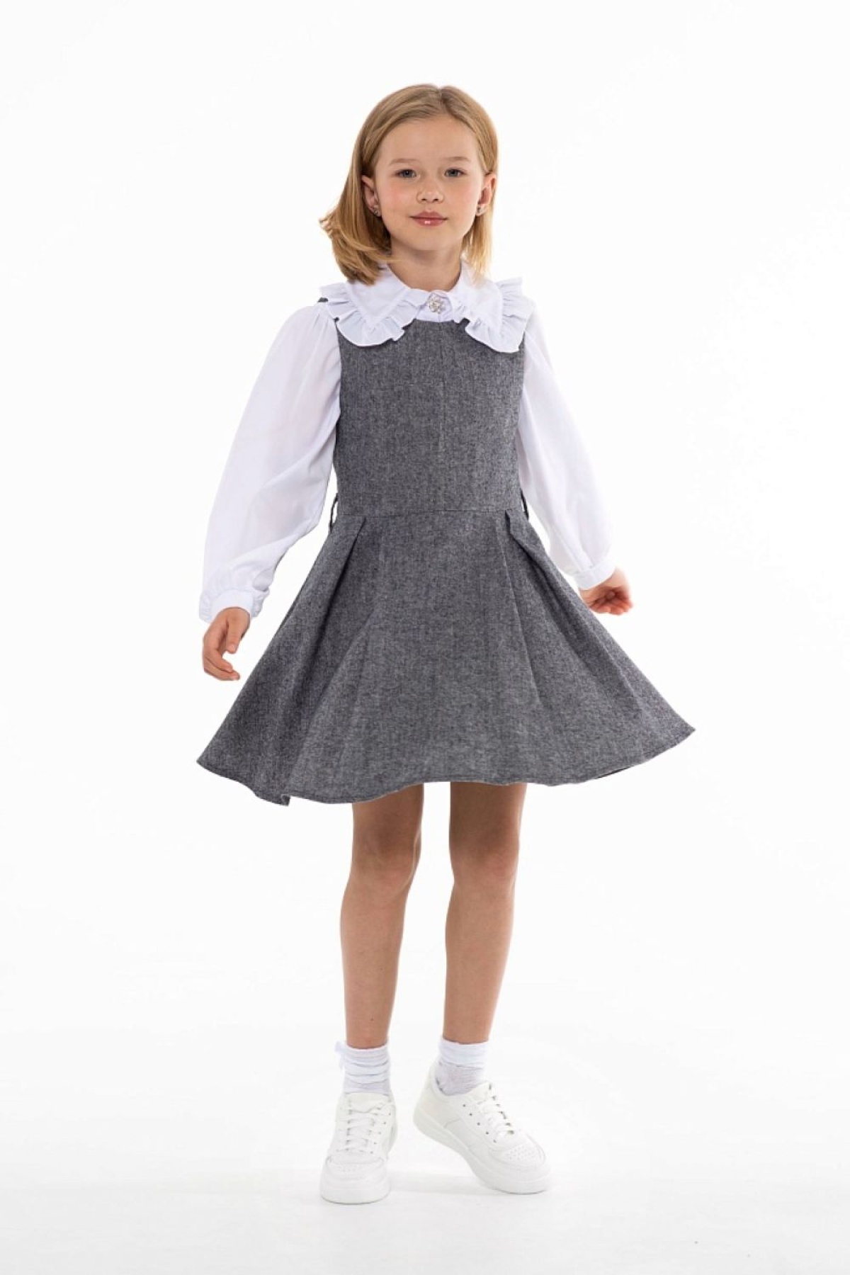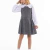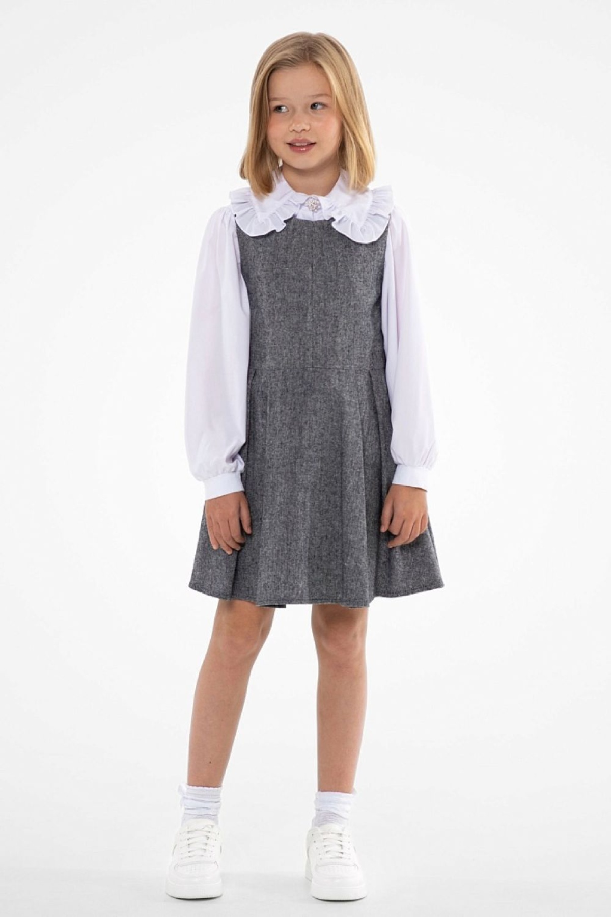 Серый школьный сарафан для девочек выполнен из красивого фактурного полотна серо-серебристого оттенка - современный смесовый твид - плотный, прочный и теплый, состав: 40% акрил, 30% полиэфир, 25% хлопок, 5% шерсть. Гораздо мягче и нежнее к коже, чем его предшественники из 100% шерсти. Не колет и не вызывает аллергии. Ткань легкая, кожа в ней дышит, а изделия не садятся при стирке и не растягиваются. Перед первой ноской рекомендуется прополоскать изделие в кондиционере. Подкладка из вискозы. Лаконичный детский сарафан приталенного силуэта с пышной юбочкой идеально подойдет как для уроков, так и для школьных мероприятий. Благодаря сдержанному дизайну, модель отлично смотрится и с нарядными и с базовыми блузами и водолазками. Интересная стилизация выйдет, если под сарафан надеть классическую рубашку и дополнить образ галстуком: однотонным - чтобы добавить индивидуальности в свои образы; галстук в клетку - чтобы соблюсти школьный клетчатый дресс-код