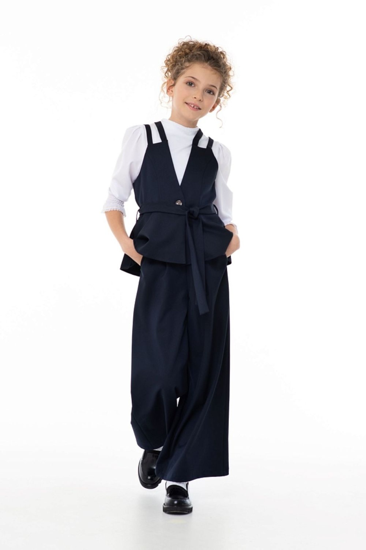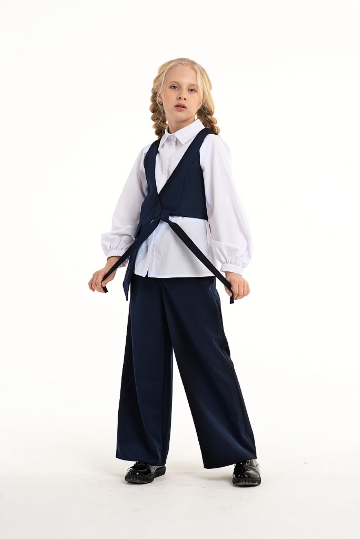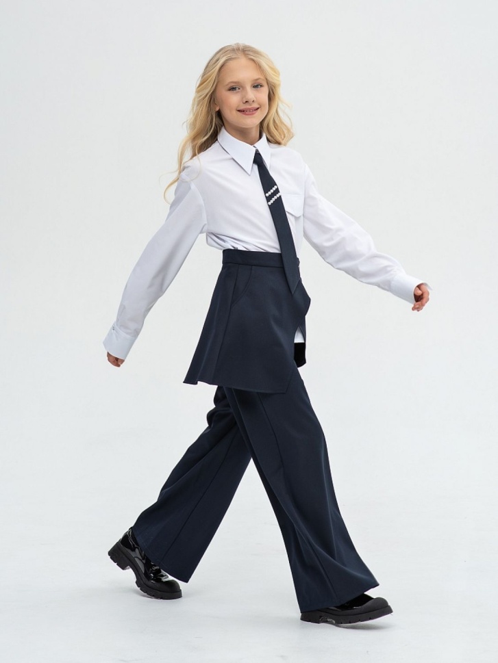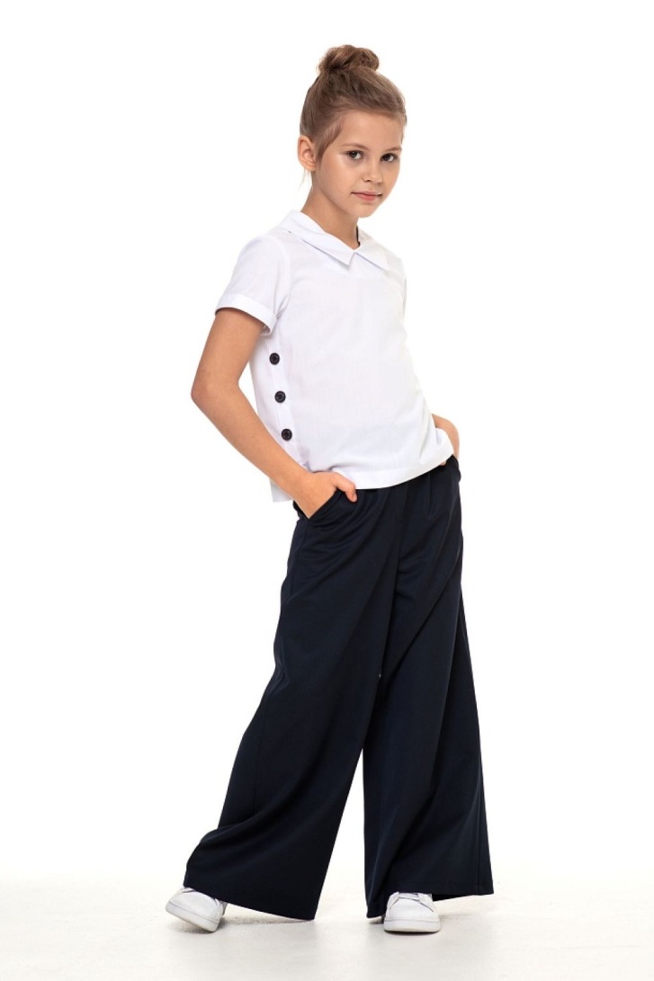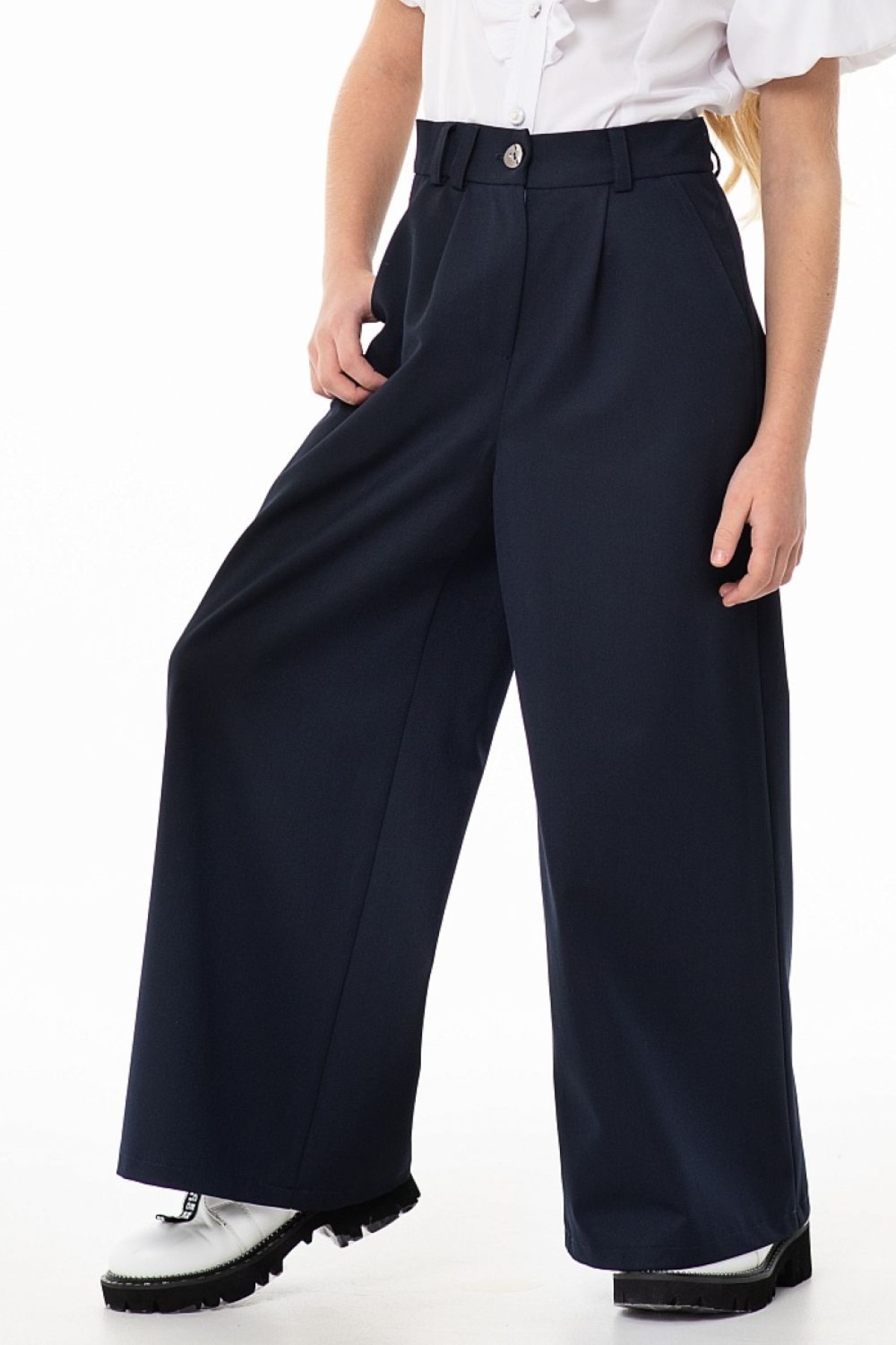 Широкие синие школьные брюки для девочек станут отличной основой стильных динамичных образов. Базовые брюки актуального свободного кроя, легкий клёш от бедра. Застежка молния + пуговка. Двусторонняя регулировка по талии гарантирует идеальную посадку по фигуре. Свободные школьные брюки уже стали классикой гардероба школьниц любого возраста. Не удивительно, ведь эти детские брюки можно носить и в школу, и вне её стен. Девочки с легкостью внедряют их в свой повседневный гардероб. Синие палаццо для девочек выполнены из премиальной костюмной ткани, состав: 35% вискоза, 65% полиэфирные волокна. Прочный и устойчивый к износу материал, отвечает всем требованиям гигроскопичности и воздухопроницаемости - позволяет коже «дышать» даже при длительной носке. Легко выдерживает частые стирки без потери качества и внешнего вида, не скатывается и сохраняет форму. Ткань идеальна для школьных костюмов, так как практически не мнется; гигроскопична - отлично впитывает и испаряет лишнюю влагу; воздухопроницаема - обеспечивает комфо