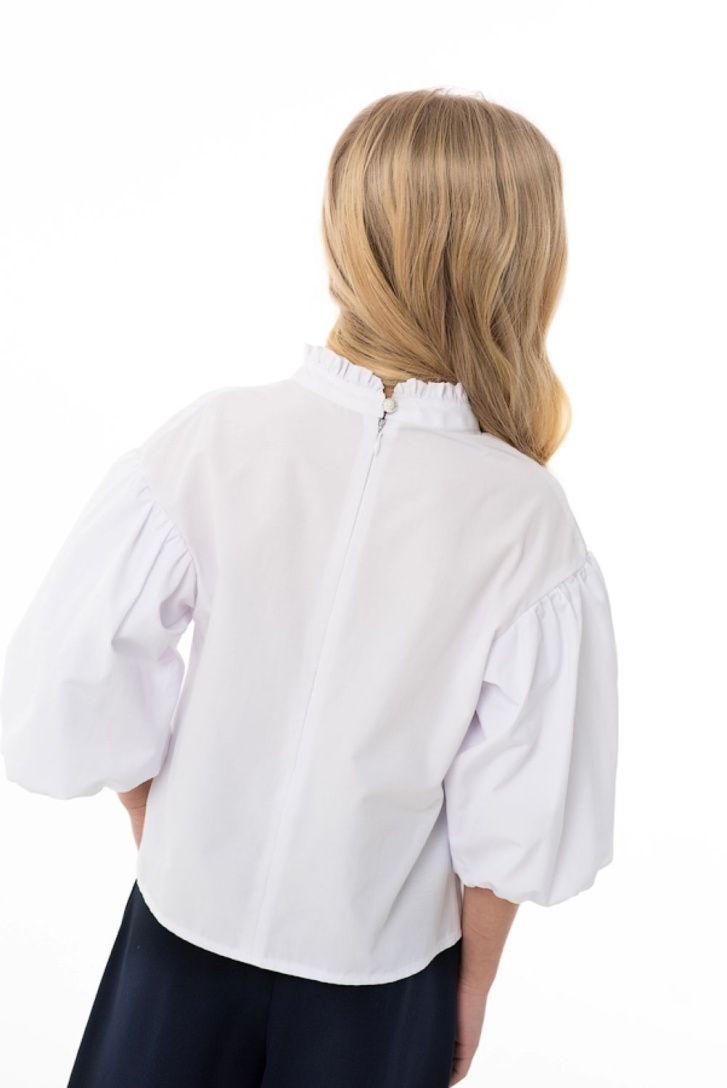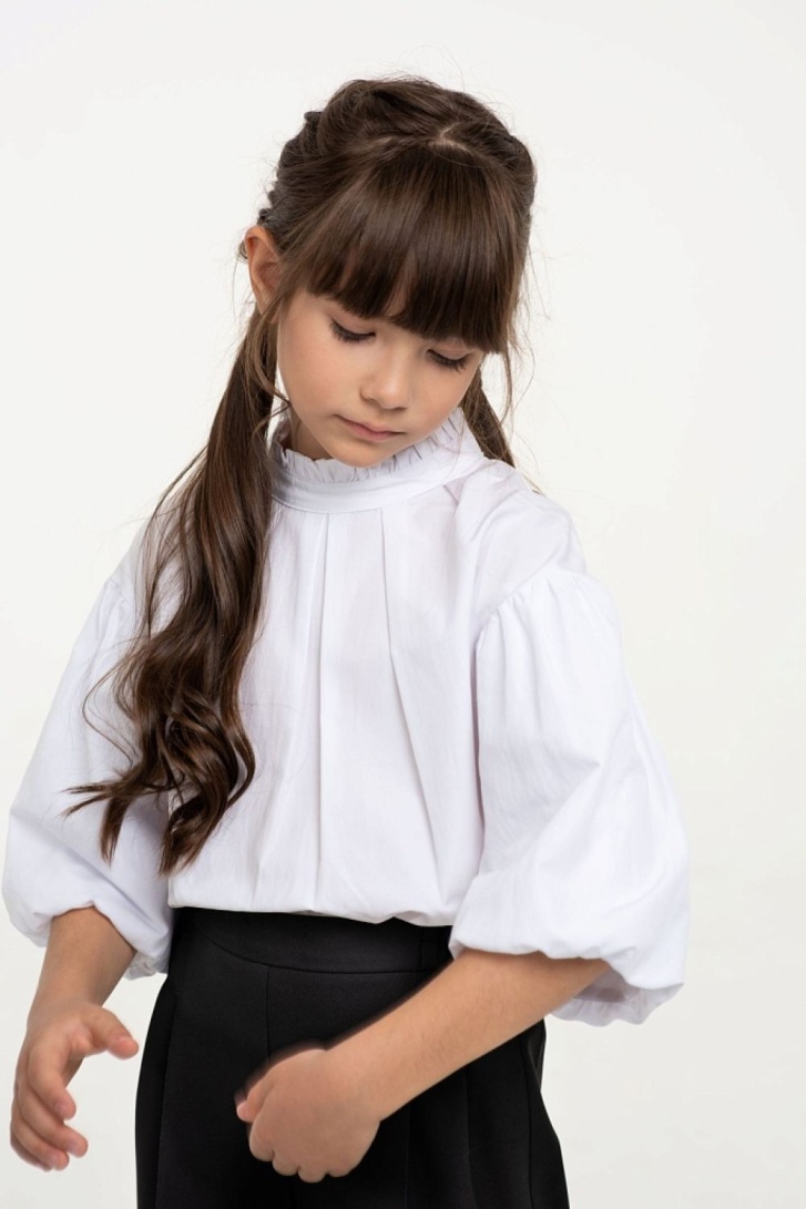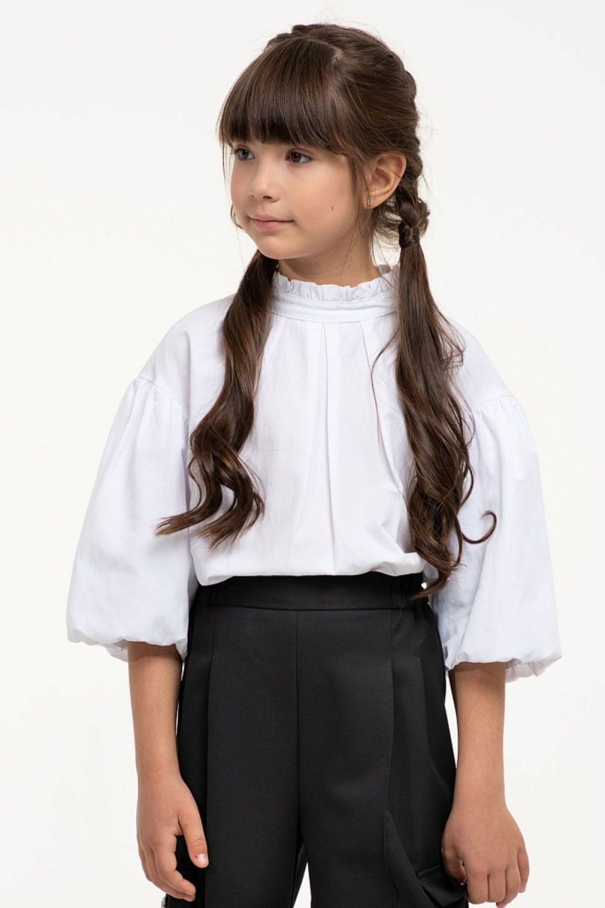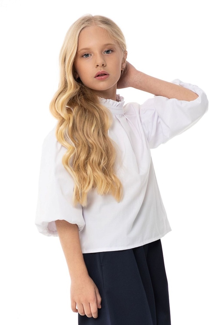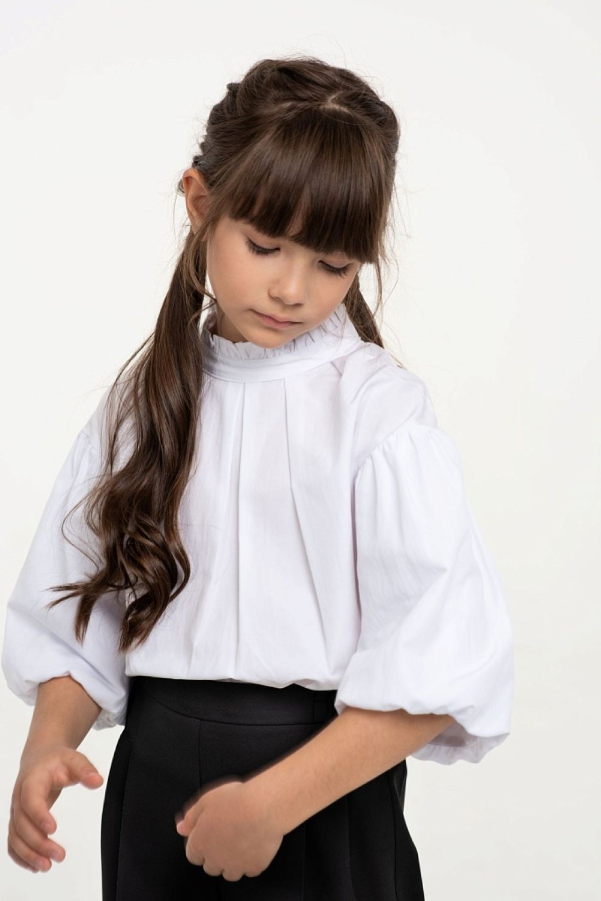 Белая школьная блузка для девочек выполнена из высокотехнологичной ткани нового поколения - поликоттон, состав 55% хлопок, 45% полиэфир. Материал обладает всеми свойствами хлопка, но улучшен для ежедневного использования:Легко гладить, ткань имеет низкую сминаемость. Долго прослужит и сохранит первоначальный вид благодаря высокой стойкости к износу. Хорошо впитывает и отводит влагу от тела ребенка, пропускает воздух. Безопасная и гипоаллергенная, мягкая ткань, комфортная к телу. Лаконичный дизайн детской блузки - без излишеств, как идеальный баланс строгости и очарования. Универсальный вариант для уроков, праздничных линеек и фото – смотрится нарядно, но не вычурно. Блузку можно носить навыпуск и заправлять. Рукава-буфы 3/4 – мягкий объём, который не мешает писать и двигаться, но делает силуэт выразительнее. Аккуратные рюши – деликатный женственный акцент, который подчеркнёт опрятность образа.