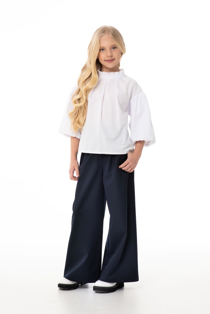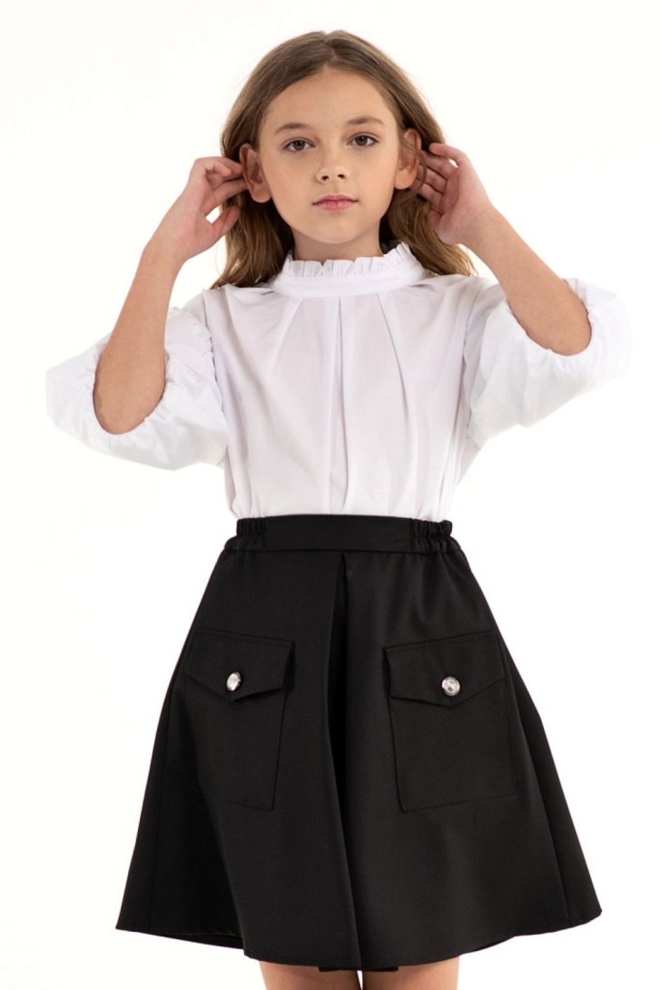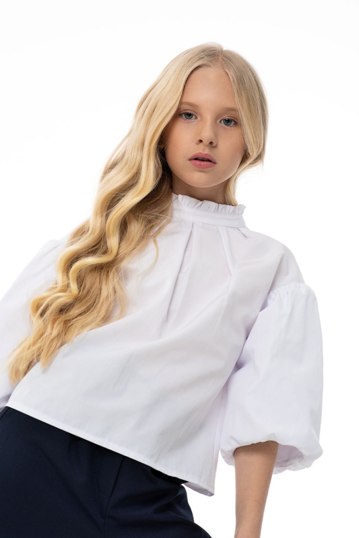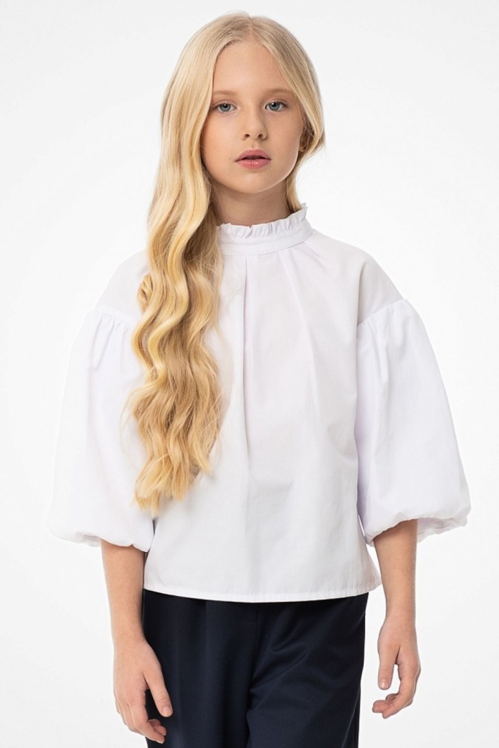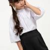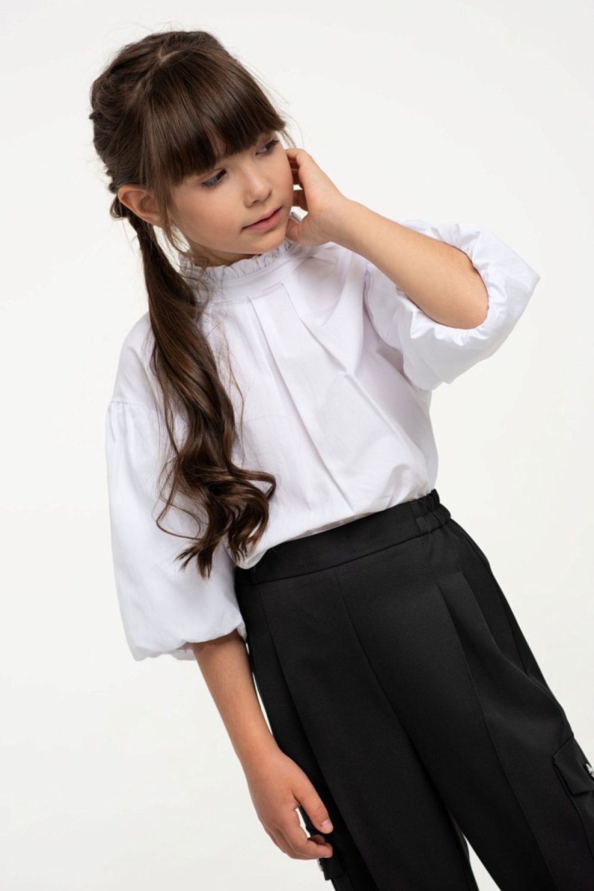 Белая школьная блузка для девочек выполнена из высокотехнологичной ткани нового поколения - поликоттон, состав 55% хлопок, 45% полиэфир. Материал обладает всеми свойствами хлопка, но улучшен для ежедневного использования:Легко гладить, ткань имеет низкую сминаемость. Долго прослужит и сохранит первоначальный вид благодаря высокой стойкости к износу. Хорошо впитывает и отводит влагу от тела ребенка, пропускает воздух. Безопасная и гипоаллергенная, мягкая ткань, комфортная к телу. Лаконичный дизайн детской блузки - без излишеств, как идеальный баланс строгости и очарования. Универсальный вариант для уроков, праздничных линеек и фото – смотрится нарядно, но не вычурно. Блузку можно носить навыпуск и заправлять. Рукава-буфы 3/4 – мягкий объём, который не мешает писать и двигаться, но делает силуэт выразительнее. Аккуратные рюши – деликатный женственный акцент, который подчеркнёт опрятность образа.