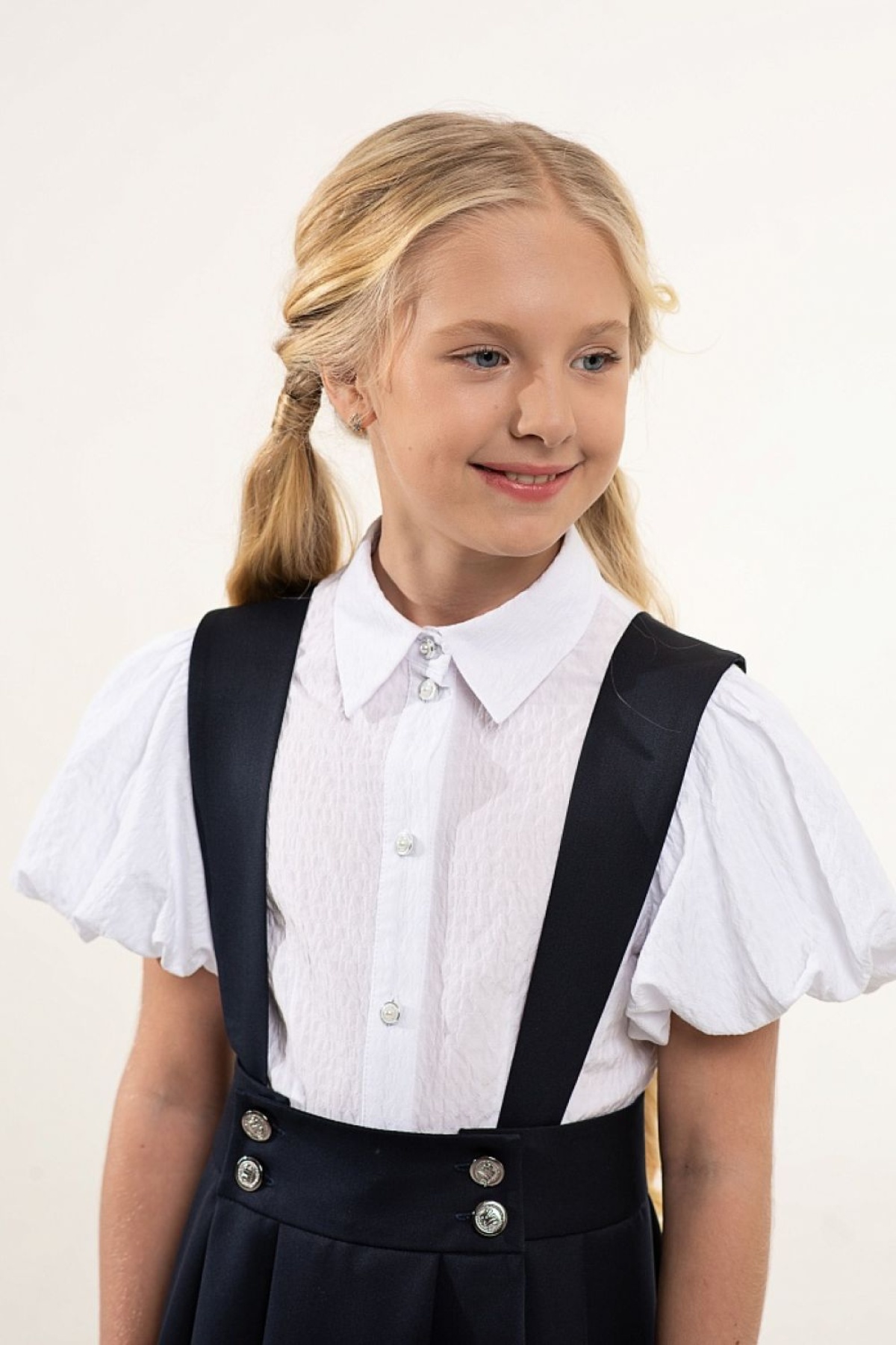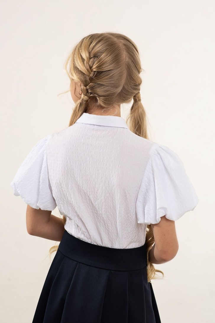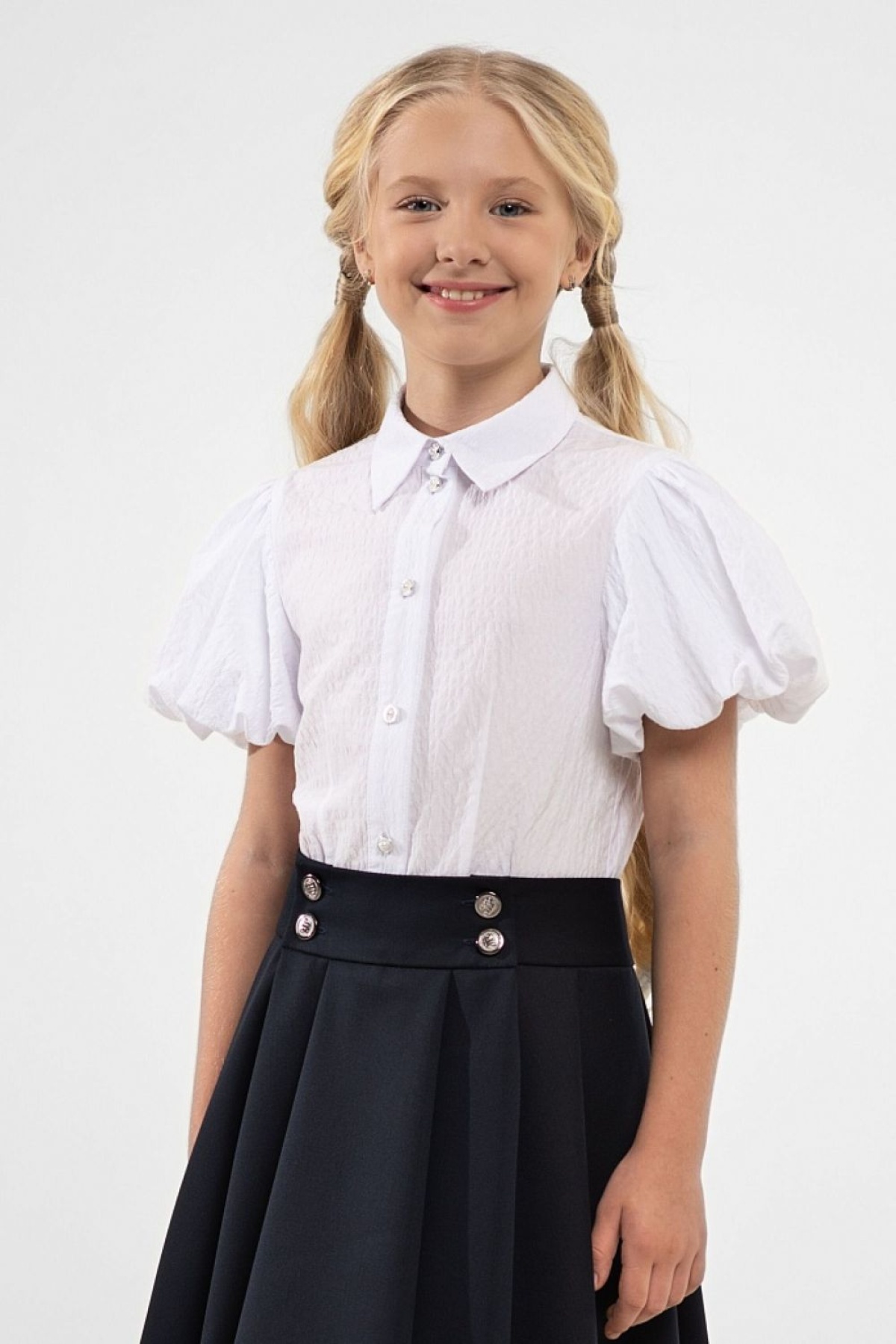 Белая школьная блузка для девочек выполнена из высокотехнологичной ткани нового поколения - поликоттон с эффектом крэш. Состав: 55% хлопок, 45% полиэфир. Материал обладает всеми свойствами хлопка, но улучшен для ежедневного использования: Не нужно гладить, ткань имеет низкую сминаемость и необычную фактуру. Долго прослужит и сохранит первоначальный вид благодаря высокой стойкости к износу. Хорошо впитывает и отводит влагу от тела ребенка, пропускает воздух. Безопасная и гипоаллергенная, мягкая ткань, комфортная к телу. Лаконичный дизайн без излишеств в декоре - белая детская блузка с короткими рукавами отлично смотрится абсолютно в любых комплектах: Минималистичная базовая школьная рубашка для девочек подходит на каждый день с юбками, брюками и жилетами, под сарафаны. Дополните модель нарядным жабо, акцентной брошью или галстуком-бантом, и блузка будет смотреться более празднично в образах для торжественных случаев.Пышные фонарики сохраняют свой объем благодаря сборке на мягкую трикотажную внутреннюю часть ру