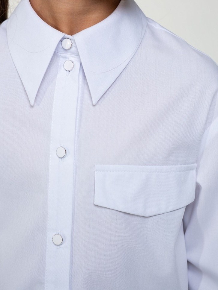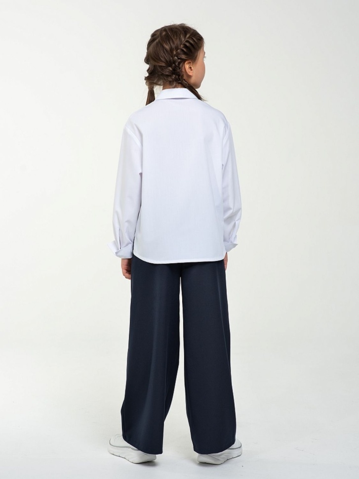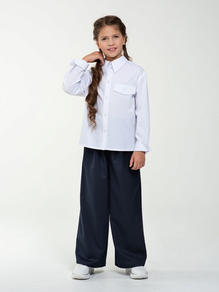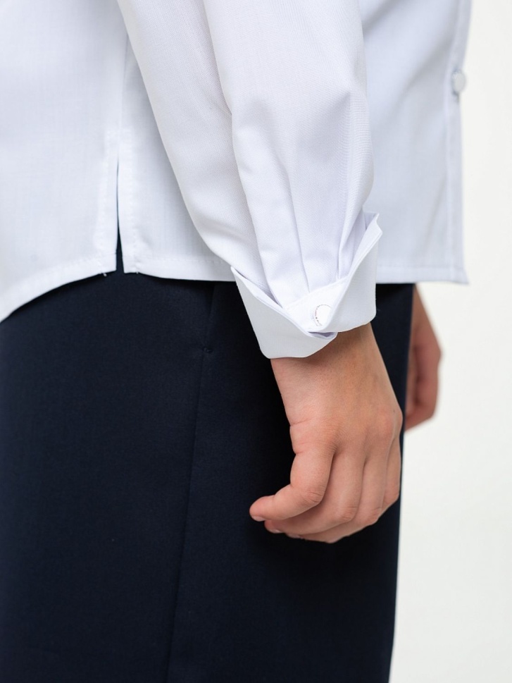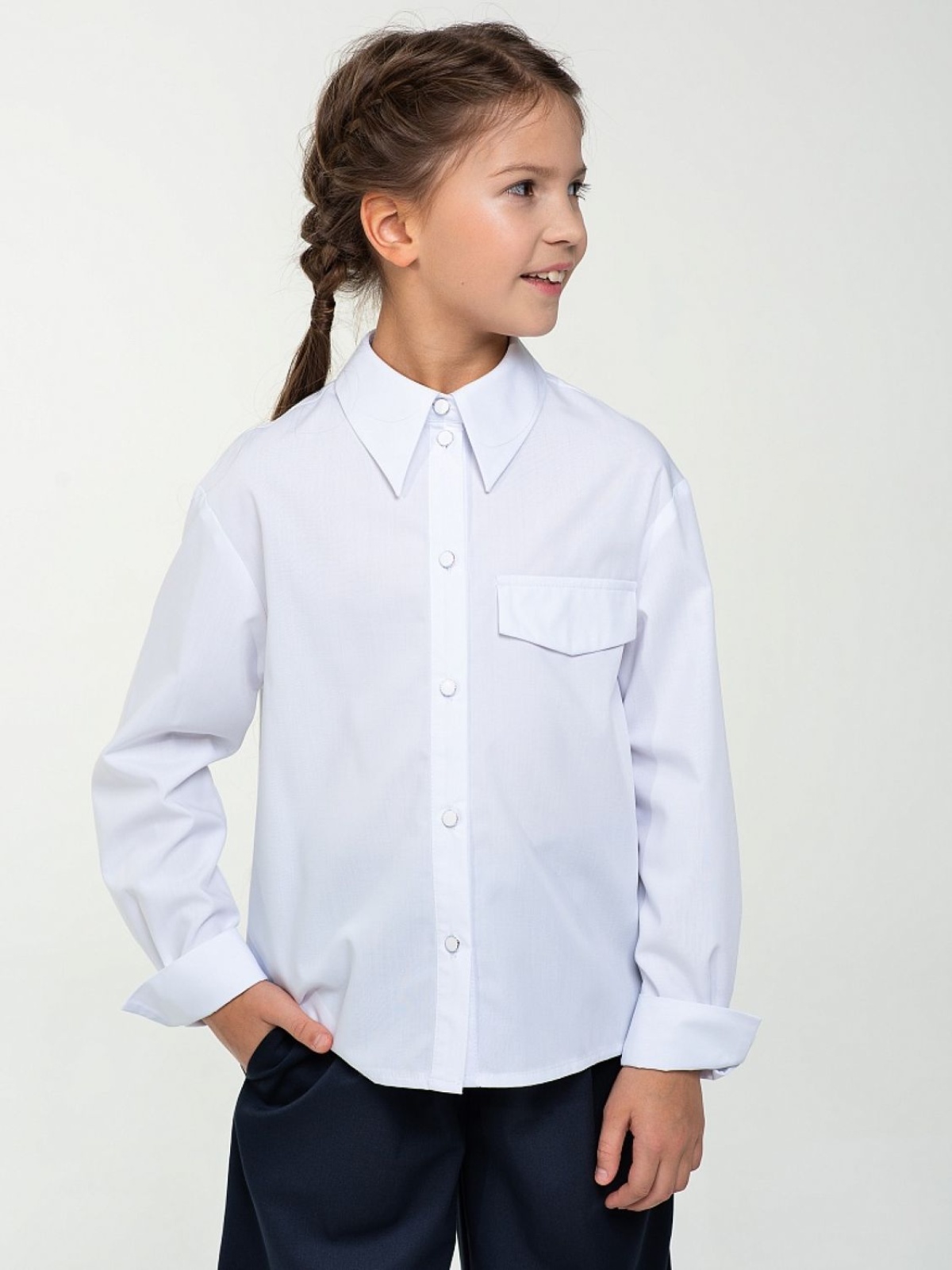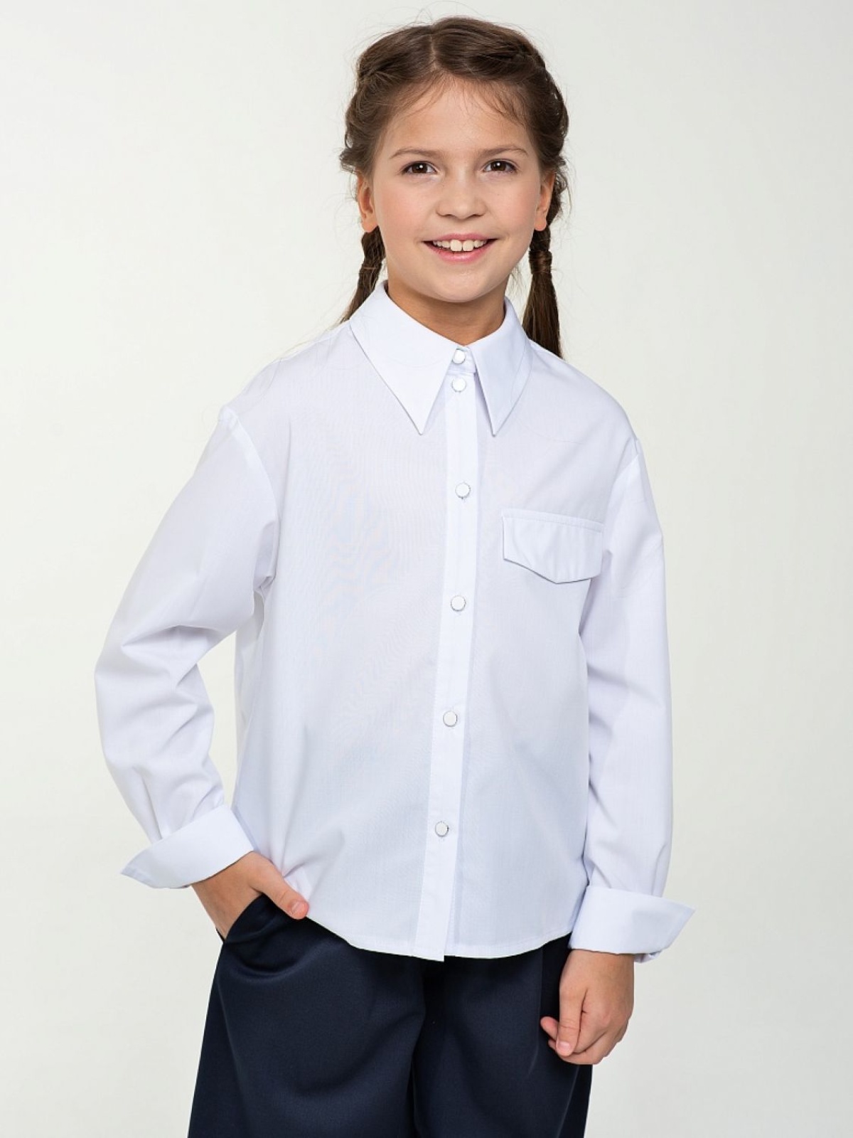 Белая школьная рубашка для девочек. Максимально комфортная и удобная школьная блузка, за счет простого слегка свободного кроя и прямого силуэта, легко сочетается в различных школьных и повседневных комплектах. Рубашку можно носить навыпуск или заправлять, использовать в многослойных образах на футболку или под свитшот. Модель выполнена из российской сорочечной поливискозы премиум качества - это высокотехнологичная ткань нового поколения, состав 65% полиэфир, 35% вискоза. Материал обладает всеми свойствами хлопка, но улучшен для ежедневного использования: Легко гладить, ткань имеет низкую сминаемость. Долго прослужит и сохранит первоначальный вид благодаря высокой стойкости к износу. Хорошо впитывает и отводит влагу от тела ребенка, пропускает воздух. Безопасная и гипоаллергенная, мягкая ткань, комфортная к телу. Базовая белая блузка для девочки декорирована трендовым острым воротничком, манжетами необычного кроя (можно носить подвернутыми или расправленными) и клапаном.