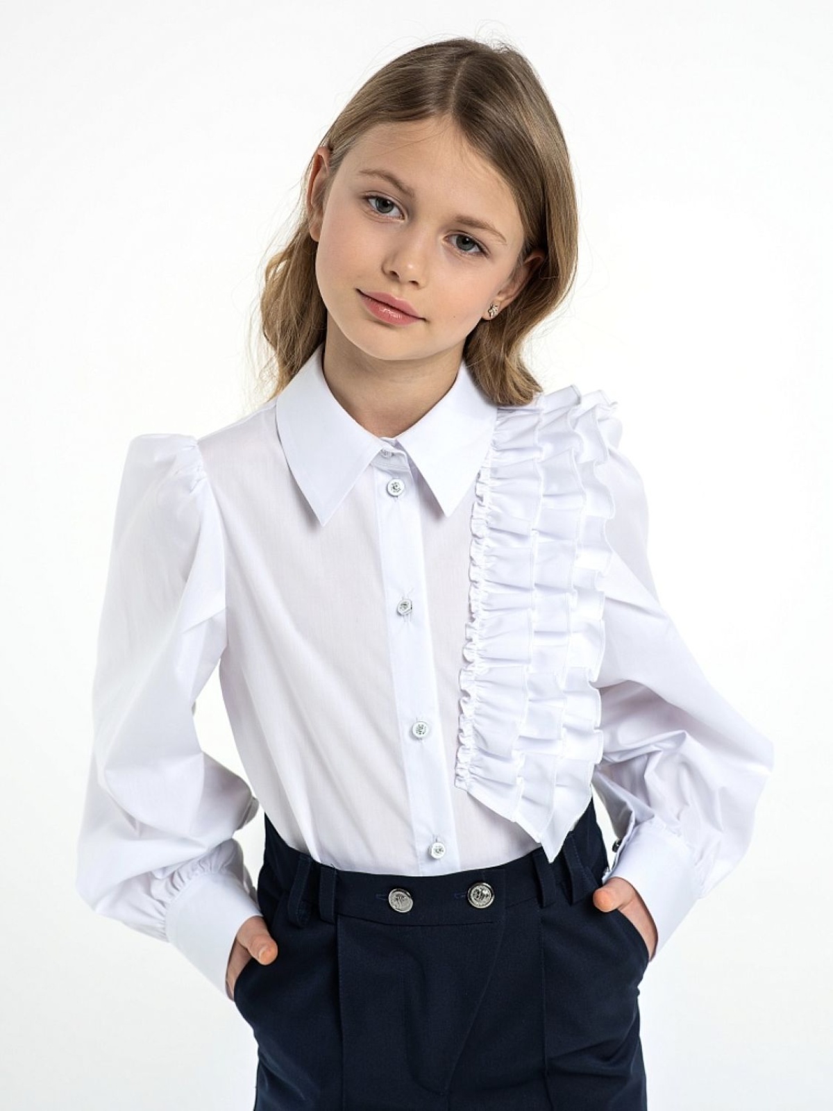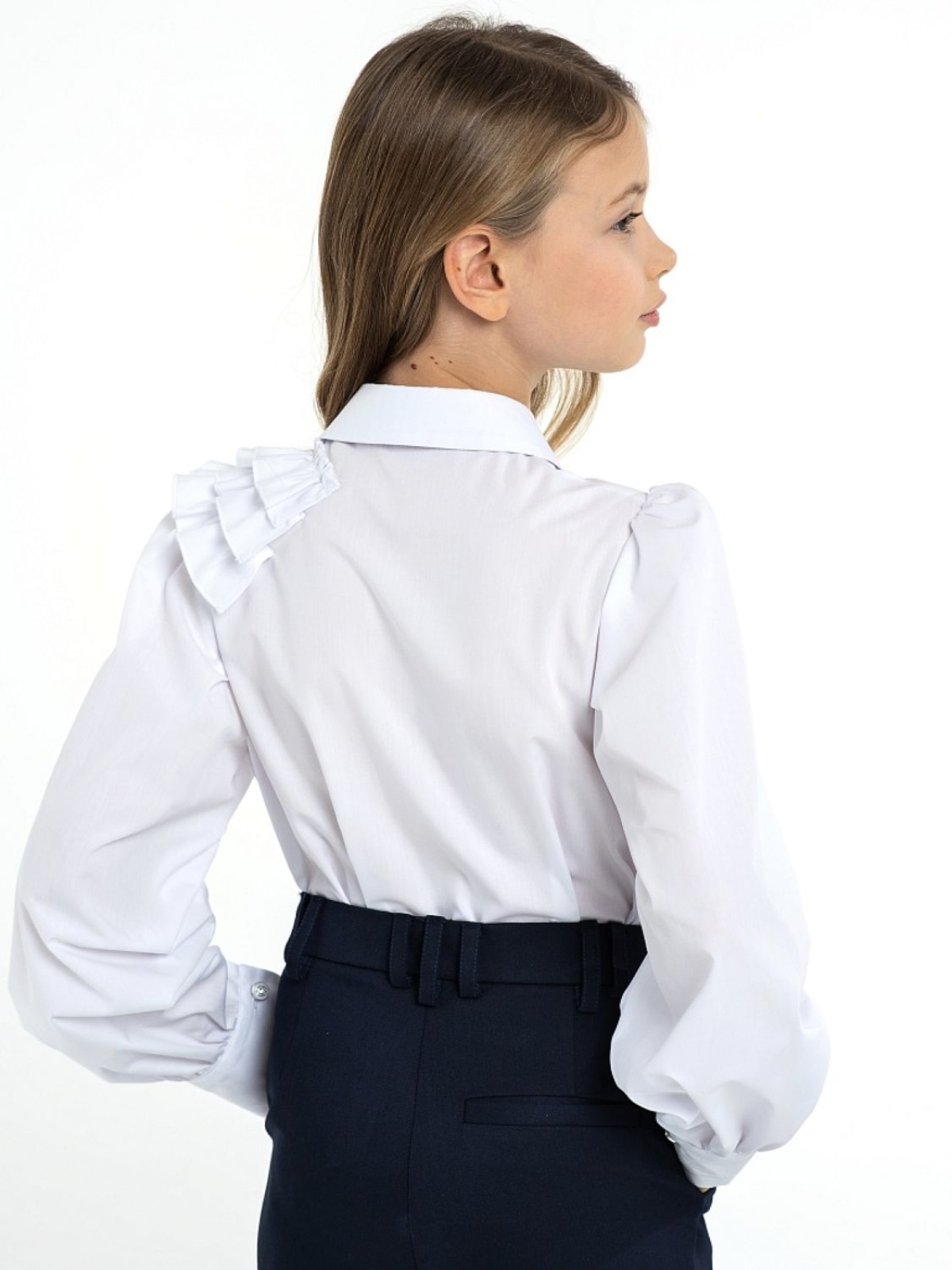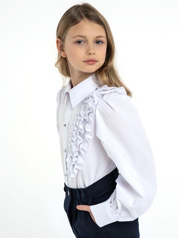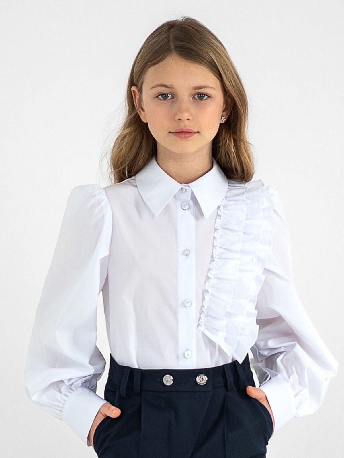 Белая школьная блузка для девочек с ассиметрично расположенными рюшами. Модель отлично подходит для торжественных случаев - линейка на 1 сентября, праздники и мероприятия в актовом зале, совместные фотосъемки для классного альбома. Благодаря своему лаконичному дизайну, её можно носить в школу и в обычные дни. Детская блузка с необычным дизайном поможет создать интересные и оригинальные образы и подчеркнет чувство стиля своей обладательницы. Белая школьная рубашка для девочек выполнена из российского сорочечного поликоттона премиум качества - это высокотехнологичная ткань нового поколения, состав 55% хлопок, 45% полиэфир. Материал обладает всеми свойствами хлопка, но улучшен для ежедневного использования: Легко гладить, ткань имеет низкую сминаемость. Долго прослужит и сохранит первоначальный вид благодаря высокой стойкости к износу. Хорошо впитывает и отводит влагу от тела ребенка, пропускает воздух. Безопасная и гипоаллергенная, мягкая ткань, комфортная к телу.