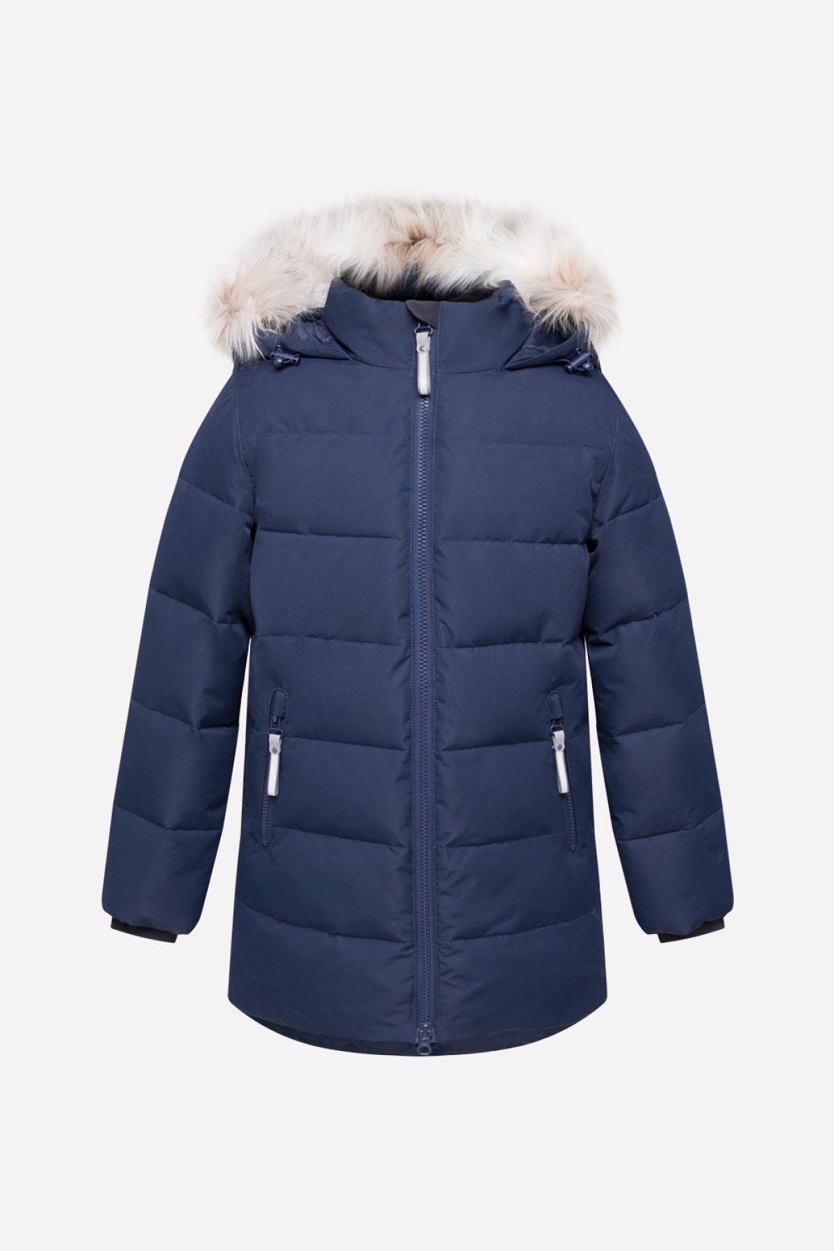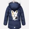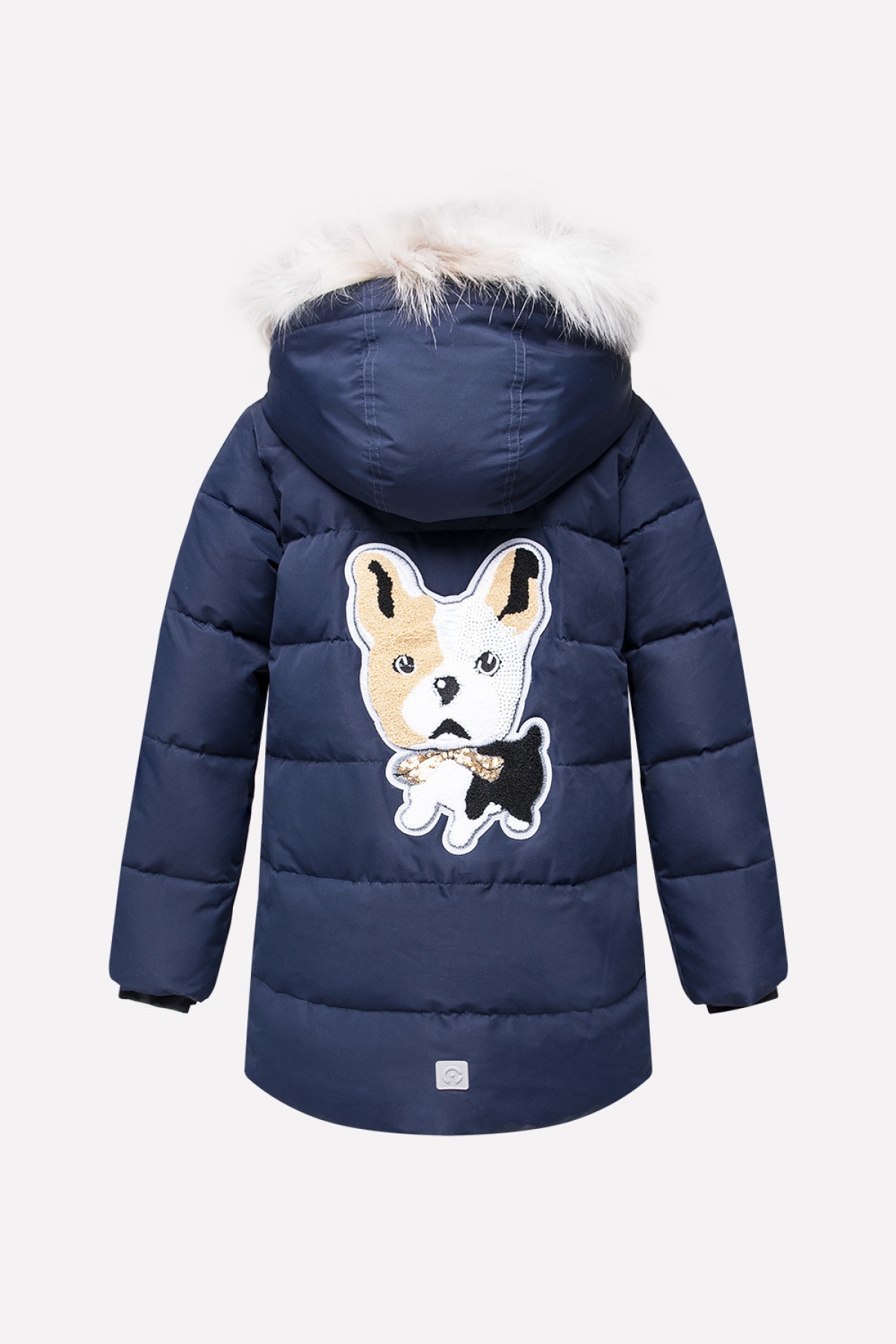 Стеганное пуховое пальто для девочки. Наполнитель - высококачественный гусиный пух в соотношении 70% пуха и 30% пера. Мембранная ткань 1000/1000 с тефлоновым покрытием обладает водоотталкивающими, грязеотталкивающими и "дышащими" свойствами. Подкладка из гладкого полиэстера облегчает одевание. На спинке аппликация с пайетками в виде собачки. Светоотражающие детали обеспечат дополнительную безопасность в темное время суток. Капюшон со съемной опушкой из искусственного меха защитит от снега и ветра.