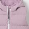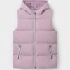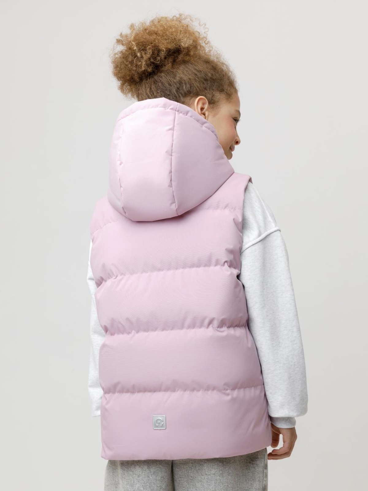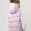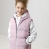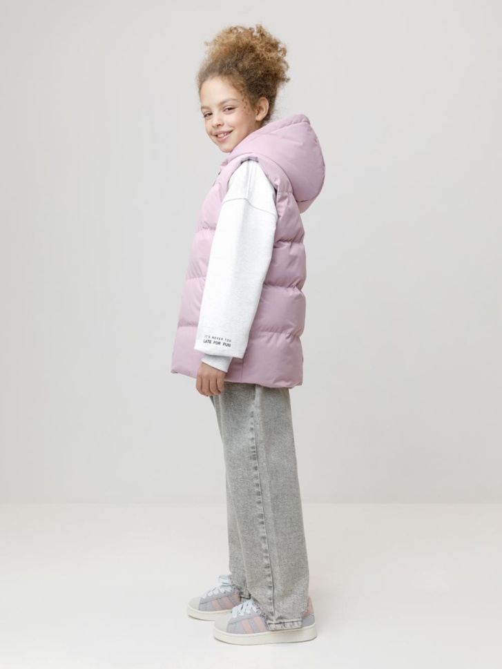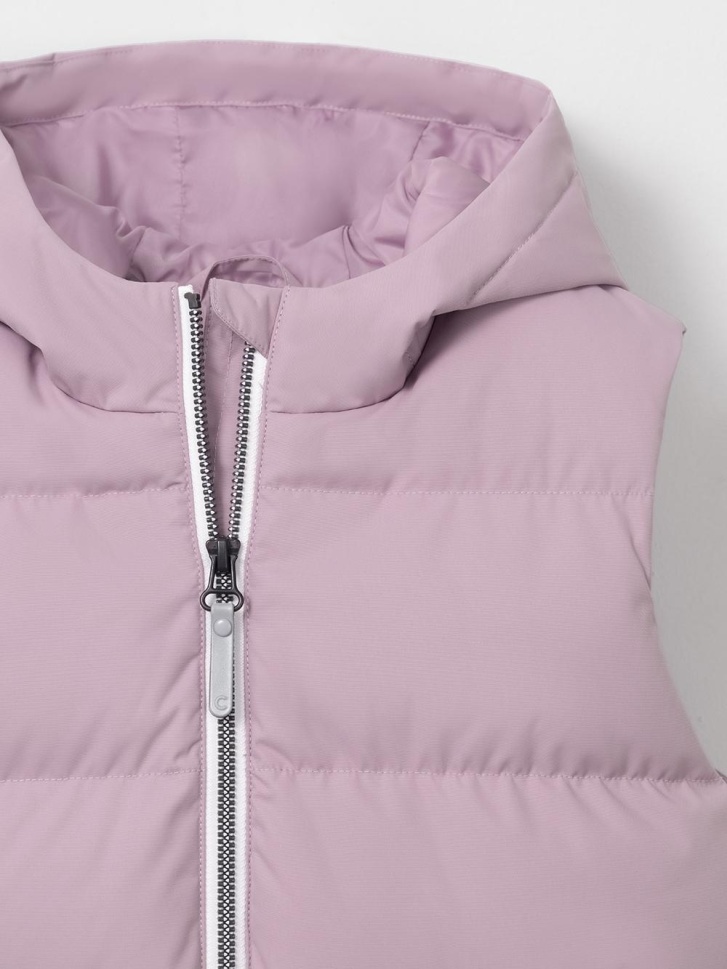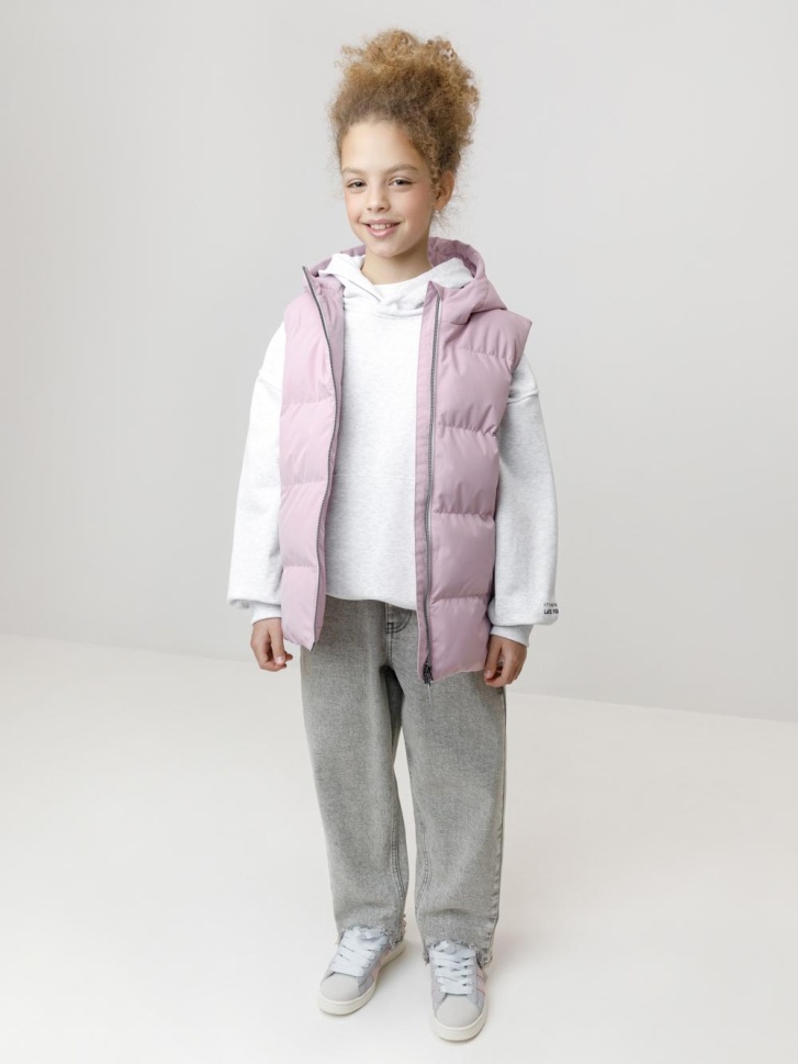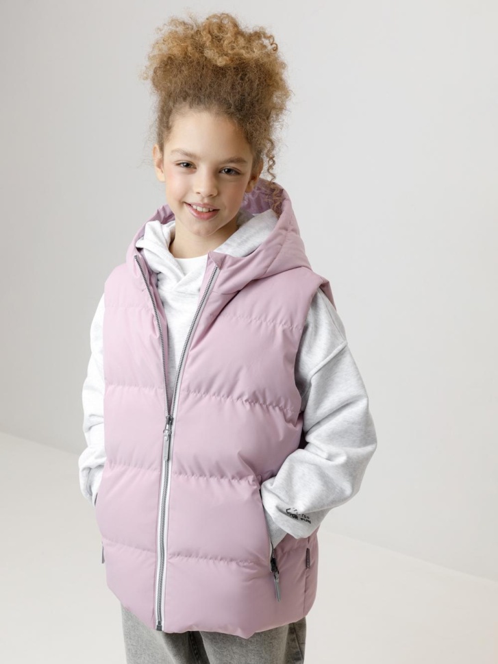 Стёганый жилет с капюшоном для девочки с утеплителем синтепух, 120 г/м2. Выполнен из мембранной ткани с дополнительной тефлоновой обработкой. Данный вид обработки предохраняет изделие от загрязнения и лучше отводит влагу. Подклад из 100% полиэстра. Капюшон не снимается. Изделие застёгивается на молнию, предусмотрена защита подбородка. Два кармана по бокам застёгиваются на молнии. Во всех изделиях верхнего ассортимента для безопасности ребёнка предусмотрены светоотражающие элементы.