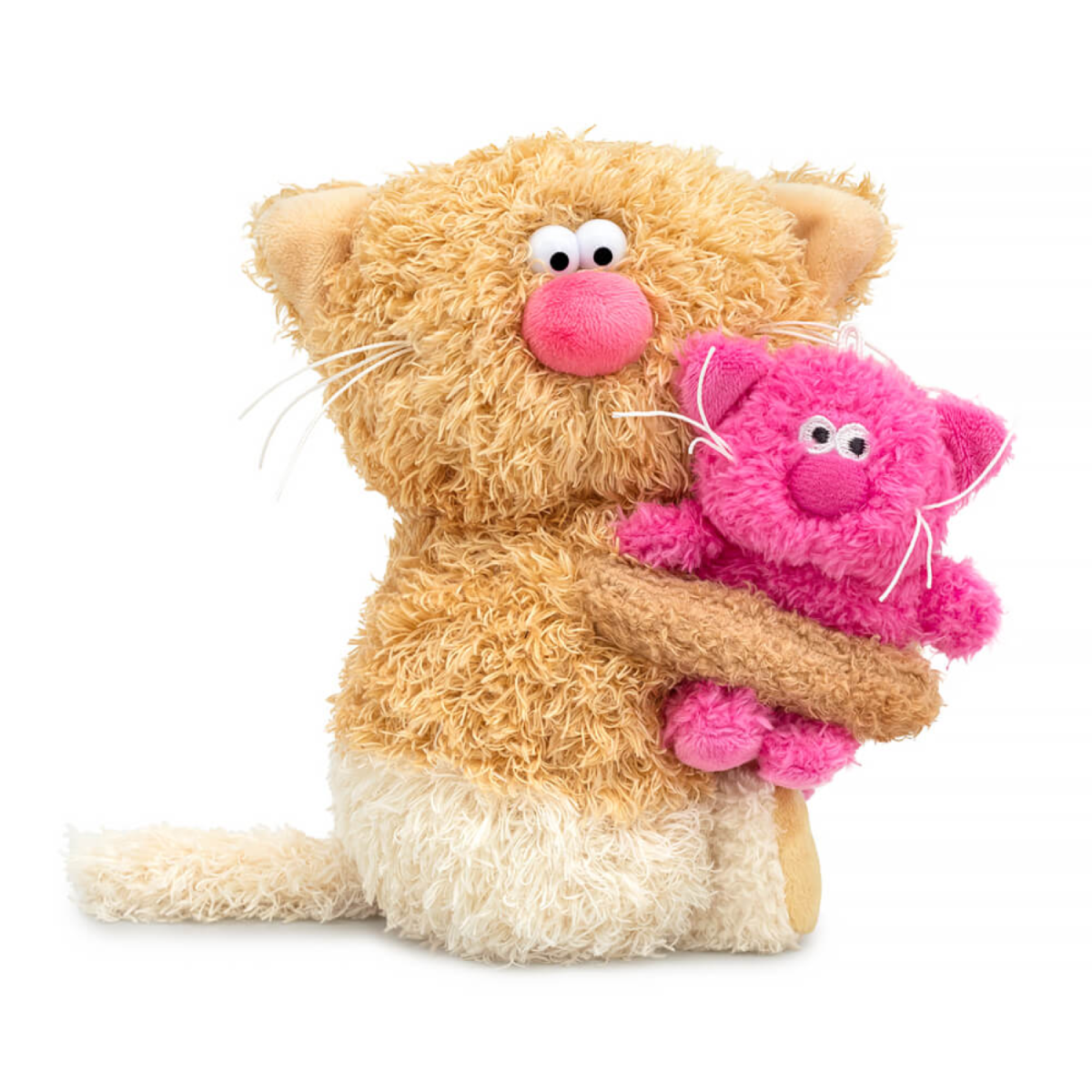 Очаровательный кофейный кот Раф из тактильно приятного эко меха в двух оттенках, цвета песочного печенья и цвета топлёного молока. У кота есть дружок – сиропчик-котёнок Вишня. Ведь так вкуснее! Котик Раф трогательно держит в лапках малыша Вишню, сшитого из ярко-розового эко меха. Только в коллекции "Сиропчики" у кофейного кота голова вращается на 360°, благодаря специальному поворотному механизму. У сиропчика-котёнка на голове есть петелька и его можно использовать как брелок. У каждой кофейной пары своя индивидуальная подложка.