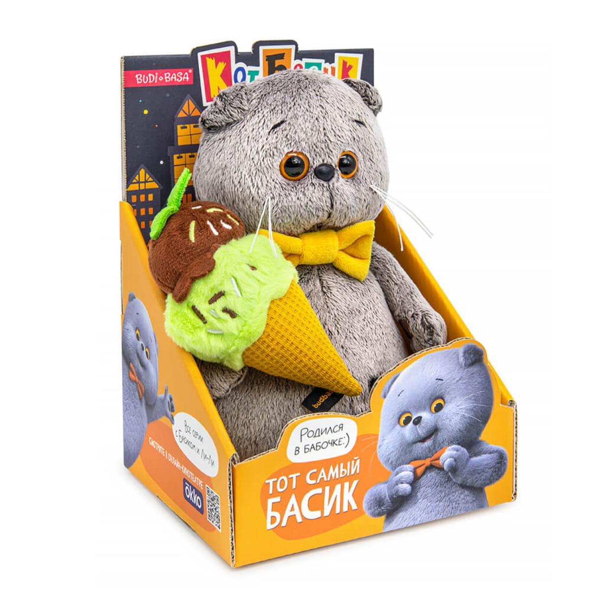 Игрушка Кот Басик с мороженым, "Мультсериал" В лапке Басик держит аппетитное фисташковое мороженое. Мороженое сшито из софта цвета фисташки и вафельной ткани цвета печенья, имитирующей вафельный рожок. Сверху мороженого шоколадный шарик с мятным листочком. Мороженое украшено вышитой карамельной посыпкой. А на самом Басике его фирменный галстук бабочка.