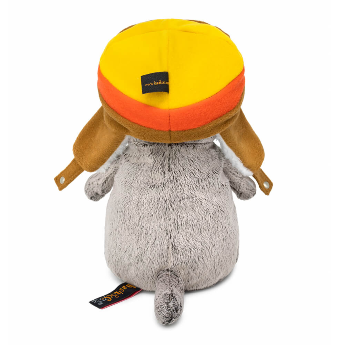 Кот Басик в крутом шлеме для полётов на самолёте и параплане. Шлем сшит из трёх цветов мягкого флиса и короткого, кудрявого меха белоснежного цвета. У шлема удлинённые ушки, которые застёгиваются на металлическую кнопку. На козырьке шлема прикреплены специальные лётные очки с оторочкой из эко-замши песочного цвета. На шее Басика его любимый галстук-бабочка.