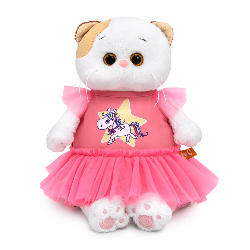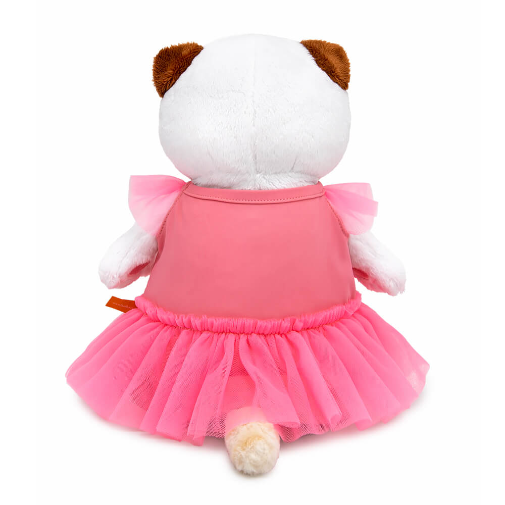 На кошечке Ли-Ли очаровательное платье в розовых оттенках. Верх платья сшит из х/б трикотажа, юбочка из тончайшей сеточки в несколько слоёв, рукава-крылышки также из сеточки. Спереди на платье термонаклейка с авторским рисунком в виде милой лошадки, символом года 2026.