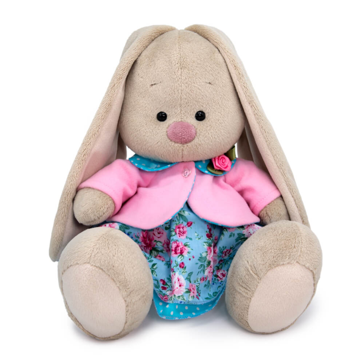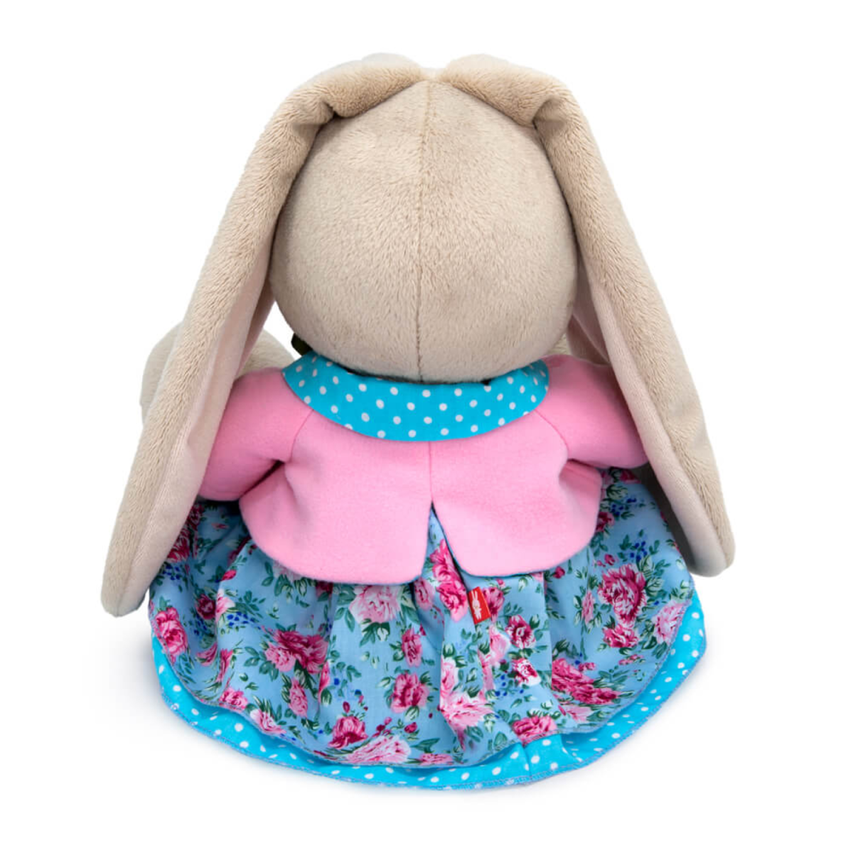На Зайке Ми очень милый комплект в нежных оттенках. Юбочка из х/б ткани в цветочек и мелкий горошек. Уютный жакетик из софта цвета розовой воды на подкладе и с воротничком из голубой х/б ткани в белый горошек. Воротничок украшен милой розочкой из атласных лент.