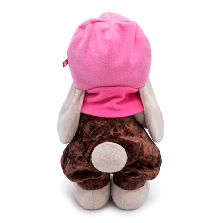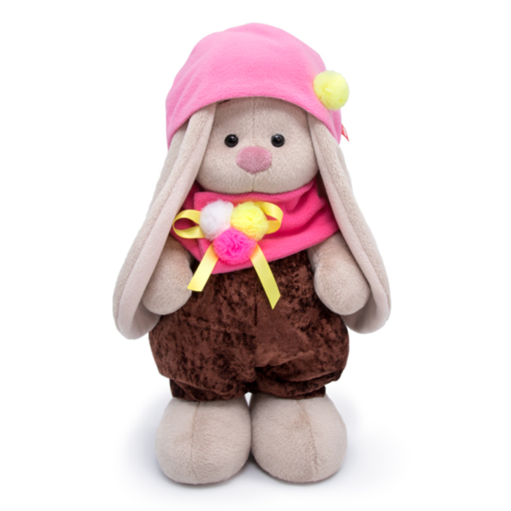 Зайка Ми в необычном костюмчике – бархатных штанишках цвета горького шоколада, шарфе-снуде из флиса цвета розового лимонада, украшенного помпонами и лентой. На голове у Зайки флисовая нежно-розовая шапочка с лимонным помпоном из сеточки на боку.