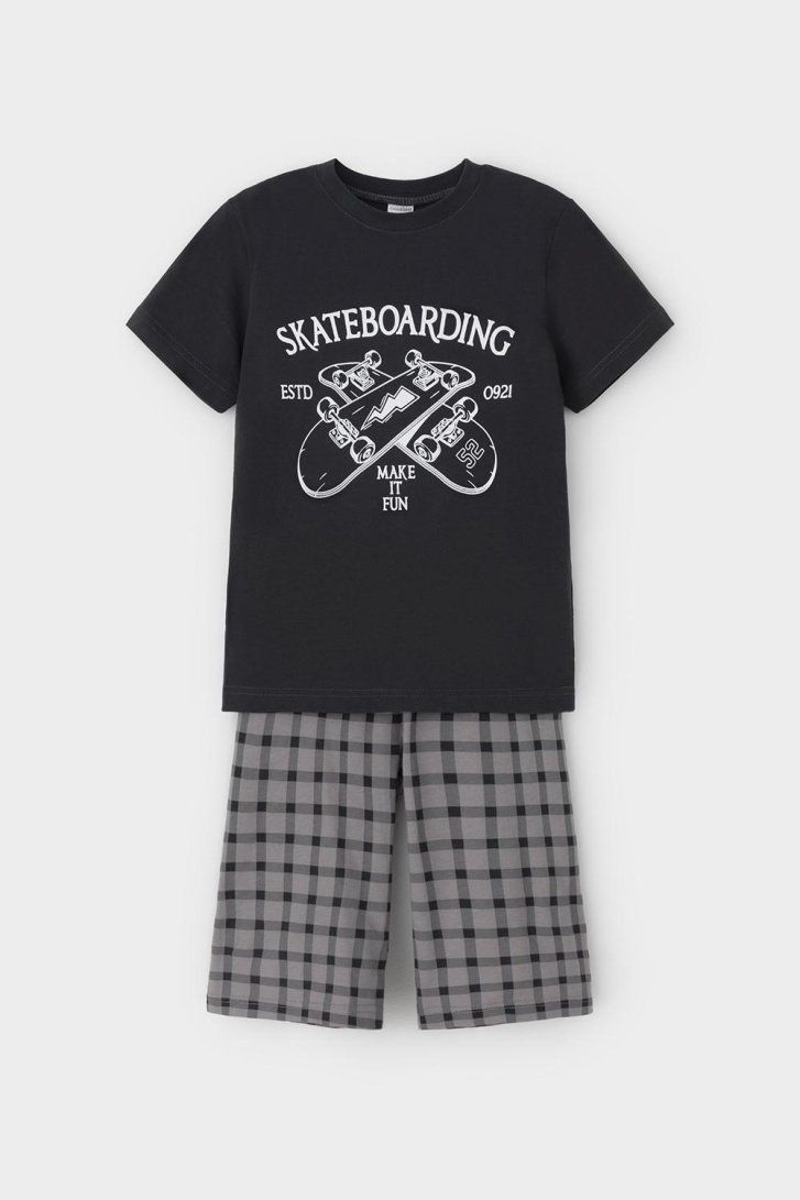 Трикотажная пижама из натурального хлопка. Футболка с короткими втачными рукавами и шорты с эластичной резинкой в поясе. Оригинальные набивка и принт выполнены из стойких гипоаллергенных текстильных гипоаллергенных красителей. Изделие сохраняет цвет и форму после многократных стирок. Все трикотажные полотна производятся в соответсвии с нормами швейцарского сертификата ЭкоТекс.