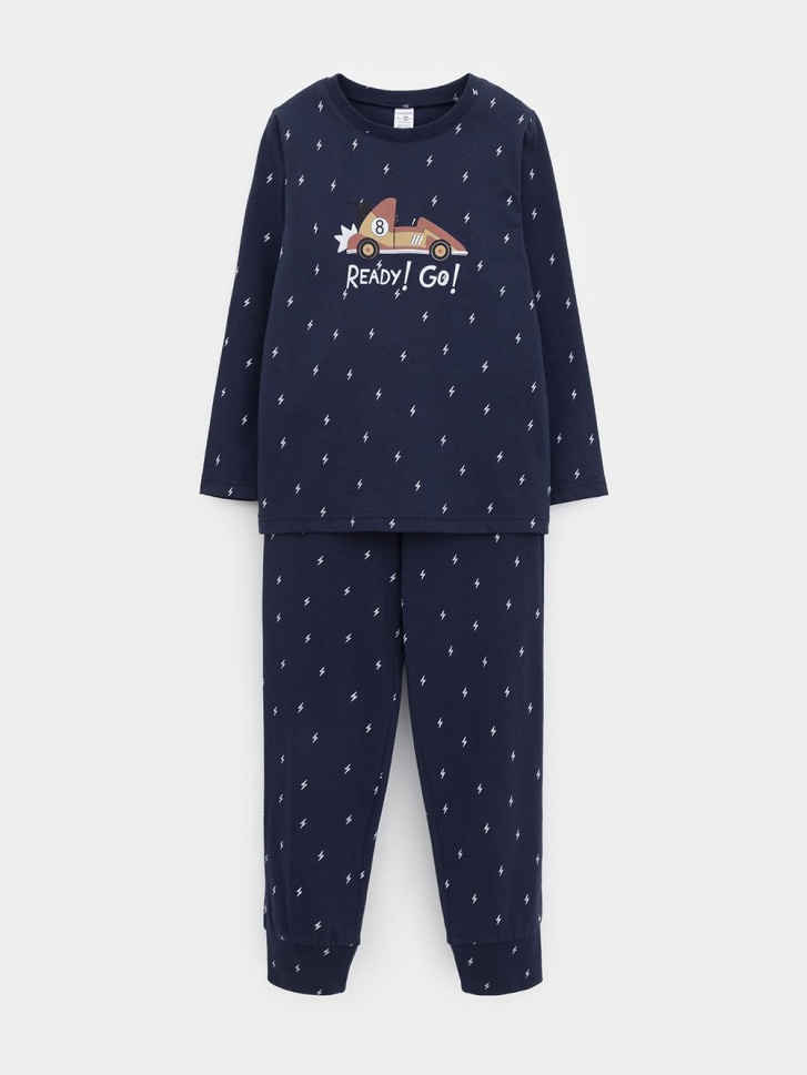 Пижама для мальчика из натурального хлопка. Джемпер с длинными втачными рукавами и брюки с эластичной резинкой в поясе. Мягкие манжеты по низу брюк сделаны из материала в рубчик. Оригинальная набивка и принт выполнены из стойких текстильных гипоаллергенных красителей. Изделие сохраняет цвет и форму после многократных стирок. Все трикотажные полотна производятся в соответствии с нормами швейцарского сертификата ЭкоТекс.