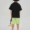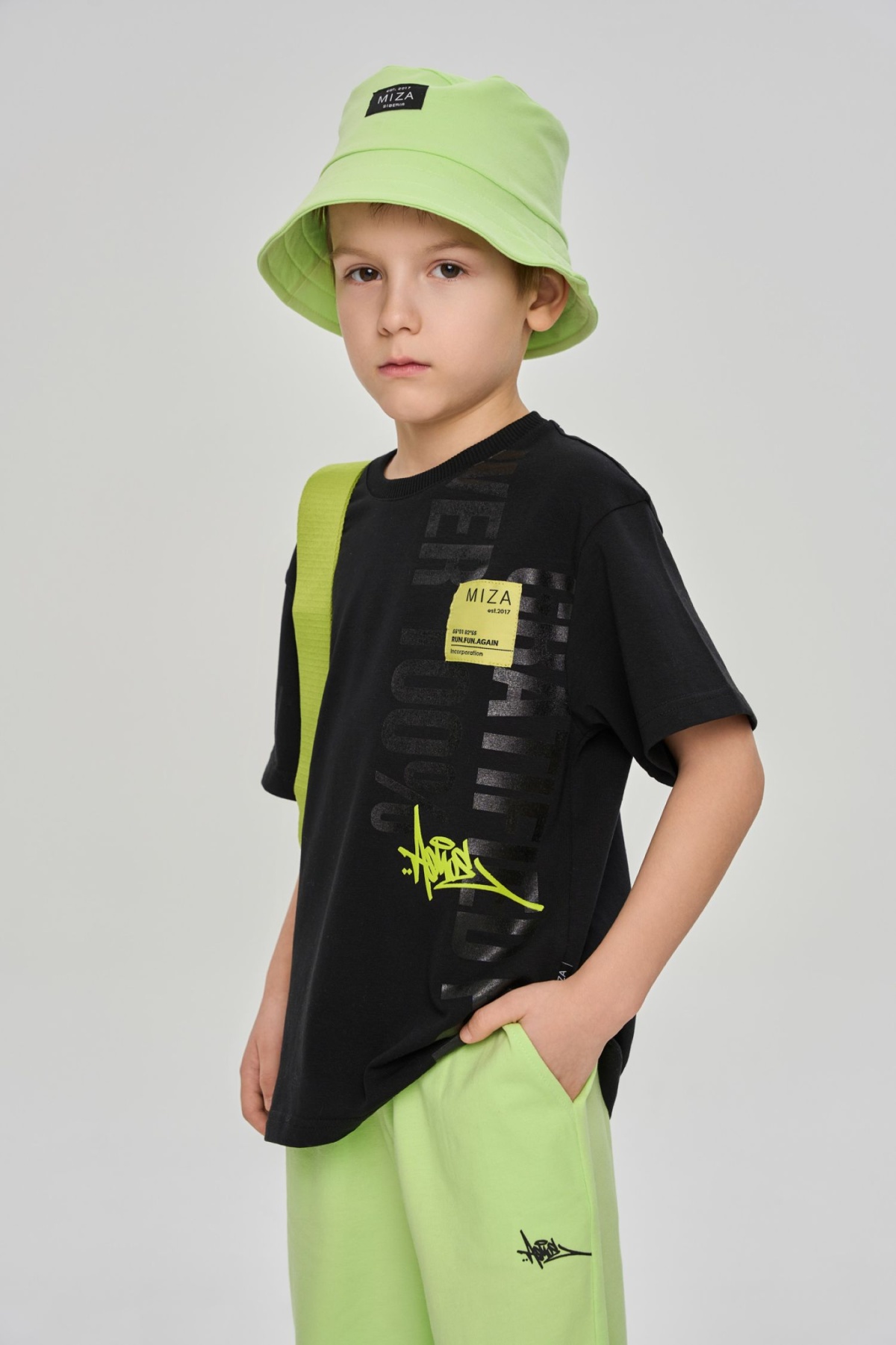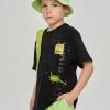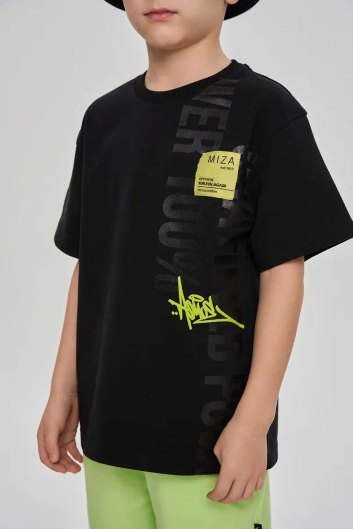 Футболка свободного прямого кроя, оформлена принтами и брендированной текстильной нашивкой. Выполнена из хлопкосодеражещго эластичного трикотажа с обработкой SilkTouch. Горловина из трикотажа в мелкий рубчик.