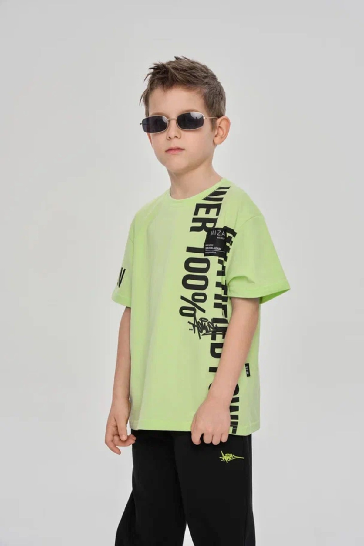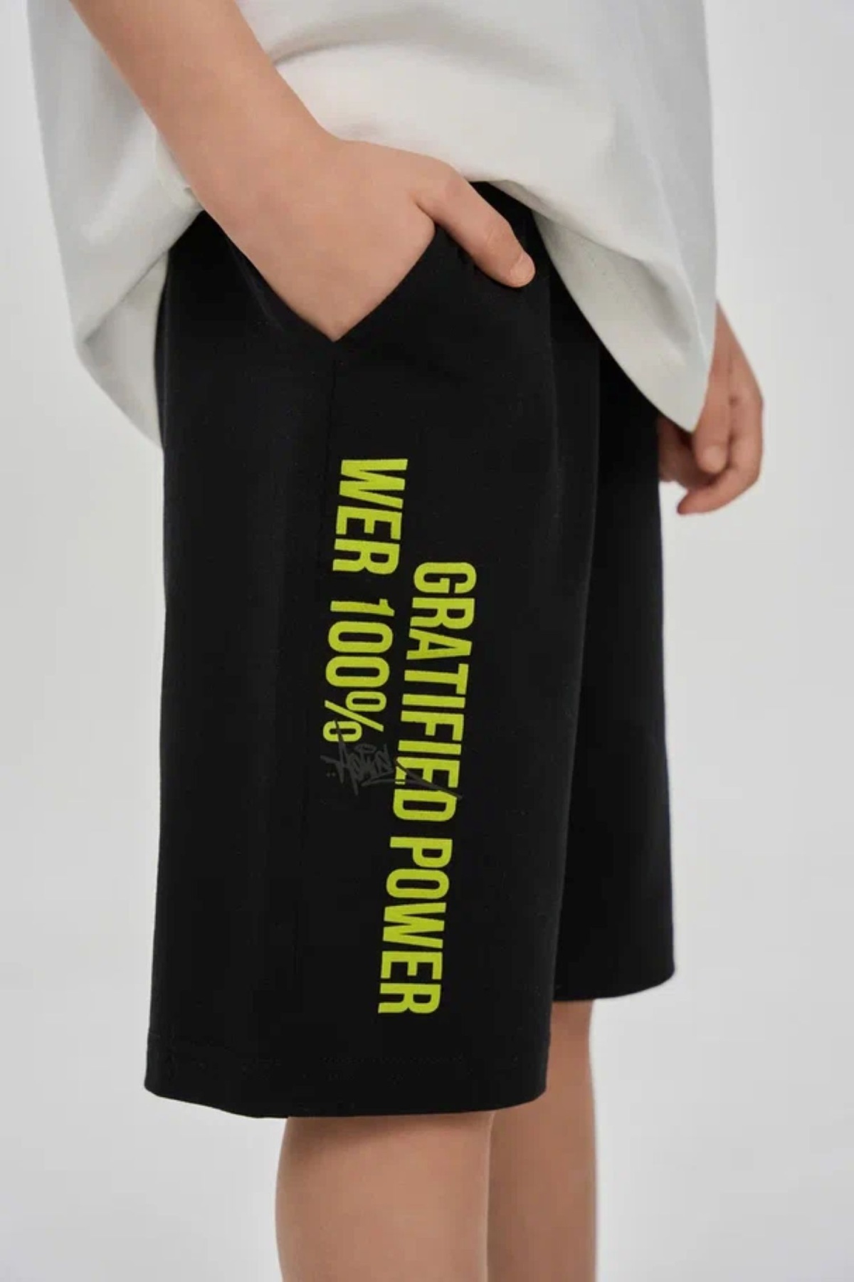 Шорты прямого свободного кроя из хлопкосодержащего эластичного трикотажа с обработкой SilkTouch. Пояс на мягкой эластичной резине. Оформлены текстовым принтом.