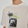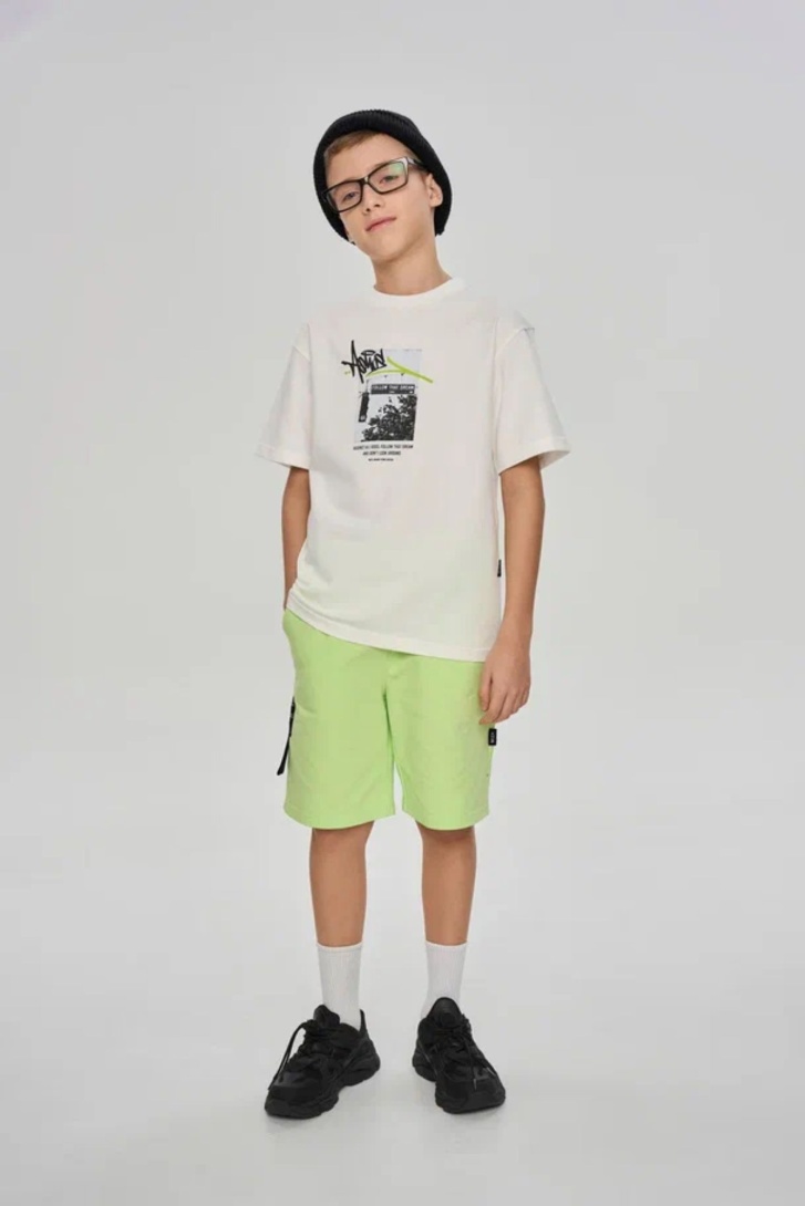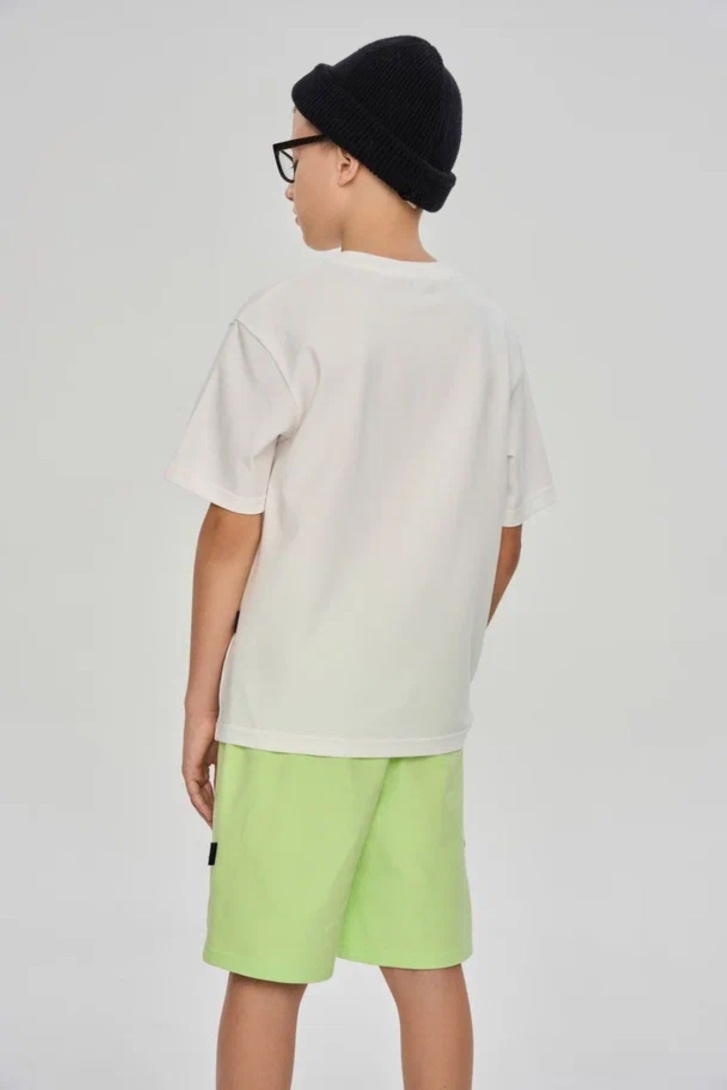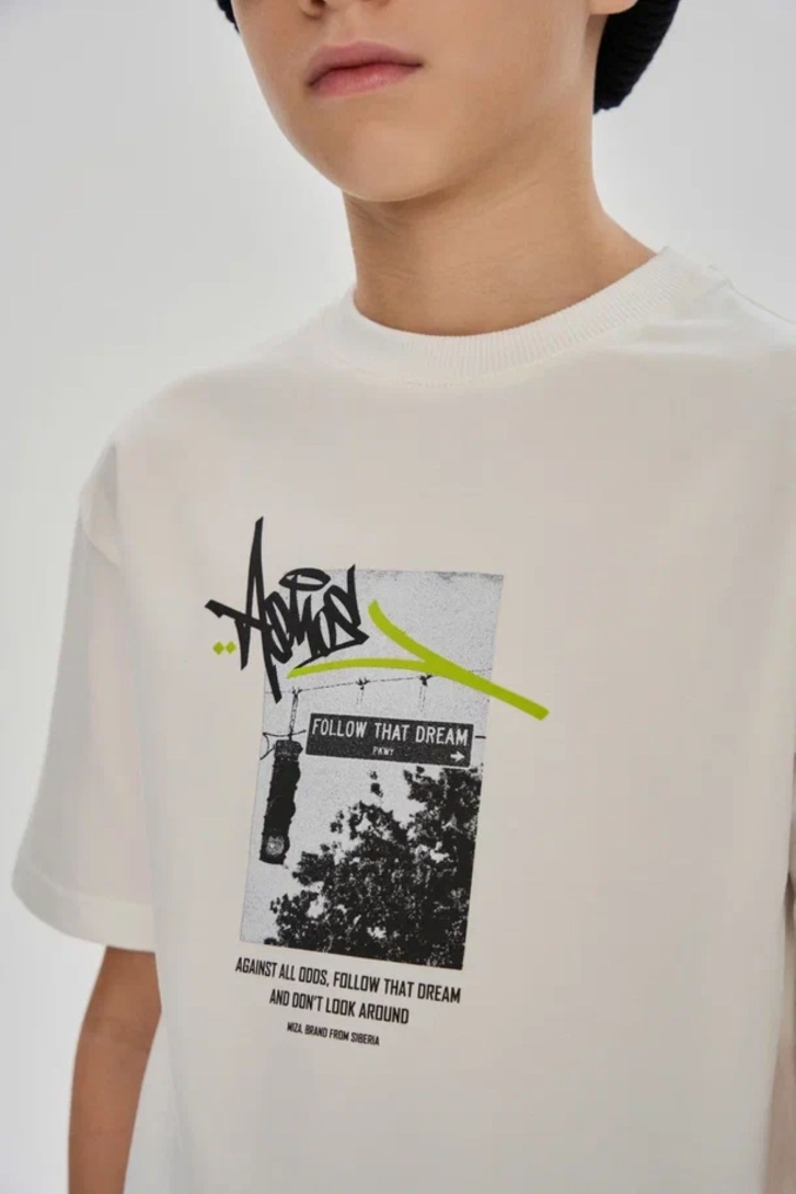 Футболка свободного прямого кроя с принтом на переде. Выполнена из хлопкосодержащего эластичного трикотажа с обработкой SilkTouch. Горловина из трикотажа в мелкий рубчик.