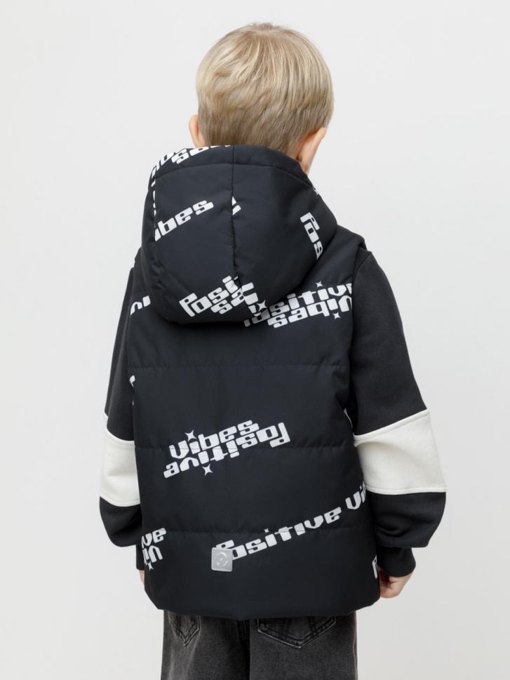 Стёганый жилет с капюшоном для мальчика с утеплителем Fellex®, 120 г/м2. Выполнен из мембранной ткани с дополнительной тефлоновой обработкой. Данный вид обработки предохраняет изделие от загрязнения и лучше отводит влагу. Подклад из 100% полиэстра. Капюшон не снимается. Изделие застёгивается на молнию, предусмотрена защита подбородка. Два кармана без застёжек. Во всех изделиях верхнего ассортимента для безопасности ребёнка предусмотрены светоотражающие элементы.