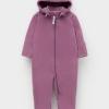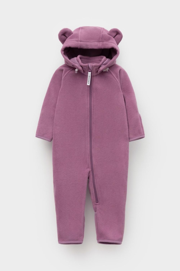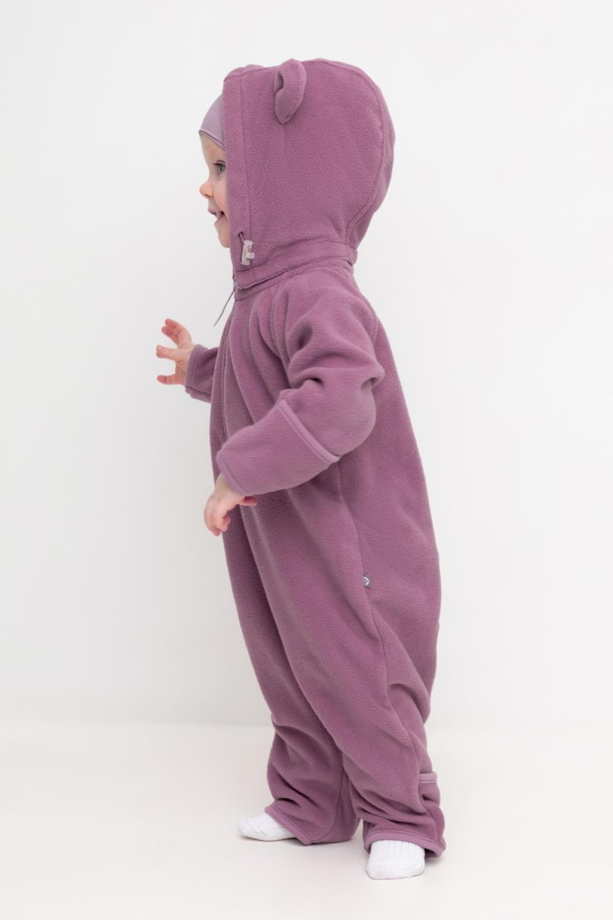 Флисовый комбинезон со съёмным капюшоном для девочки. У изделия высокий воротник и съёмный капюшон с декоративными ушками на кнопках. Застёгивается на удлинённую молнию. Предусмотрена защита шеи и подбородка. В размерах 40/62 - 48/74 на рукавах и штанинах есть удобные отвороты. Комбинезон сохраняет цвет и форму после многократных стирок.