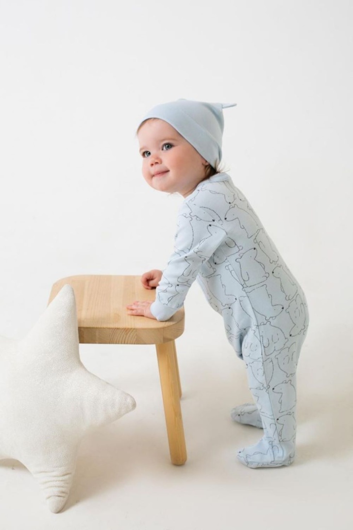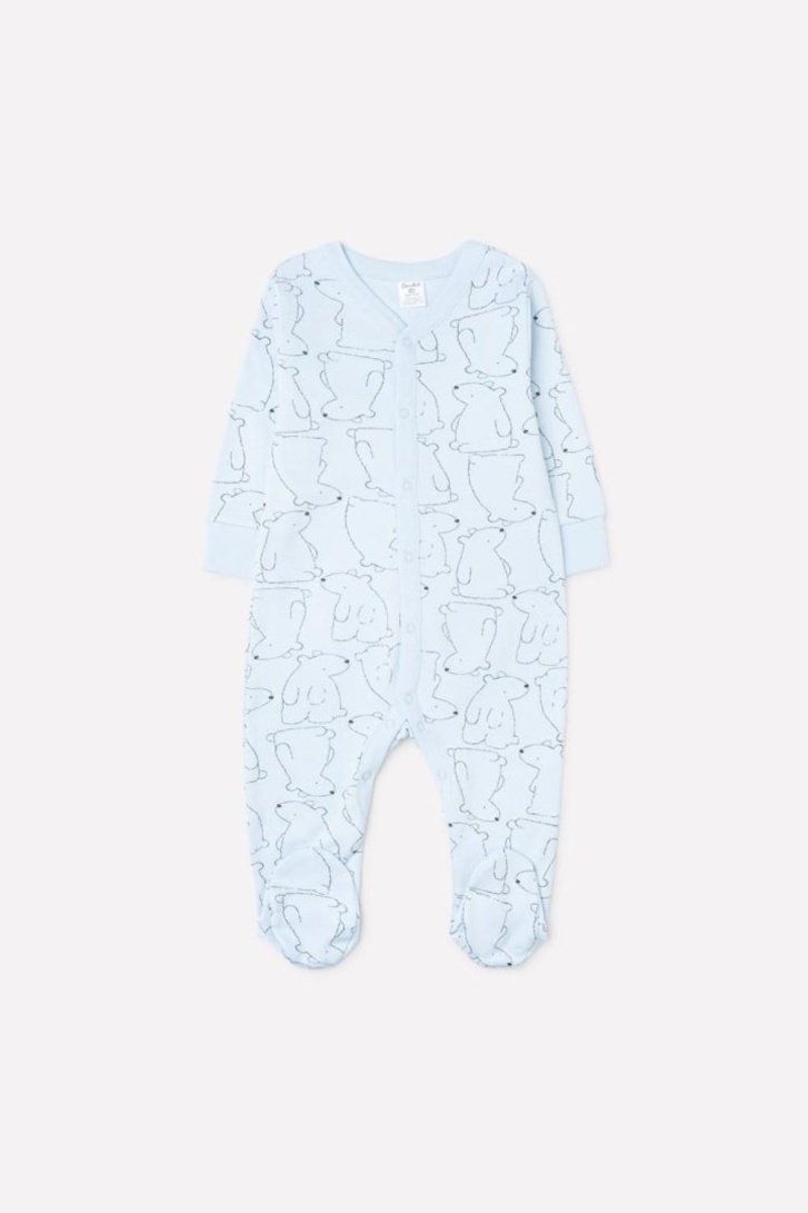 Комбинезон для мальчика из мягкого трикотажа интерлок с закрытыми ножками. Украшен набивным рисунком с изображением медвежат. Застёгивается по центру на кнопки. На рукавах - эластичные манжеты. В 56 размере есть отвороты-антицарапки.