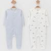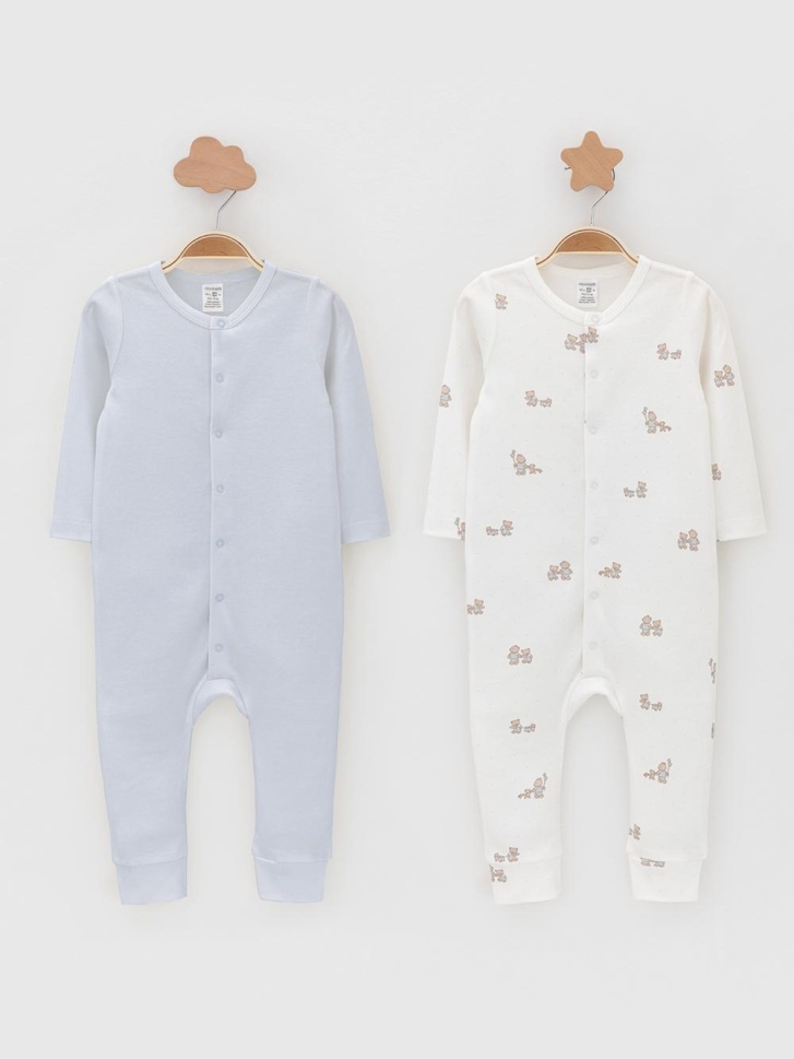 Комбинезоны для новорождённых из мягкого эластичного трикотажа, произведённого из натурального хлопка. В упаковке 2 штуки. Застёгиваются спереди на кнопки. Оригинальная набивка выполнена из стойких гипоаллергенных текстильных красителей. Все трикотажные полотна производятся в соответствии с нормами швейцарского сертификата ЭкоТекс.