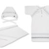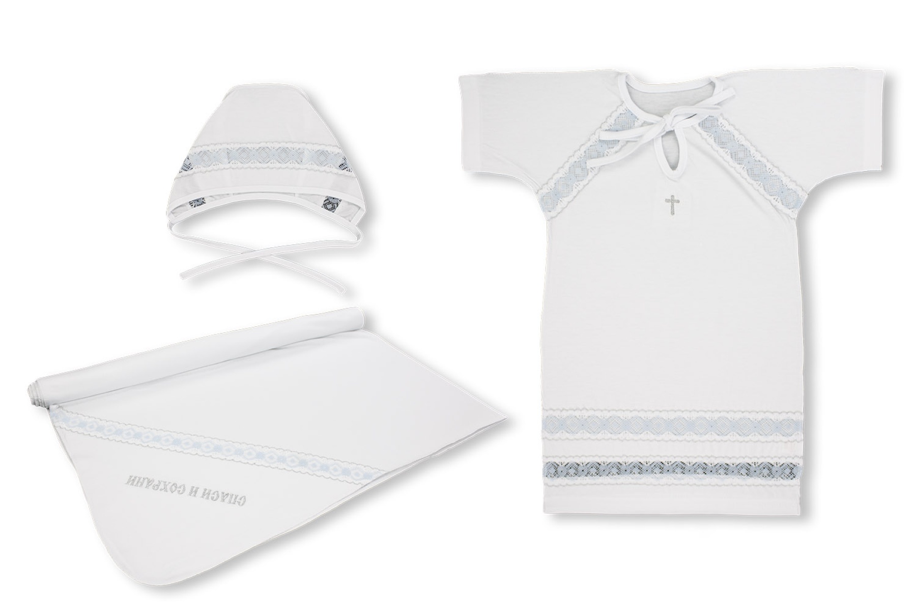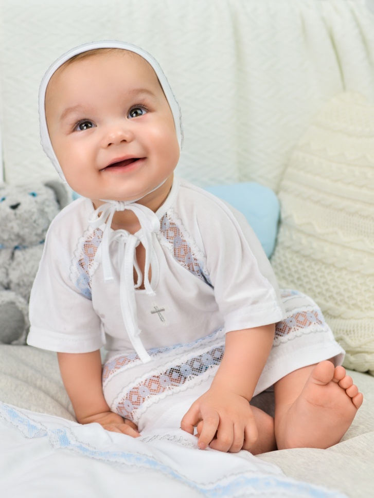 Состав 100% хлопок. Классический белый крестильный комплект для мальчика! Рубашка из 100% хлопка не стесняет движений и позволяет коже дышать. Ворот на завязках облегчает переодевание малыша. Мягкий чепчик и хлопковая пеленка с уголком сохранят ребенка в тепле во время церемонии. Вышивка серебряными нитями и трогательные детали из кружева белого и голубого цвета делают этот комплект еще более очаровательным!