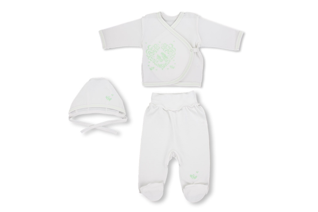 Комплект для новорожденных, состоящий из трех предметов: — шапочка на завязках — распашонка с застежкой на запах — ползунки на широком поясе Состав 100% хлопок.