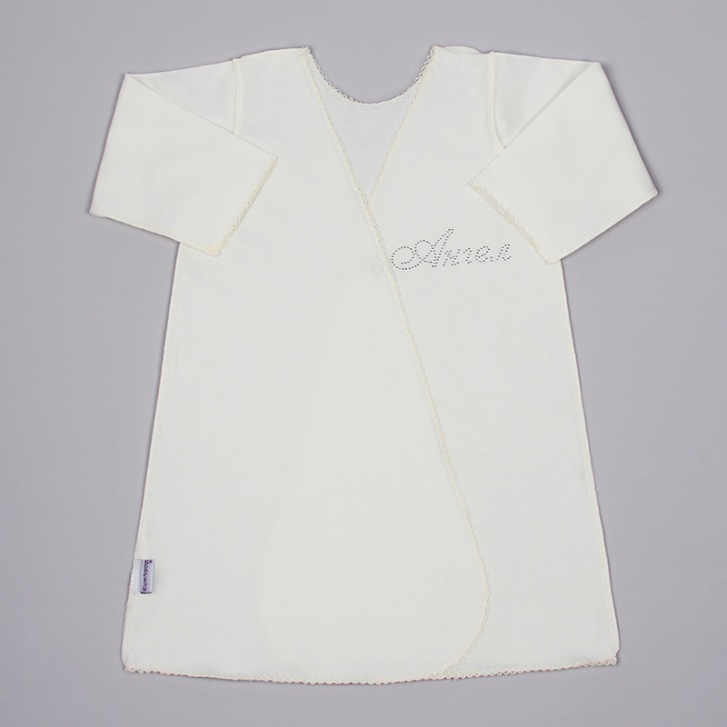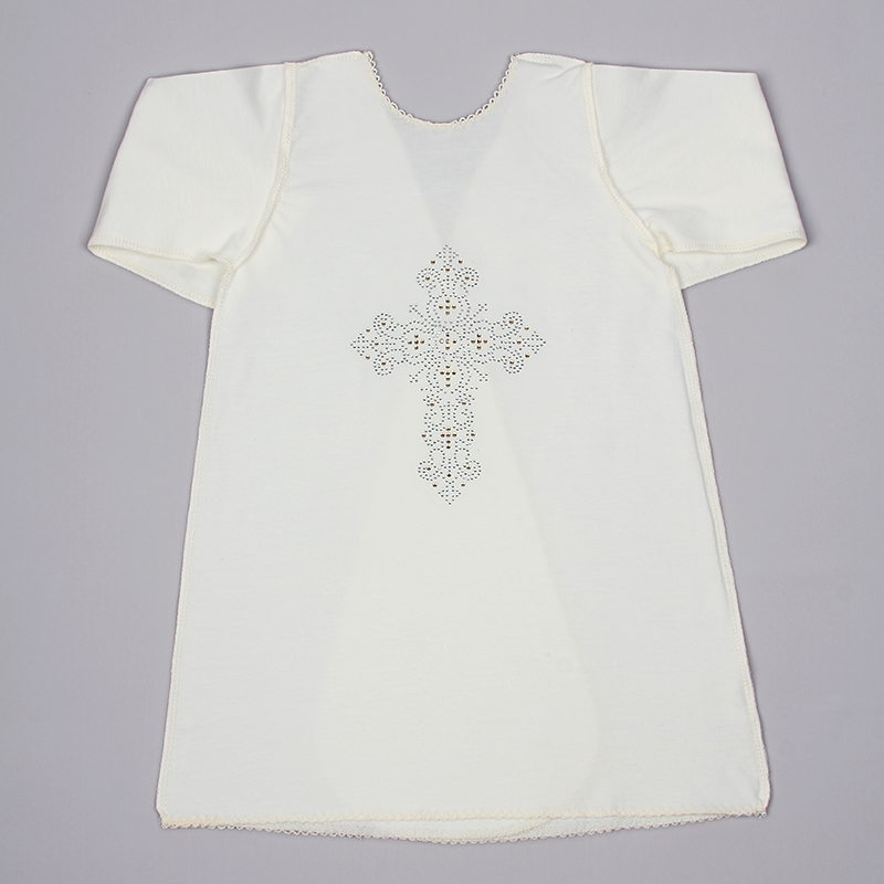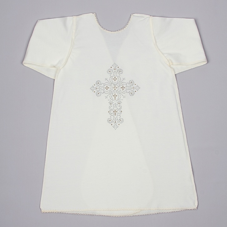 Крестильная рубашка на кнопке,с отделкой "крошет" и стразами,однотонная,трикотажная. Модель предназначена для крещения ребенка.Изделие выполнено из качественного российского трикотажа.