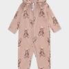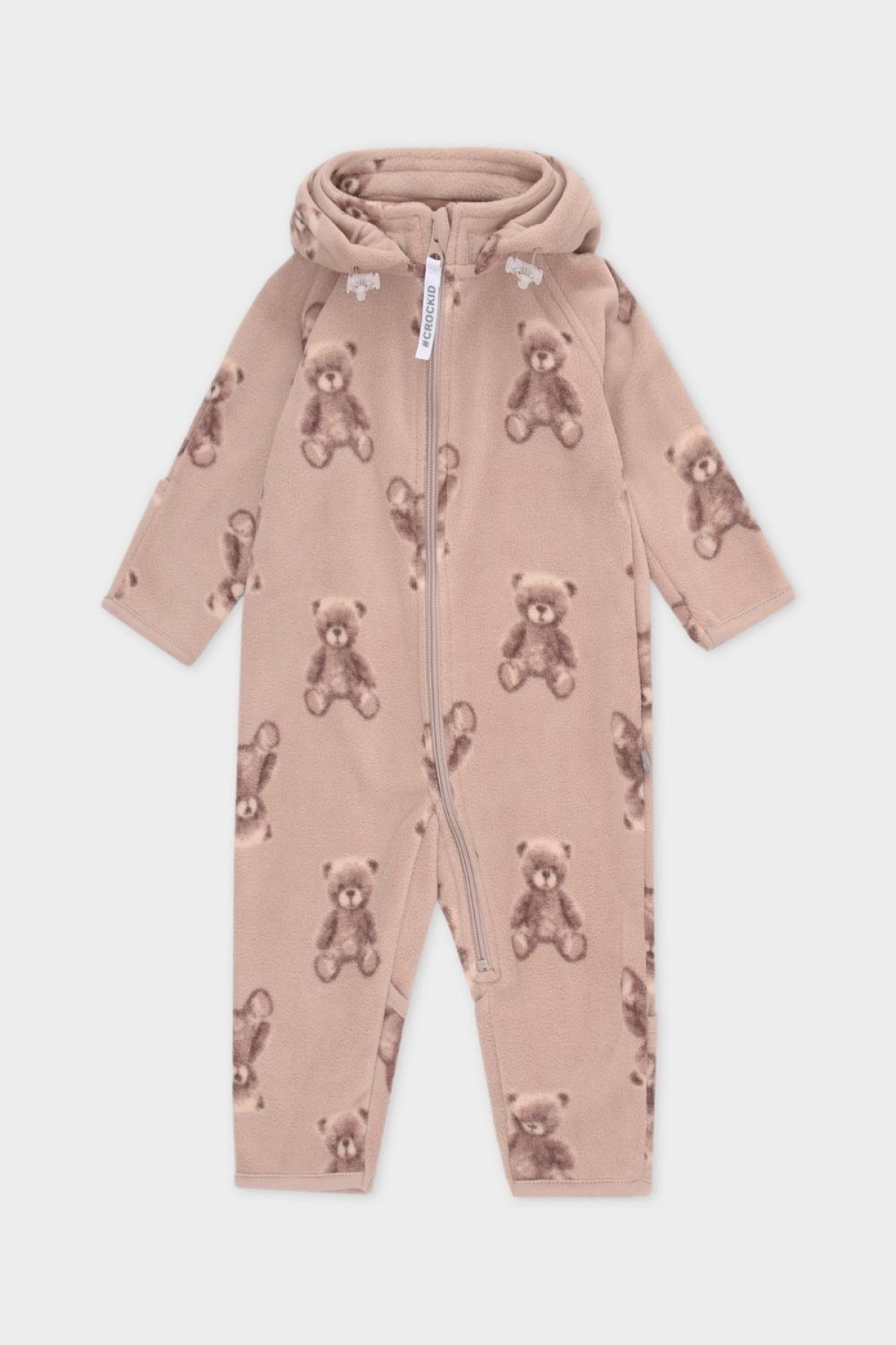 Флисовый комбинезон со съёмным капюшоном для девочки. У изделия высокий воротник и съёмный капюшон на кнопках. Застёгивается на удлинённую молнию. Предусмотрена защита шеи и подбородка. На рукавах и штанинах есть удобные отвороты. Оригинальная набивка выполнена из стойких, гипоаллергенных текстильных красителей. Комбинезон сохраняет цвет и форму после многократных стирок.
