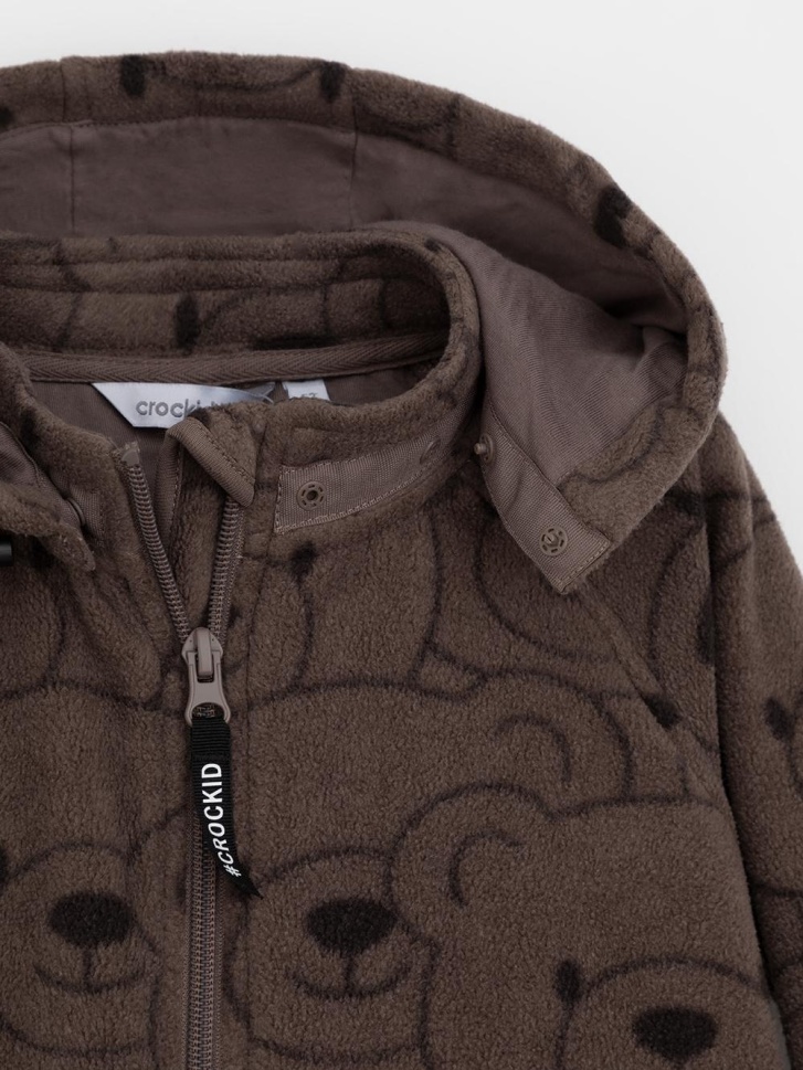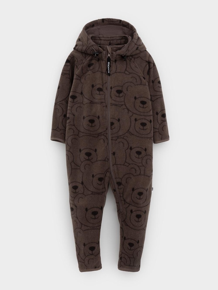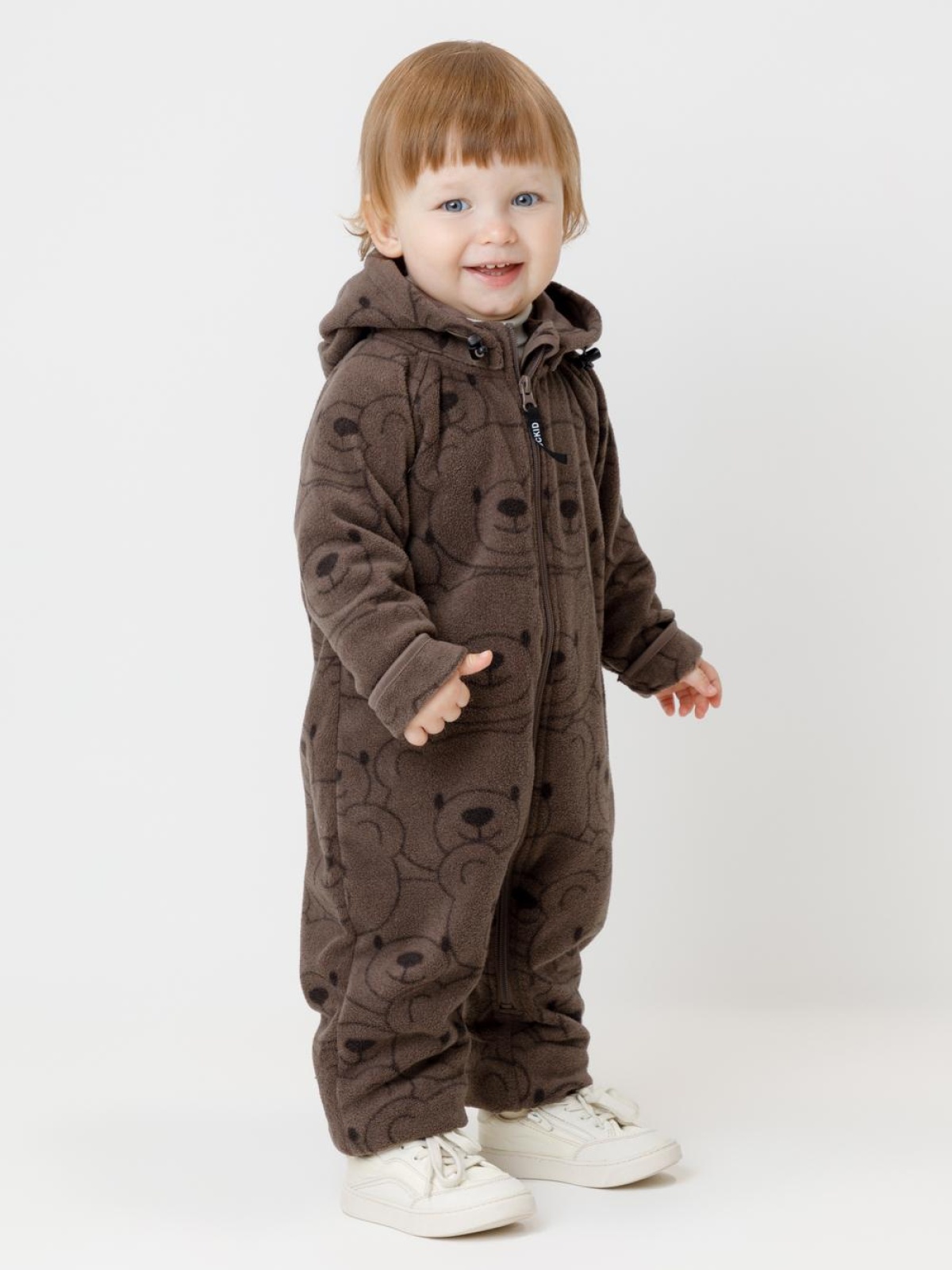 Флисовый комбинезон для мальчика со съёмным капюшоном. Капюшон регулируется по ширине с помощью эластичной утяжки со стопперами. Подклад выполнен из гладкого трикотажа супрем, произведённого из высококачественного натурального хлопка. Застёгивается на удлинённую молнию с мягкой защитой шеи и подбородка. В размерах 62, 68 и 74 на рукавах и ножках есть отвороты. Оригинальная набивка выполнена из стойких гипоаллергенных текстильных красителей. Комбинезон сохраняет цвет и форму после многократных стирок.
