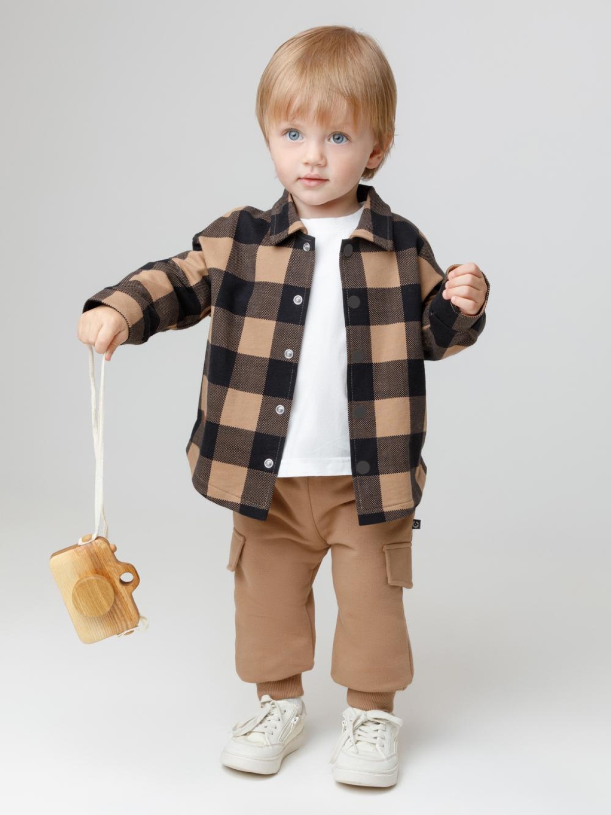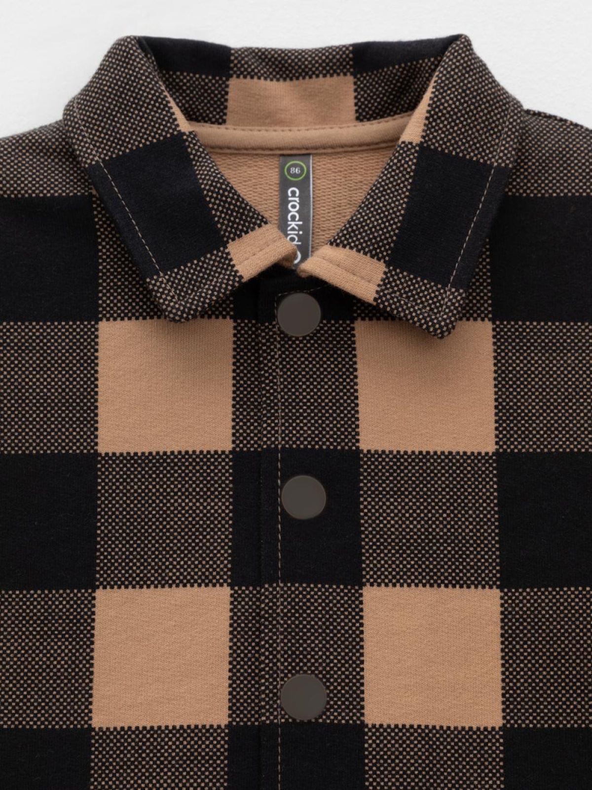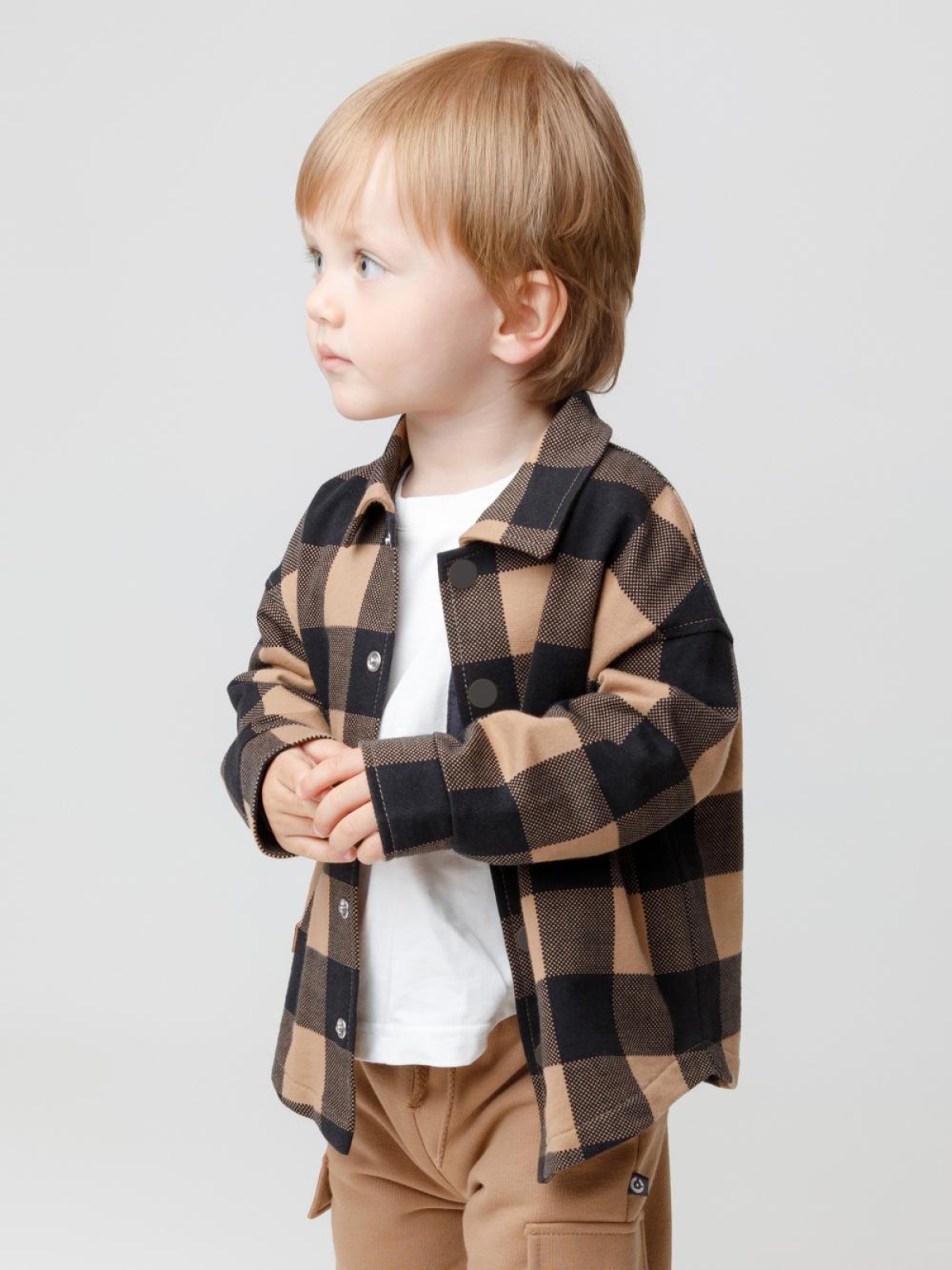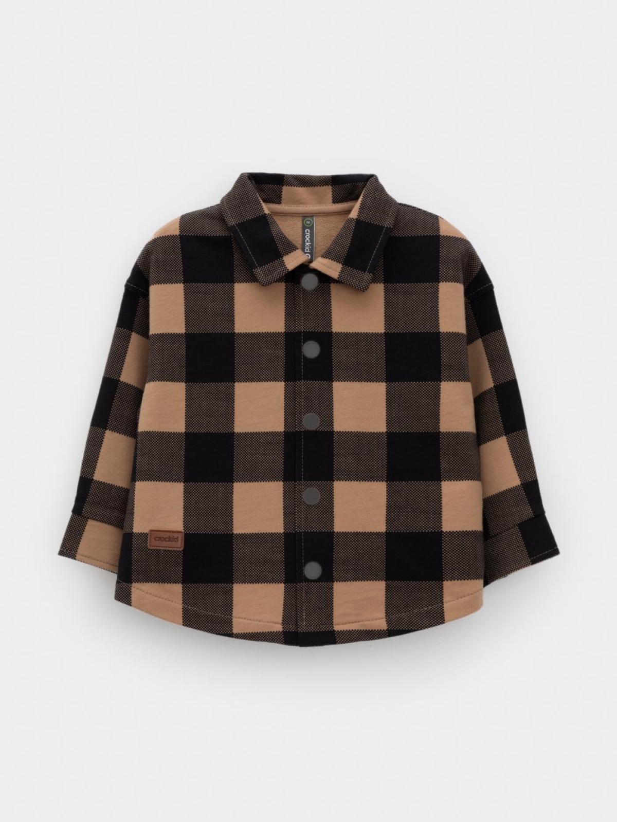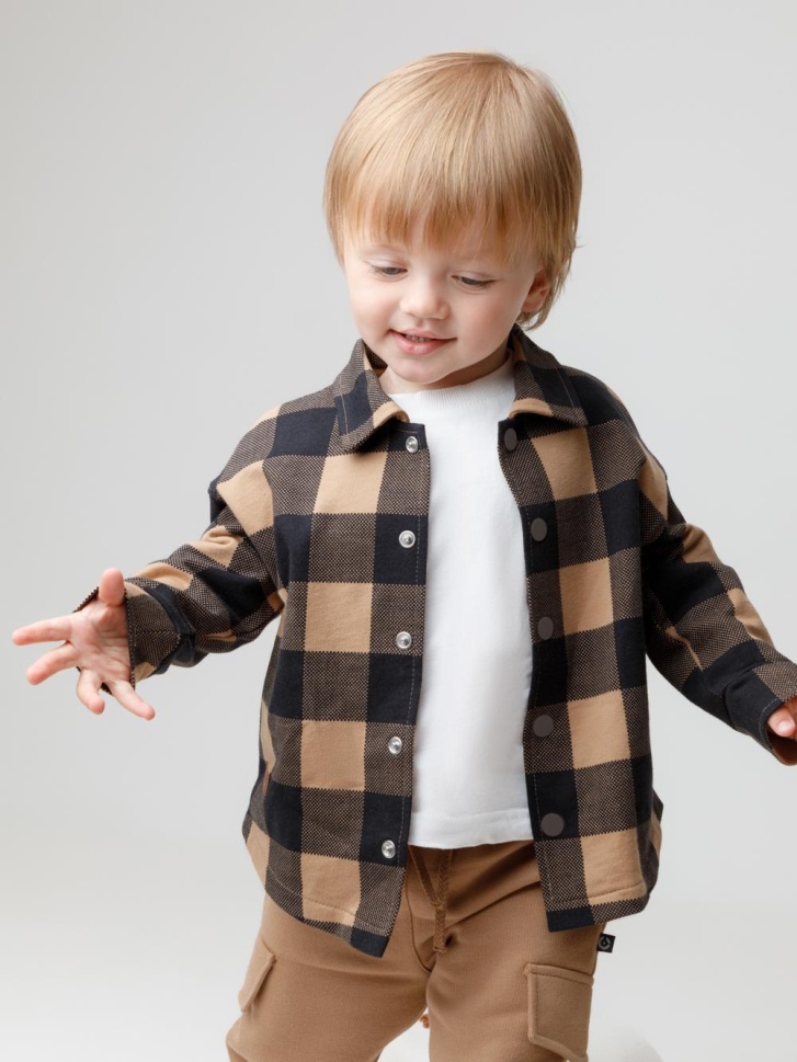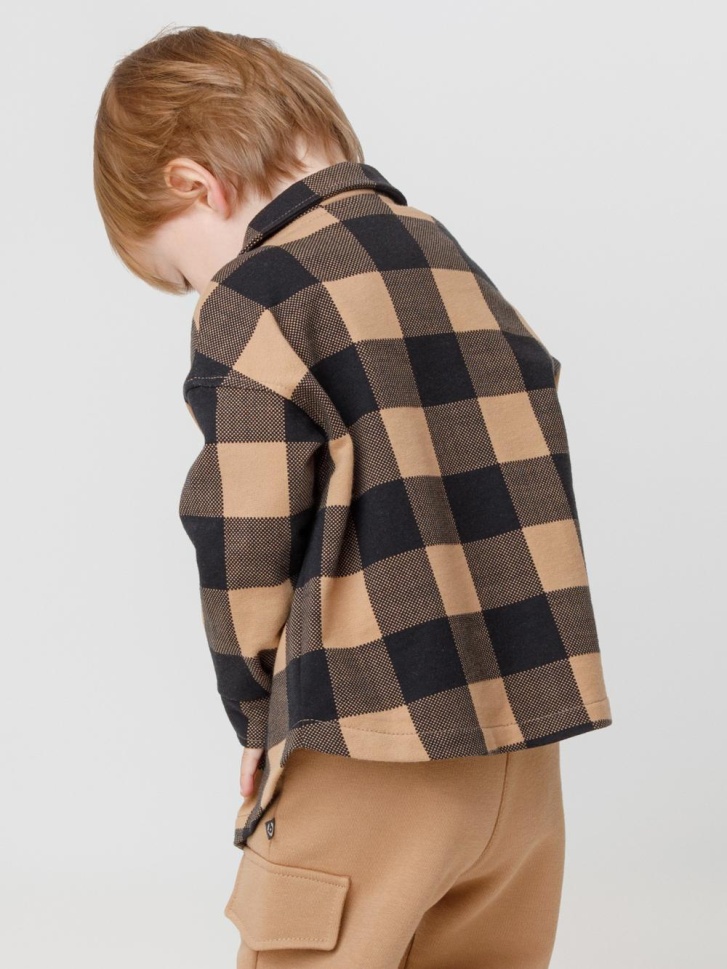Свободная трикотажная рубашка для мальчика из мягкого петельчатого футера. Застёгивается на кнопки. Модель с закругленным низом и спущенным плечом. Рисунок в клетку выполнен из стойких текстильных гипоаллергенных красителей. Изделие сохраняет цвет и форму после многократных стирок. Все трикотажные полотна производятся в соответствии с нормами швейцарского сертификата ЭкоТекс.