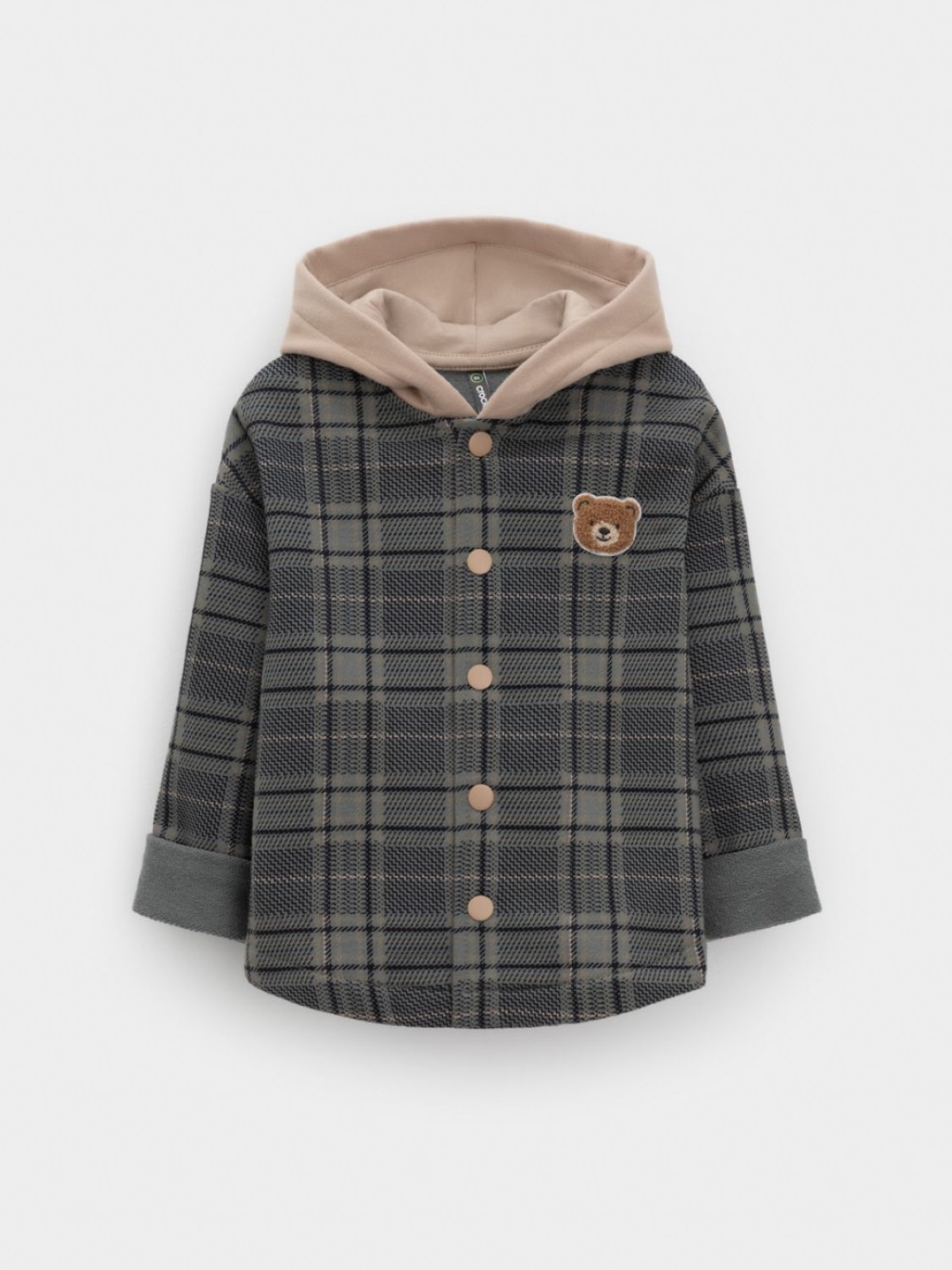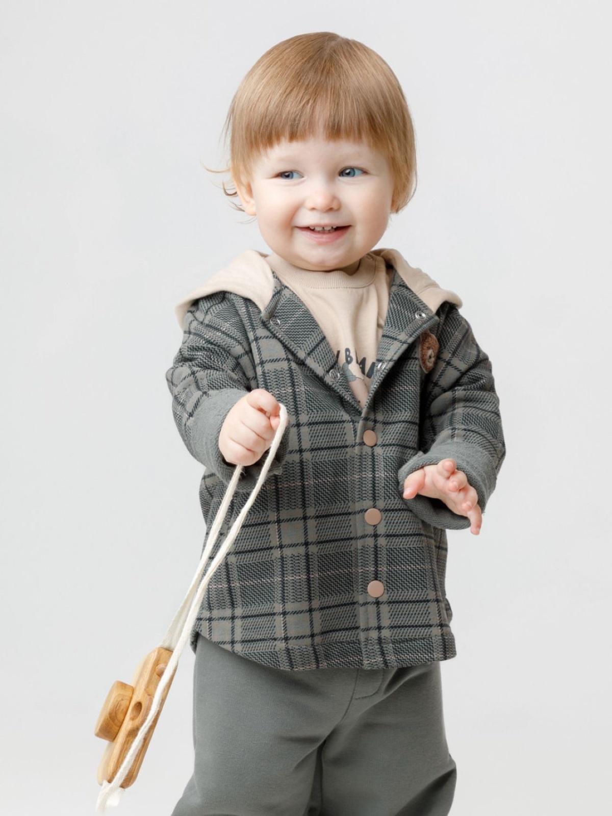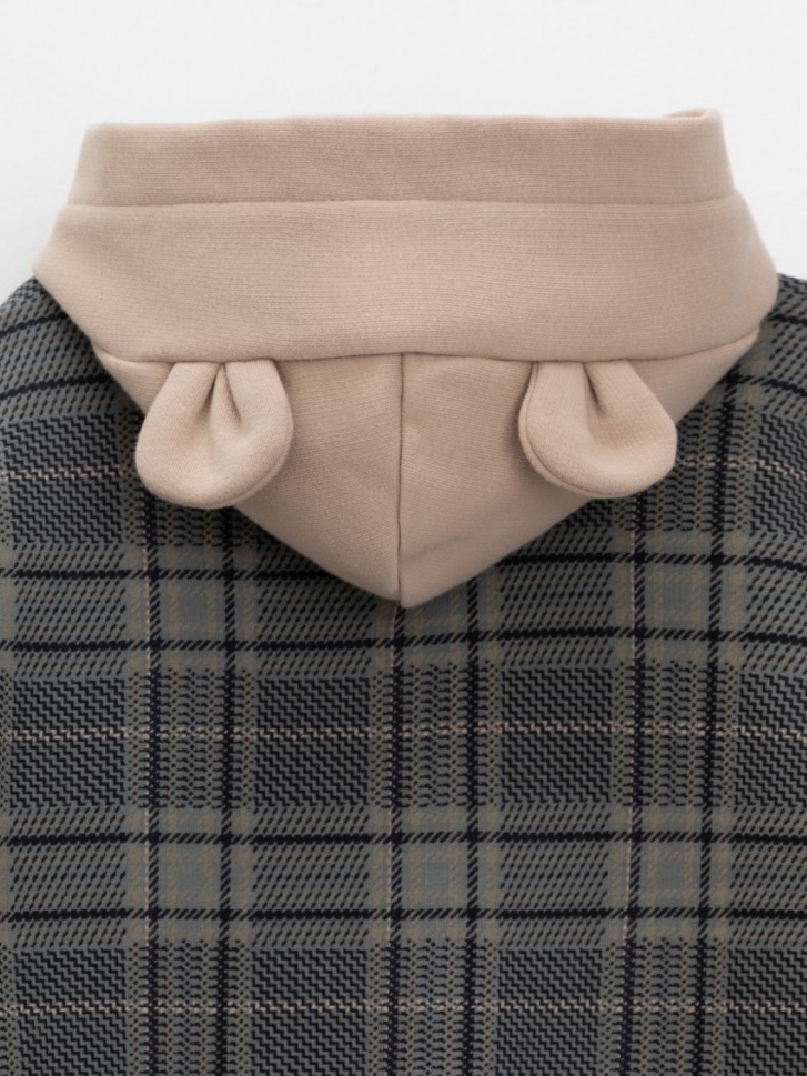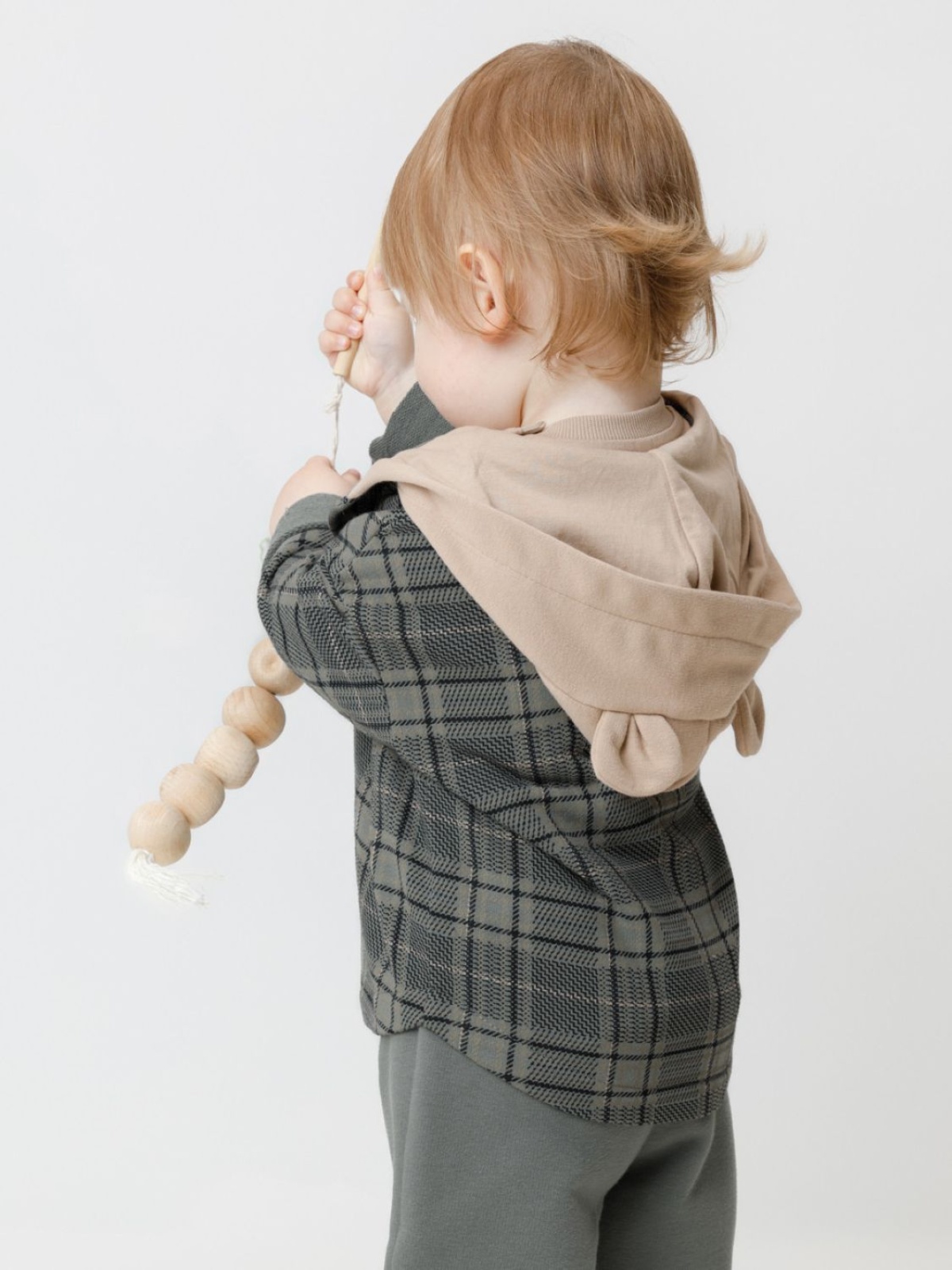 Свободная трикотажная рубашка для мальчика из мягкого петельчатого футера трёхнитки. В составе 80% натурального хлопка и 20% полиэстера, при этом полиэстер ввязан внутрь по особой технологии и не соприкасается с кожей. Застёгивается на кнопки. Модель с капюшоном и декоративными ушками. Рисунок в клетку выполнен из стойких текстильных гипоаллергенных красителей. Изделие сохраняет цвет и форму после многократных стирок. Все трикотажные полотна производятся в соответствии с нормами швейцарского сертификата ЭкоТекс.